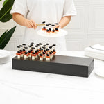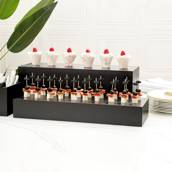 Make your treats the main focus of any event with our Cater Tek Rectangle Black Bamboo Short Riser. This wood display riser expertly draws attention to your hors d'oeuvres, samples, appetizers, desserts, featured dishes, and other non-food items. Designed in a rectangular shape, this tabletop display riser presents your products linearly for a neat and clutter-free presentation. Equipped with 4 built-in sides, this bamboo riser steadily supports your treats to always keep them as the main focus on your table. Crafted from durable bamboo, this display riser is chip-resistant and shatterproof for long-lasting commercial use and maintain its high-quality look. The bamboo's natural wood grain accentuates your presentations with rustic flair. This rectangular riser will beautifully complement any restaurant, bakery, catering event, buffet, or party. This catering food display stand measures 20.5 inches in length by 7 inches in width by 3.25 inches in height. Sold in a 1 count box.