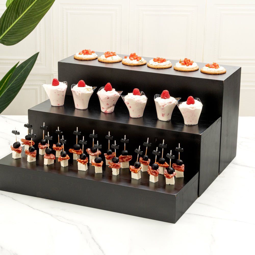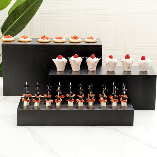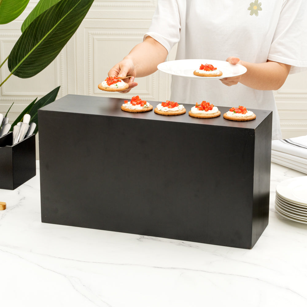 Your displays will rise above the rest with our Cater Tek Rectangle Black Bamboo Tall Riser. This wood display riser presents your desserts, appetizers, samples, hor d' oeuvres, and featured dishes at an elevated height to spark the interest of all your customers. The rectangular design of this table display riser is perfect for arranging your dishes in rows to display variety. Equipped with 4 sturdy sides, this rectangle riser stands high to showcase your featured products and attract customers. Constructed from durable bamboo, this display riser is shatterproof and chip-resistant, perfect for consistent use in a candy shop, bakery, buffet, catering service, or restaurant. The black finish on the natural wood grain pattern of this buffet food display stand adds a sophisticated charm to your presentations. This catering display riser measures 20.5 inches in length by 7 inches in width by 11 inches in height. Sold in a 1 count box.
