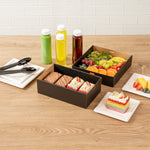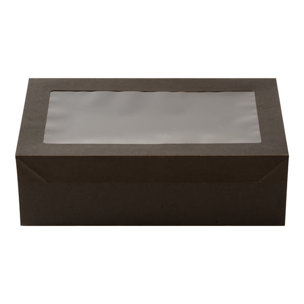 Offer a glimpse of enticing goodies with our Cater Tek Rectangle Black Paper Catering Boxes. Designed to securely accommodate catered orders, grazing platters, or confections, these rectangular paper catering boxes feature insert tab locks for added protection. Grease-resistant in nature, these catering boxes prevent messy oils from seeping through. Furnished with window lids, these food catering containers facilitate easy order identification for both employees and clients, thereby avoiding confusion. The black shade of these catering boxes with window lids exudes a rustic charm while maintaining durability. Shipped flat for delivery, these cardboard catering boxes require simple assembly, optimizing your packaging efficiency. Emphasizing eco-friendly practices, these windowed food boxes are recyclable. With dimensions of 10.25 inches in length by 6 inches in width by 3.25 inches in height, these cardboard catering boxes are perfect for packing a variety of snacks or delights. Sold in a 10 count box.