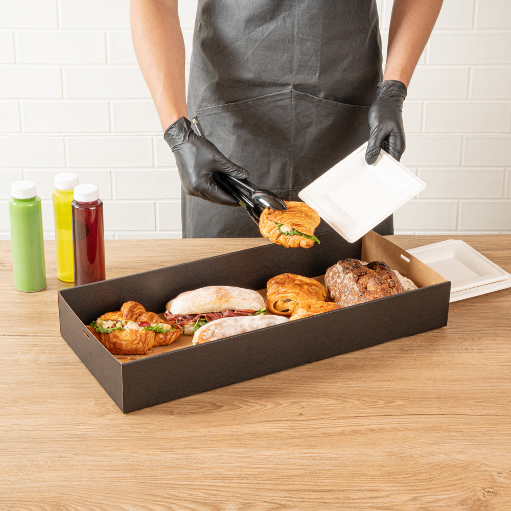Present your catered dishes distinctly with our Cater Tek Rectangle Black Paper Catering Boxes. Outfitted with securing tab locks, these catering boxes offer a robust solution to safeguard on-the-move meals. These catering food receptacles are engineered to resist grease, effectively halting any messy oil leaks. Crafted from durable paper, the lidded catering boxes can take on an assortment of food items with ease. These cardboard catering boxes, adorned with lids that have a transparent window, allow a peek into the items while keeping them tidily packed away. For hassle-free packaging, these windowed catering boxes arrive flat for storage efficiency and can be assembled swiftly. To facilitate a swift and environmentally-conscious clean-up, these black paper catering boxes are recyclable. Measuring 22.25 inches in length by 10 inches in width by 3.25 inches in height, these windowed catering boxes make an ideal choice for catered meals or abundant grazing boxes. Sold in a 100 count box.