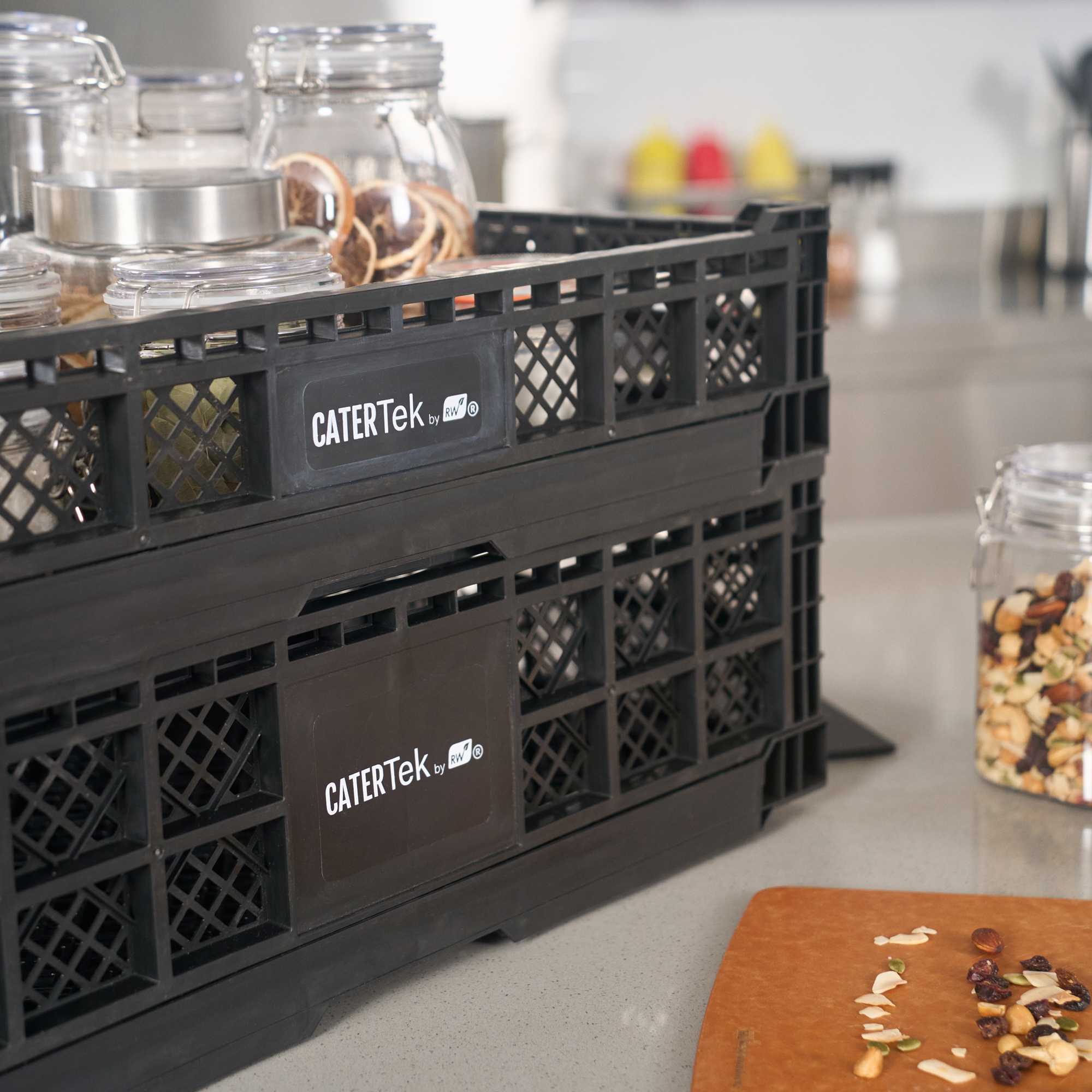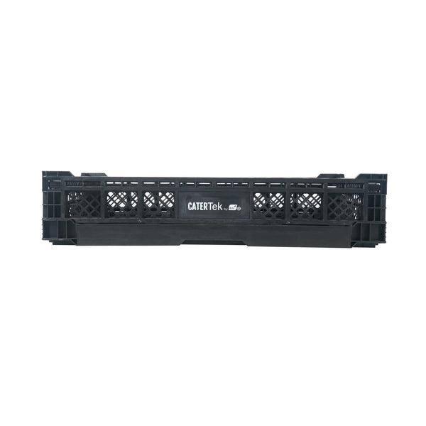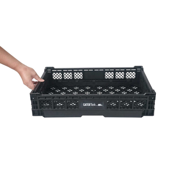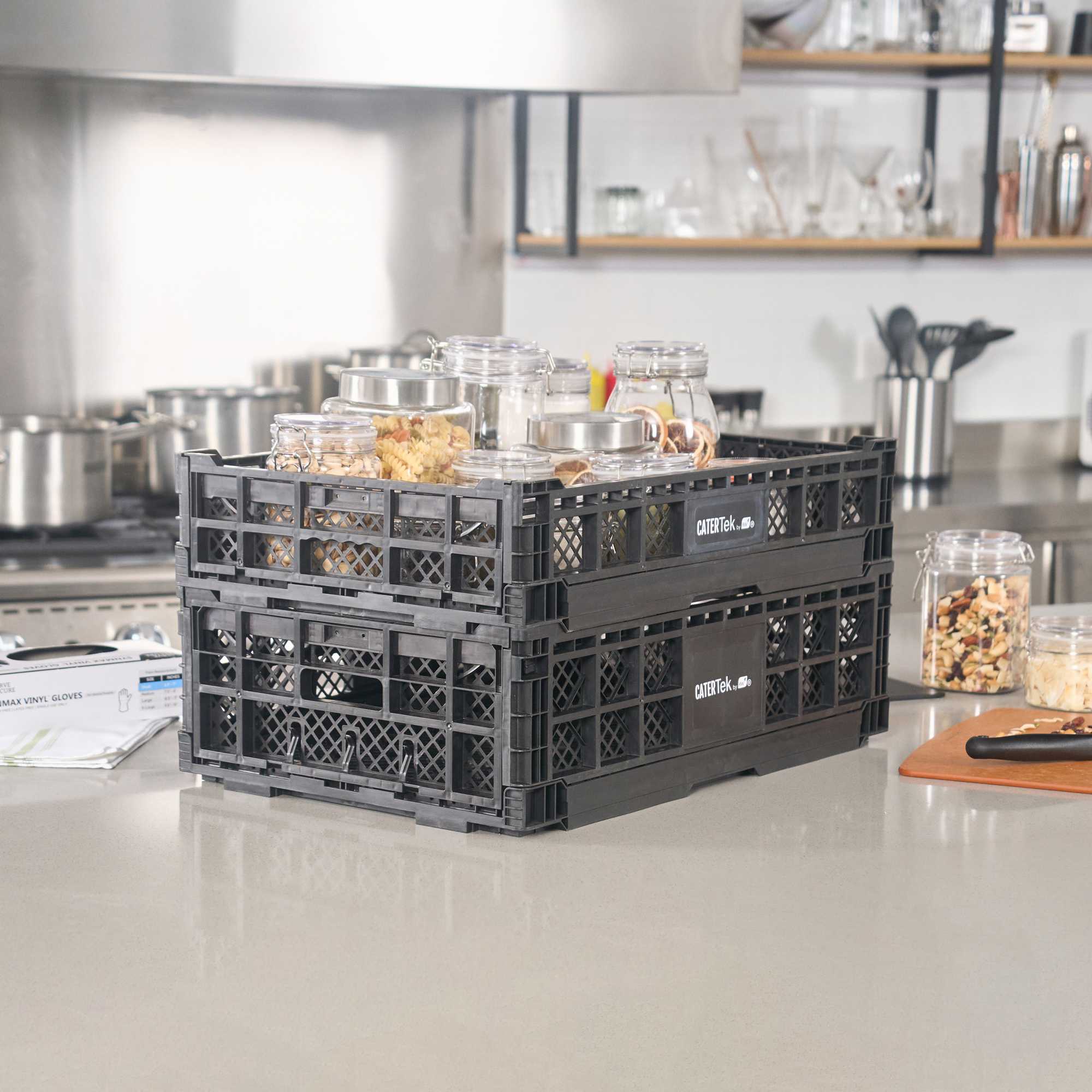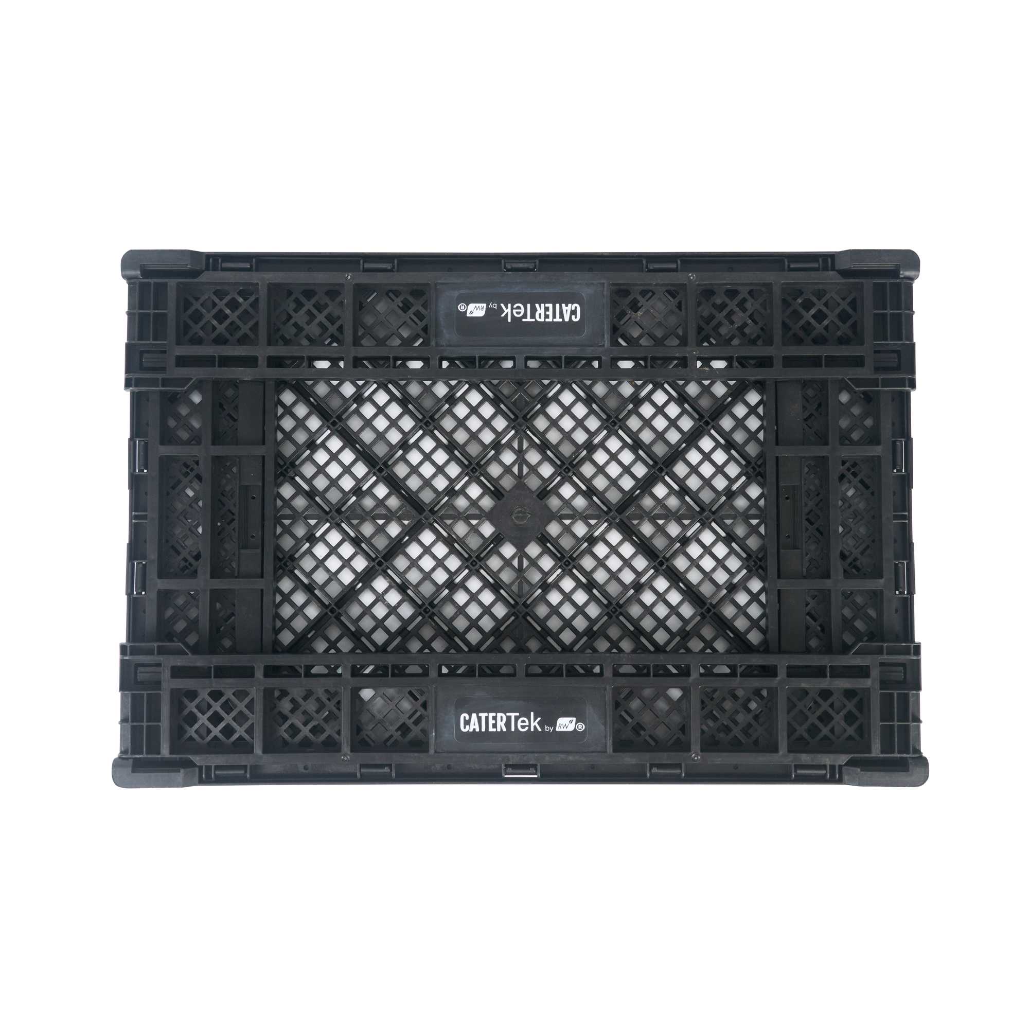 Optimize your storage with our space-saving solution. The Cater Tek Black Collapsible Crate features a durable polypropylene construction that withstands heavy-duty use, making it the ideal plastic storage crate for foodservice environments. Its vented sides ensure improved airflow, keeping contents fresh and preventing moisture build-up—a key advantage for maintaining produce. Equipped with a locking device, this vented plastic crate secures contents during transport, reducing the risk of spills and ensuring peace of mind. Measuring 23.6 inches in length by 15.7 inches in width by 4.7 inches in height, this collapsible crate is perfect for maximizing space in grocery stores or warehouses, as it folds flat when not in use for efficient storage. Make the most of your storage areas and streamline your operations with this versatile crate. Each order includes 1 Cater Tek Black Collapsible Crate.
