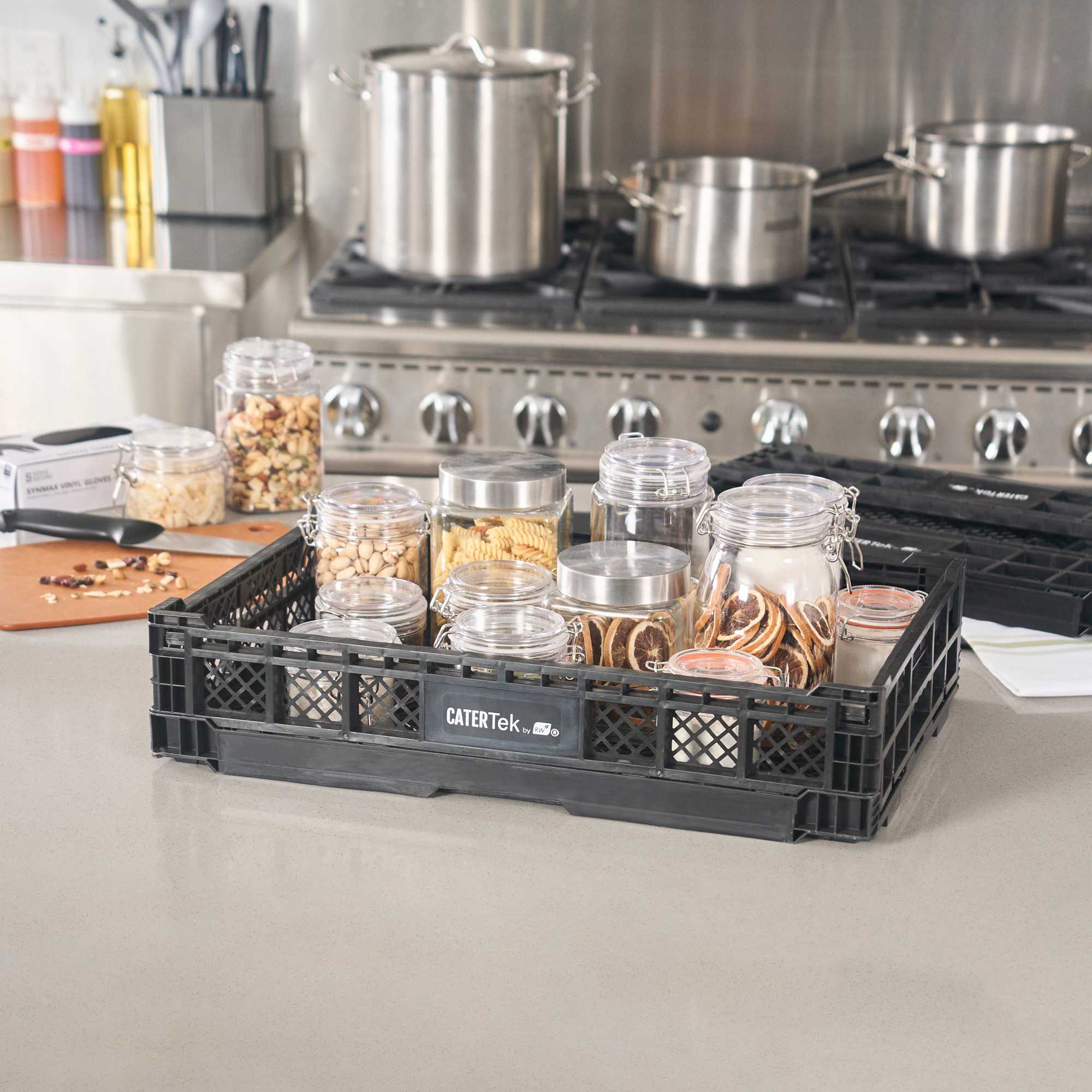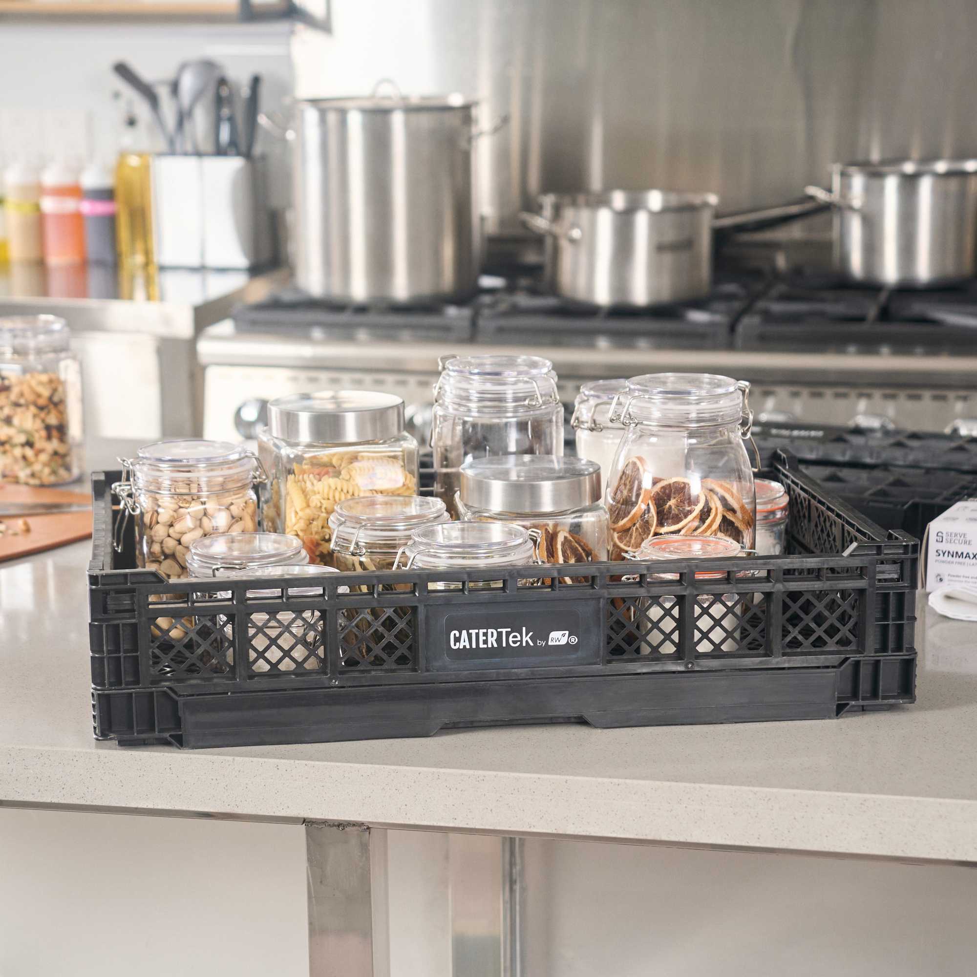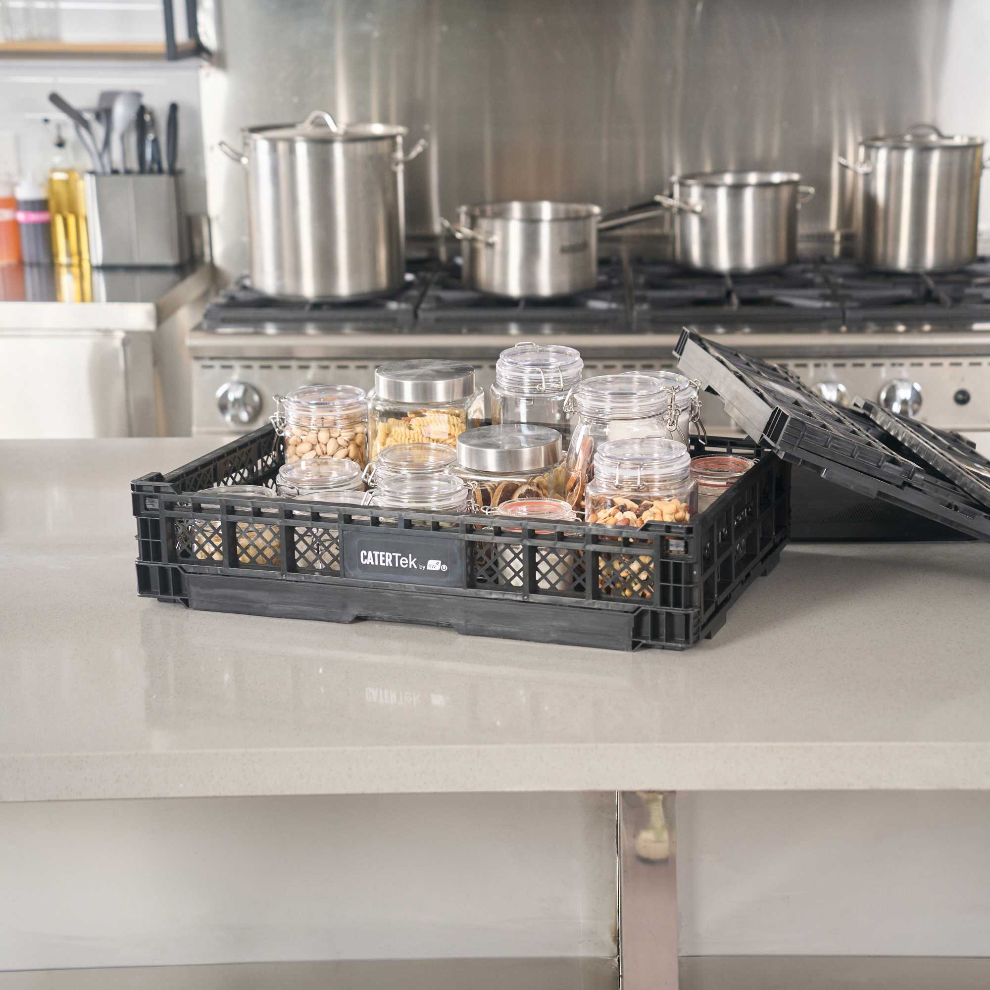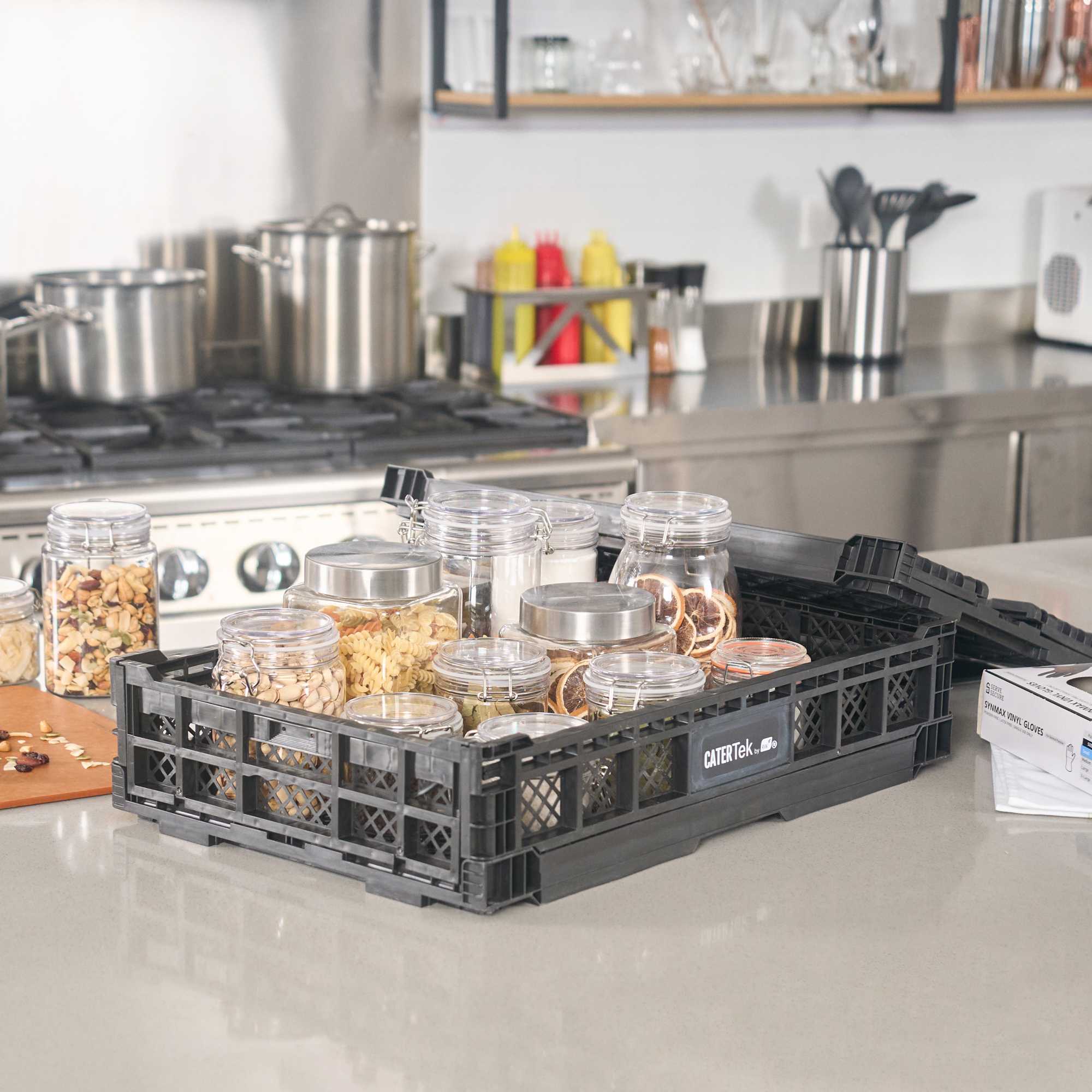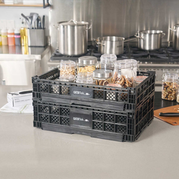 Optimize your storage with our space-saving solution. The Cater Tek Black Collapsible Crate features a durable polypropylene construction that withstands heavy-duty use, making it the ideal plastic storage crate for foodservice environments. Its vented sides ensure improved airflow, keeping contents fresh and preventing moisture build-up—a key advantage for maintaining produce. Equipped with a locking device, this vented plastic crate secures contents during transport, reducing the risk of spills and ensuring peace of mind. Measuring 23.6 inches in length by 15.7 inches in width by 4.7 inches in height, this collapsible crate is perfect for maximizing space in grocery stores or warehouses, as it folds flat when not in use for efficient storage. Make the most of your storage areas and streamline your operations with this versatile crate. Each order includes 1 Cater Tek Black Collapsible Crate.