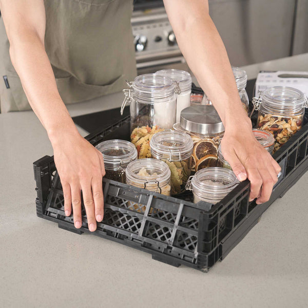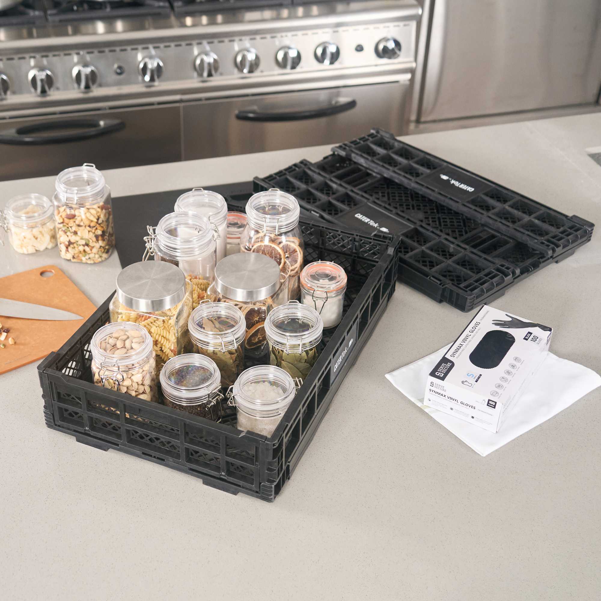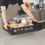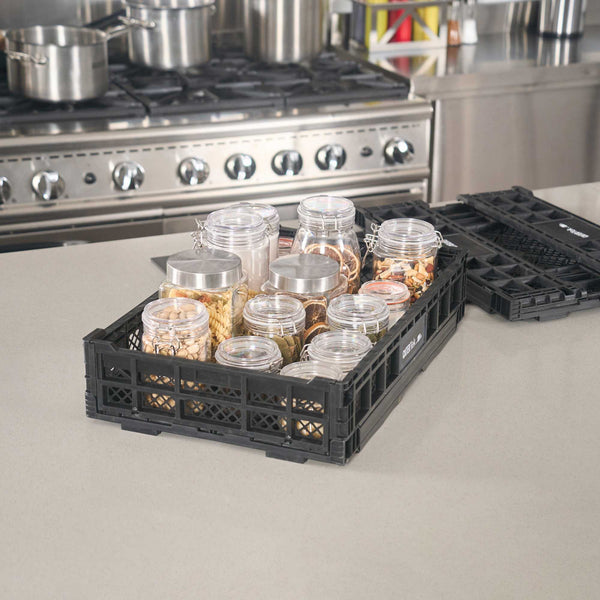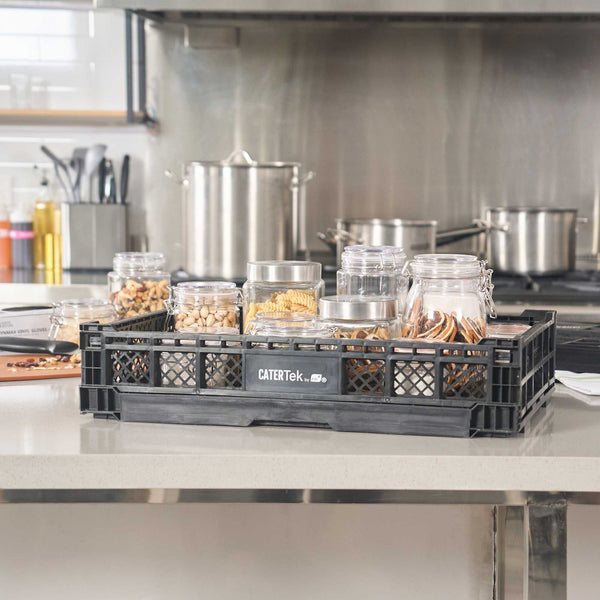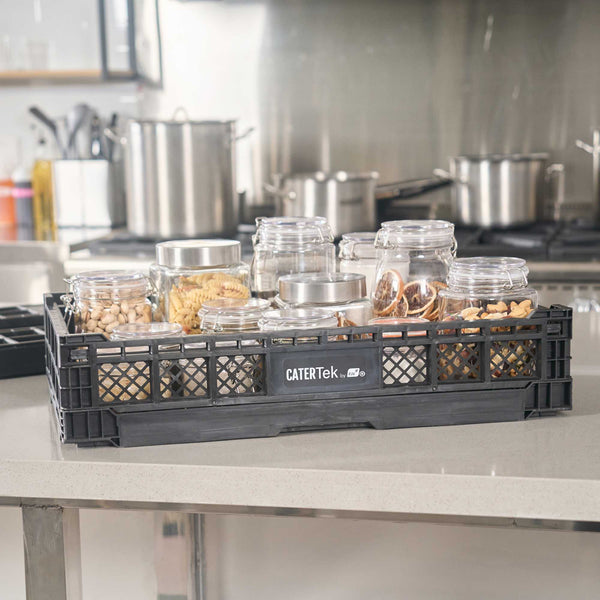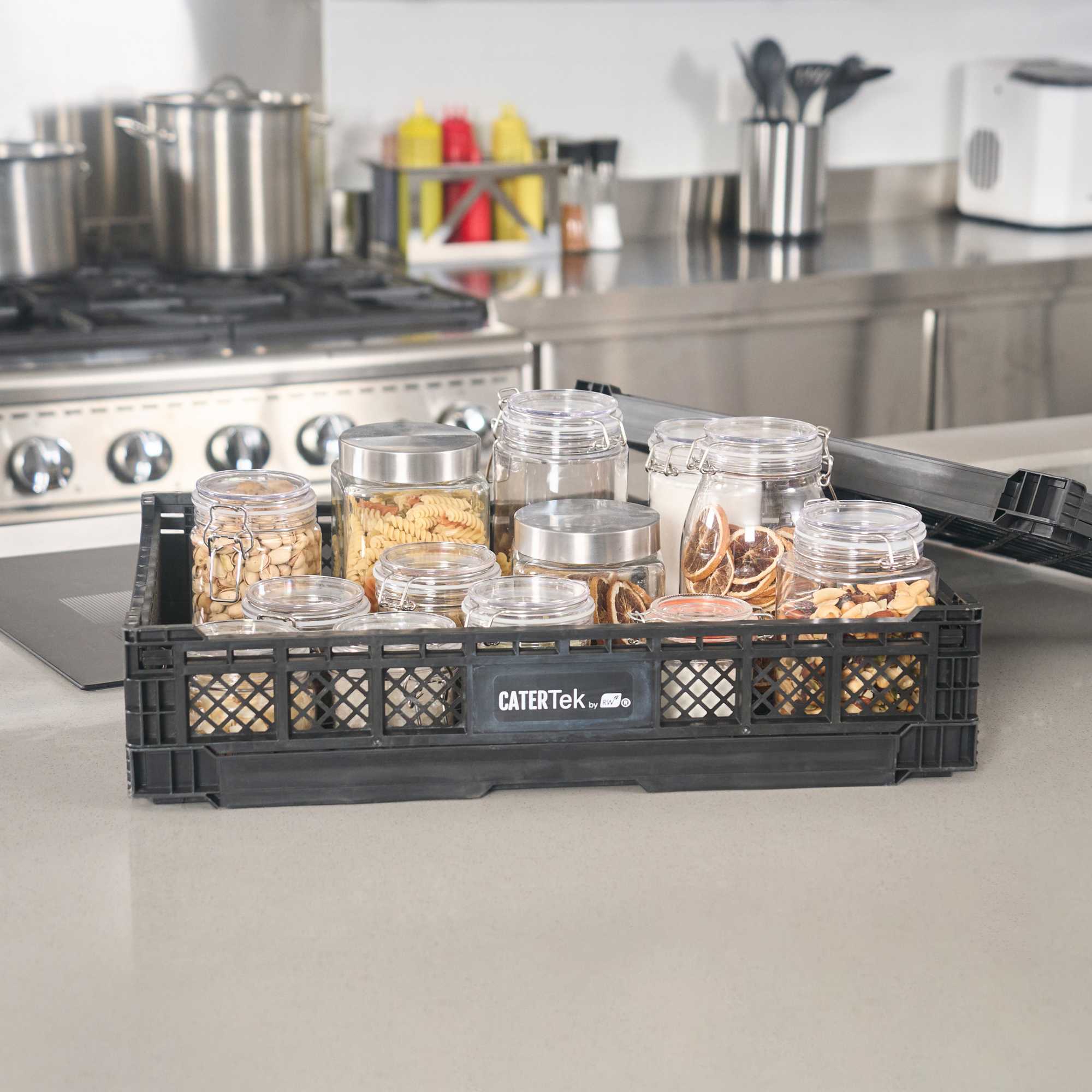 Optimize your storage with our space-saving solution. The Cater Tek Black Collapsible Crate features a durable polypropylene construction that withstands heavy-duty use, making it the ideal plastic storage crate for foodservice environments. Its vented sides ensure improved airflow, keeping contents fresh and preventing moisture build-up—a key advantage for maintaining produce. Equipped with a locking device, this vented plastic crate secures contents during transport, reducing the risk of spills and ensuring peace of mind. Measuring 23.6 inches in length by 15.7 inches in width by 4.7 inches in height, this collapsible crate is perfect for maximizing space in grocery stores or warehouses, as it folds flat when not in use for efficient storage. Make the most of your storage areas and streamline your operations with this versatile crate. Each order includes 1 Cater Tek Black Collapsible Crate.