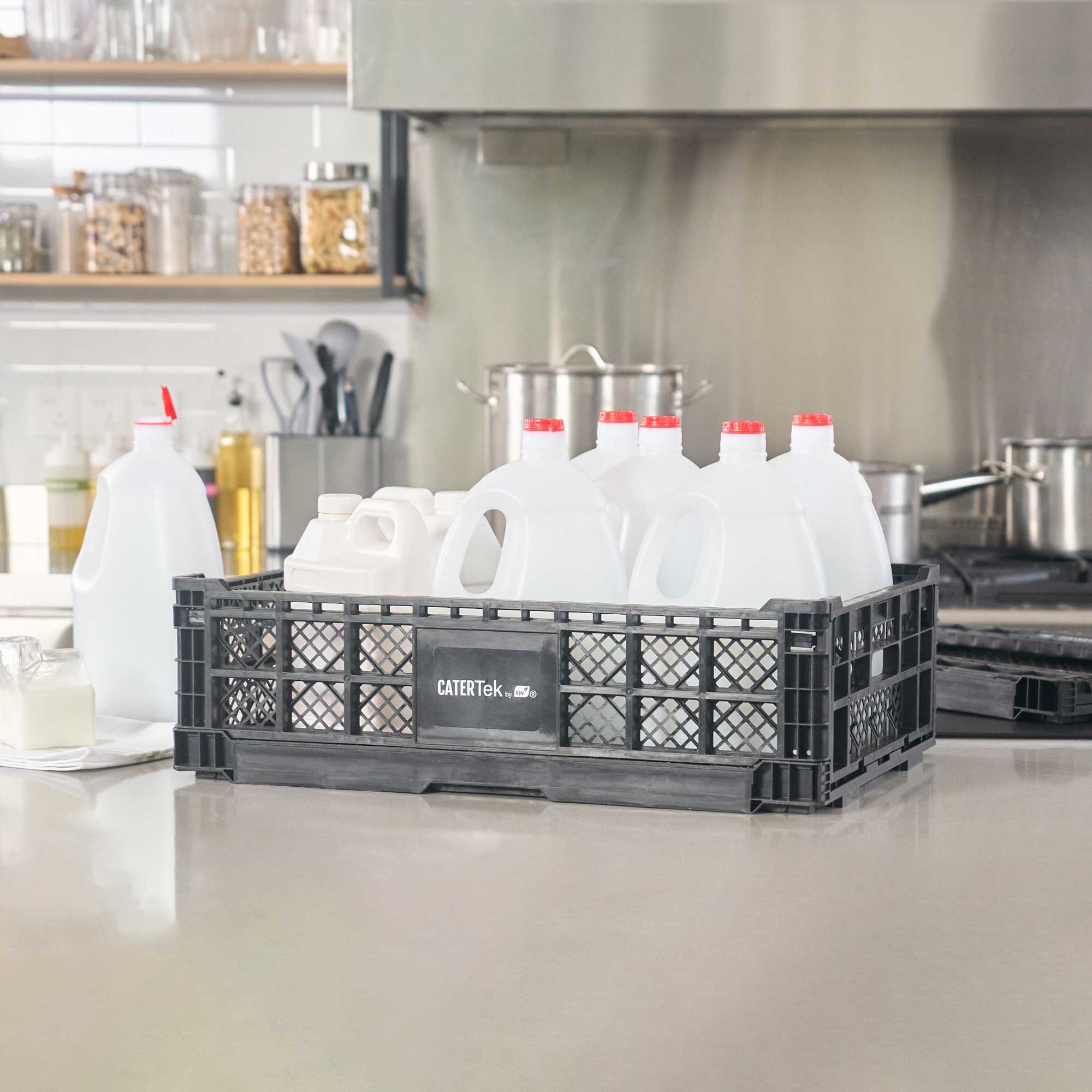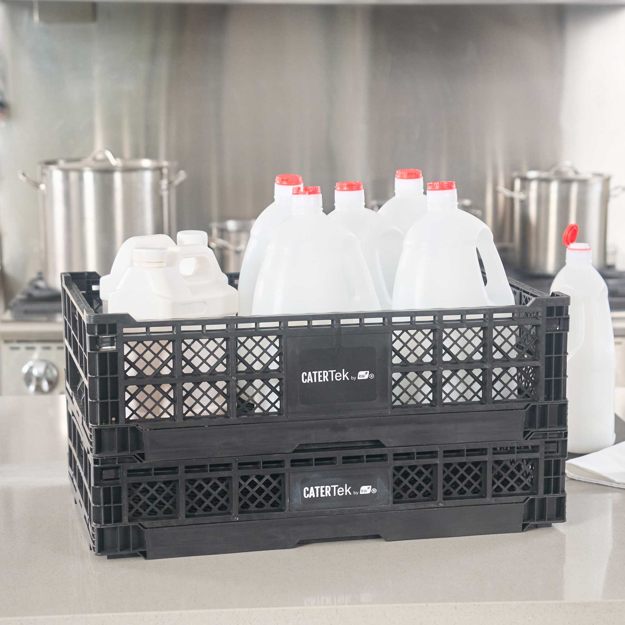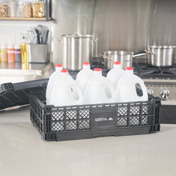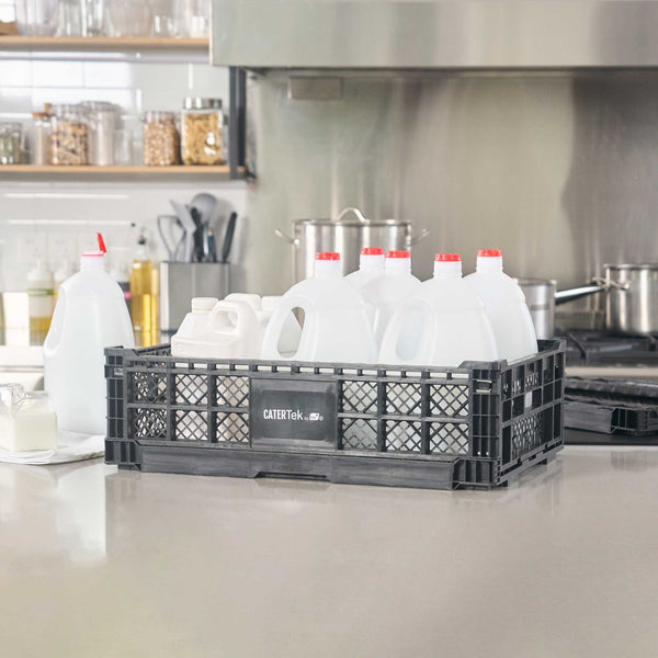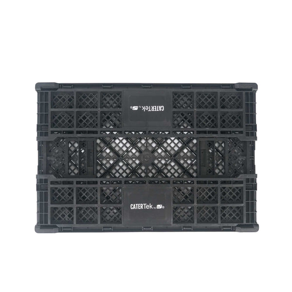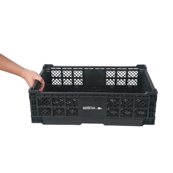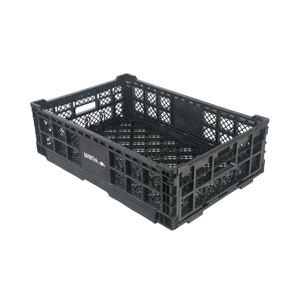 Optimize storage with versatile collapsible storage solutions. The Cater Tek Black Plastic Collapsible Storage Bin provides durable polypropylene construction, offering reliable support for heavy loads and ensuring long-lasting usability in foodservice environments. With a stackable storage crate design, these bins facilitate efficient kitchen organization, maximizing limited space. The vented plastic crate features vented sides, promoting airflow that keeps produce fresh for longer periods, a critical advantage for maintaining the quality of fresh ingredients. Its collapsible design saves space in storage and transport, making it an ideal choice for catering businesses looking to streamline operations. Measuring 23.6 inches in length by 15.7 inches in width by 6.6 inches in height, this bin is perfectly suited for grocery store produce racks to display bulk items effectively. Each order includes 10 Cater Tek Black Plastic Collapsible Storage Bins.