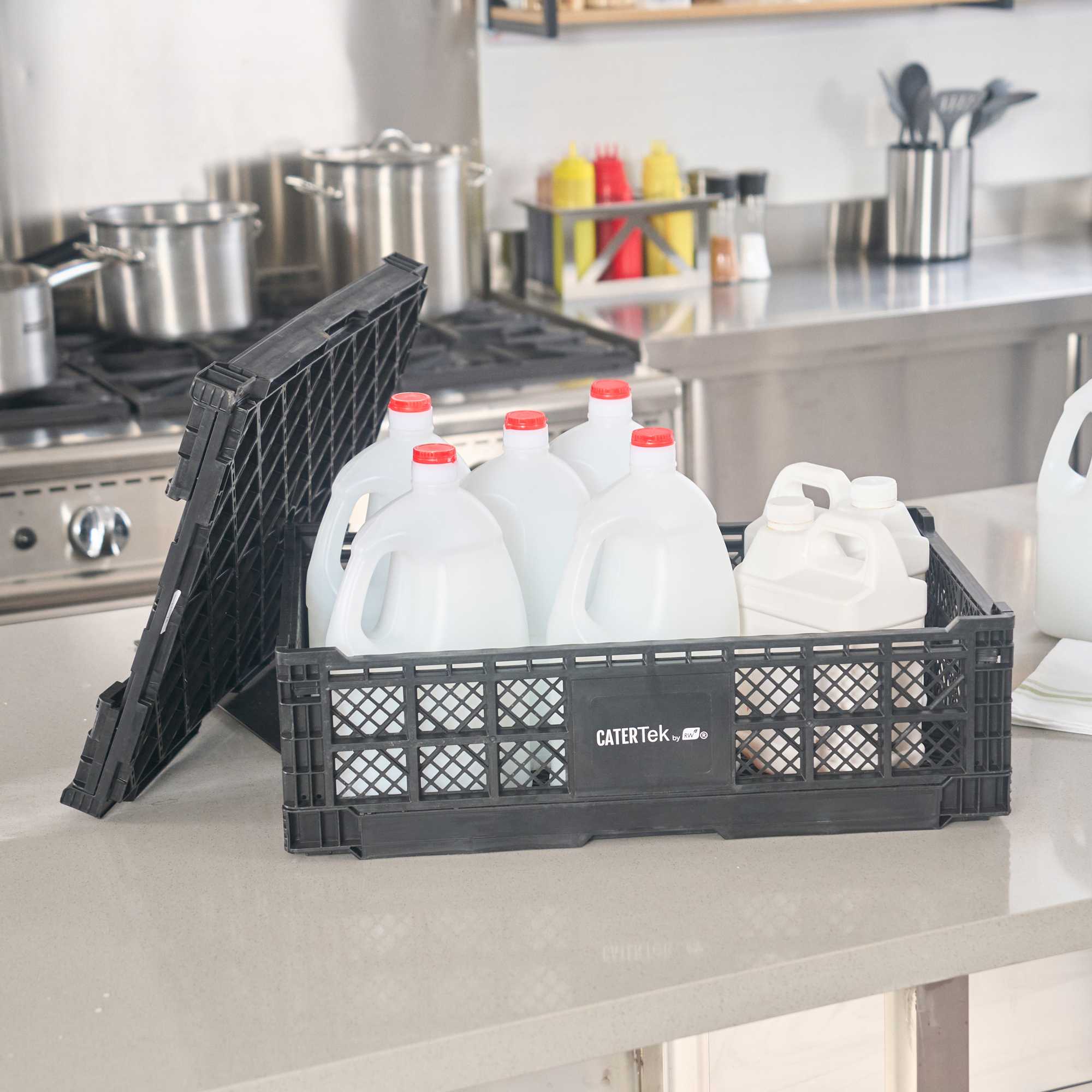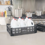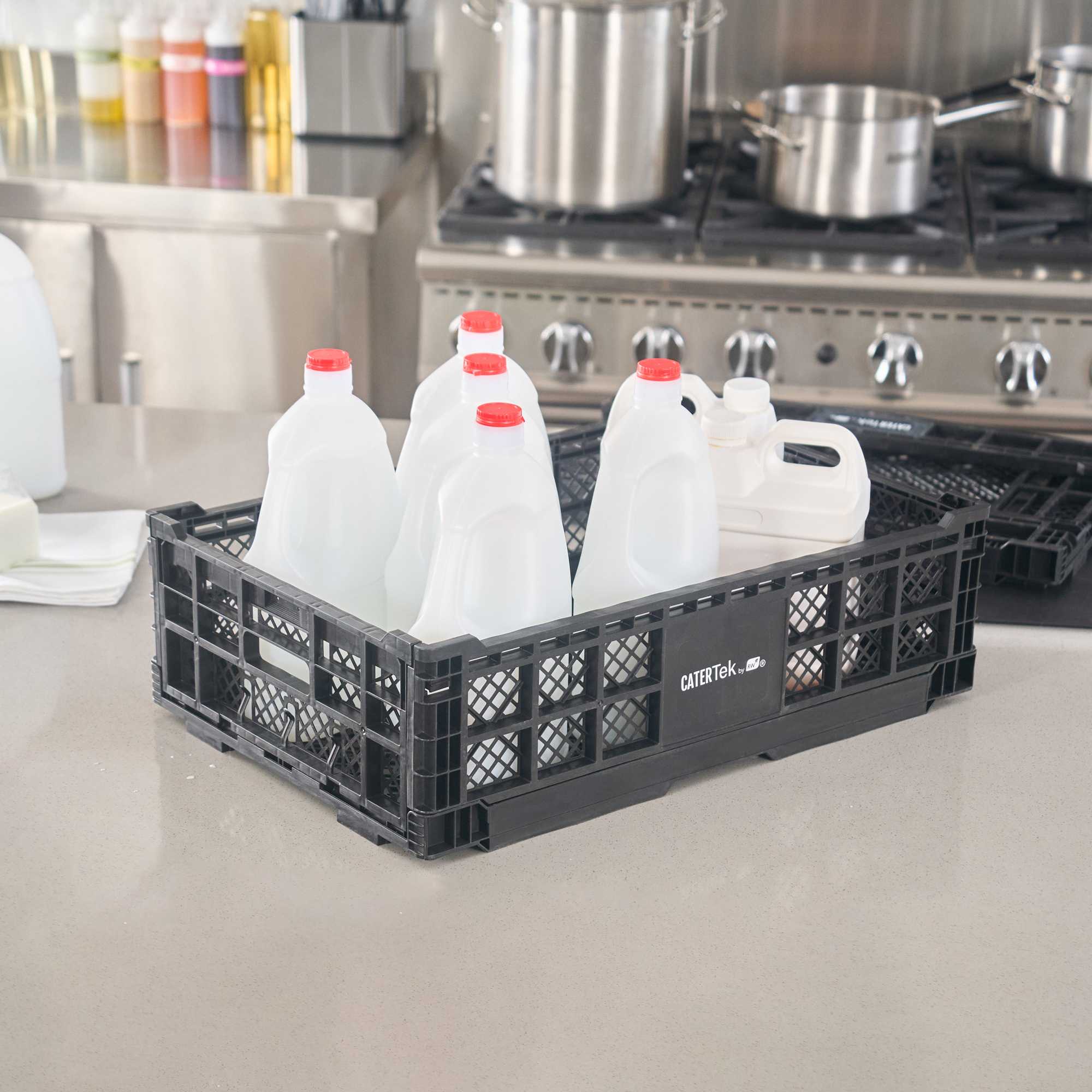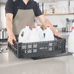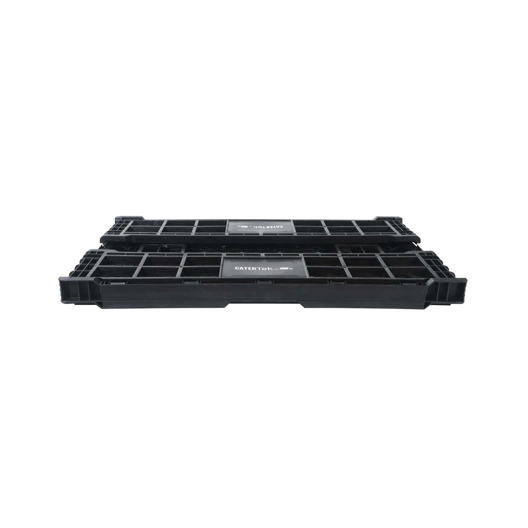 Optimize storage with versatile collapsible storage solutions. The Cater Tek Black Plastic Collapsible Storage Bin provides durable polypropylene construction, offering reliable support for heavy loads and ensuring long-lasting usability in foodservice environments. With a stackable storage crate design, these bins facilitate efficient kitchen organization, maximizing limited space. The vented plastic crate features vented sides, promoting airflow that keeps produce fresh for longer periods, a critical advantage for maintaining the quality of fresh ingredients. Its collapsible design saves space in storage and transport, making it an ideal choice for catering businesses looking to streamline operations. Measuring 23.6 inches in length by 15.7 inches in width by 6.6 inches in height, this bin is perfectly suited for grocery store produce racks to display bulk items effectively. Each order includes 10 Cater Tek Black Plastic Collapsible Storage Bins.