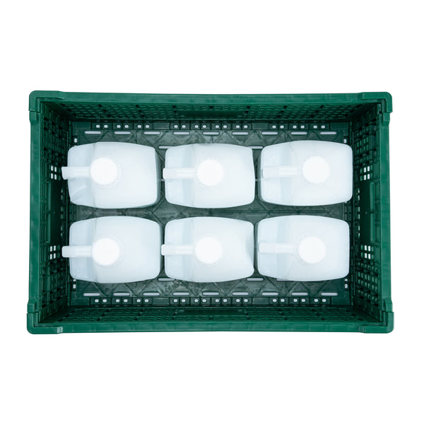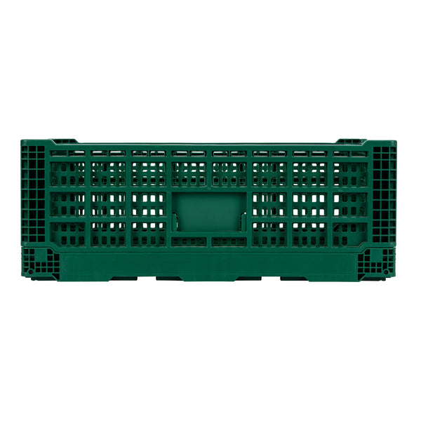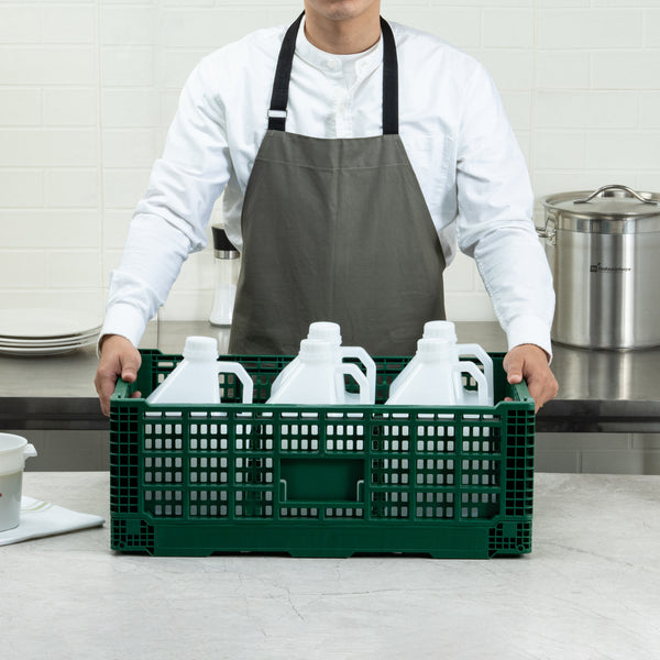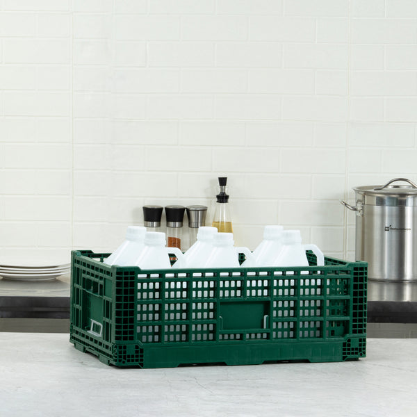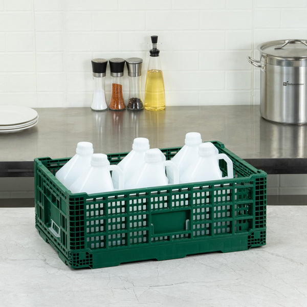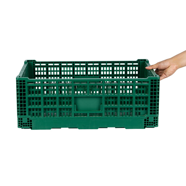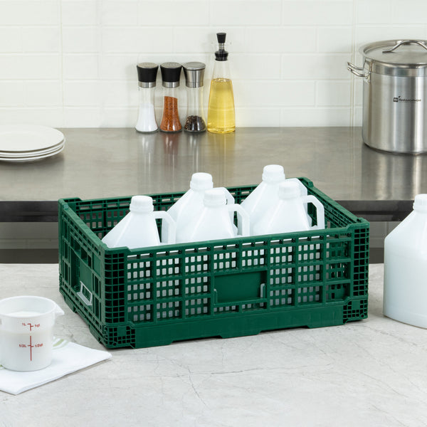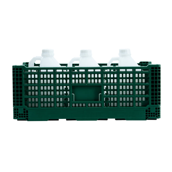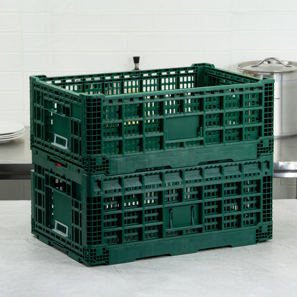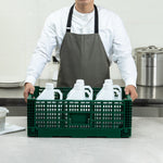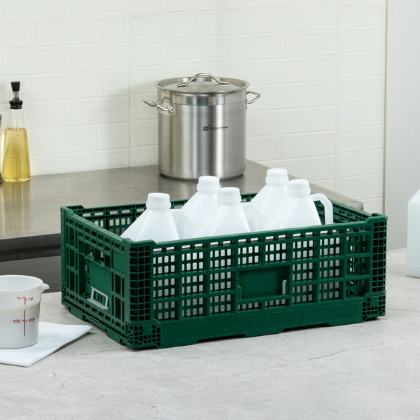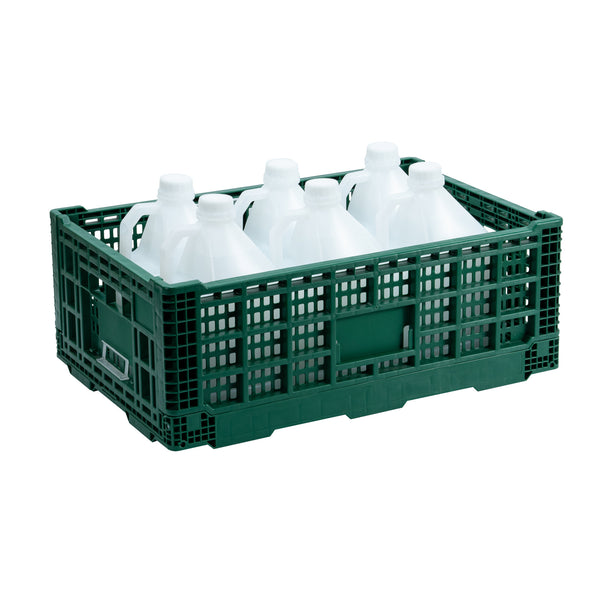 Store and stack your catering supplies with our Cater Tek Rectangle Green Plastic 36-liter Collapsible Milk Crate. With an interlocking system, this storage crate is stackable to fit multiple crates on trolleys and easily load them into your food truck. This dairy crate is collapsible to save space on your shelves and other small storage areas. Great for lifting heavy supplies, this collapsible crate is equipped with handles to easily transfer milk bottles or a bulk of disposable tableware. Featuring a mesh design, this folding crate allows you to quickly spot the contents inside the crate during busy service hours at your restaurant, food stand, or bakery. Constructed from heavy-duty plastic, this stackable crate expertly protects tableware from damage during transport. The green finish of this plastic crate allows you to organize your food stand equipment into a color-coded system. This rectangular, heavy-duty crate measures 23.5 inches long by 15.75 inches wide by 8.5 inches tall and contains up to 36 liters of your bottled beverages. Sold in a 1 count box.