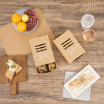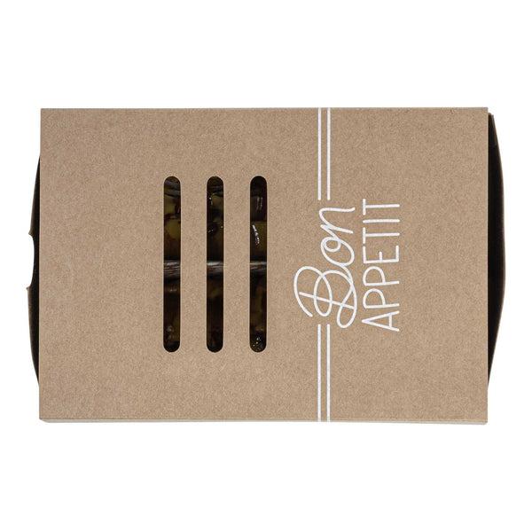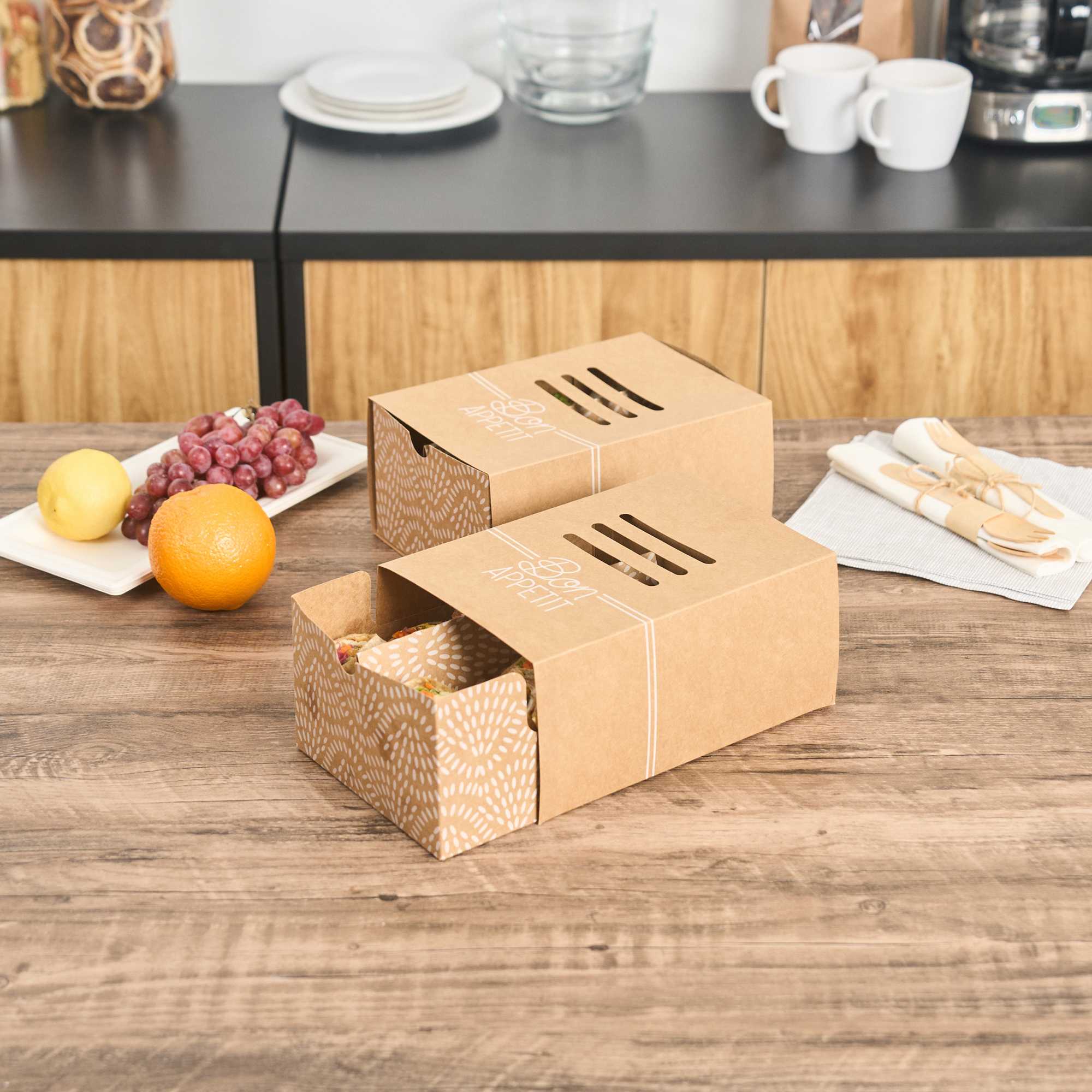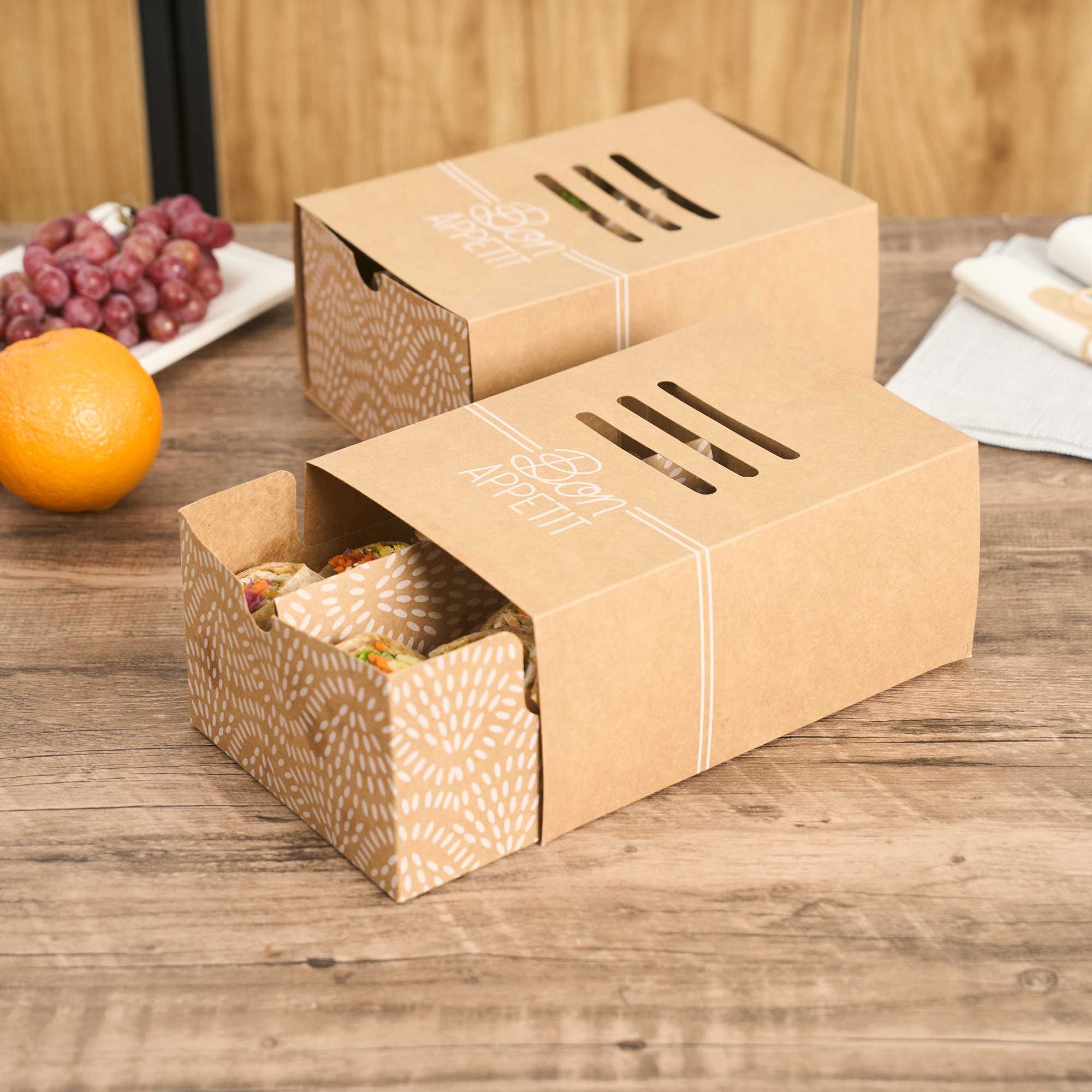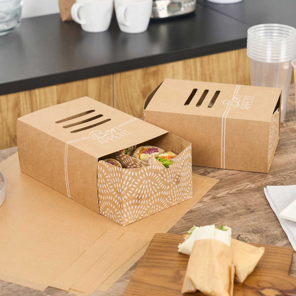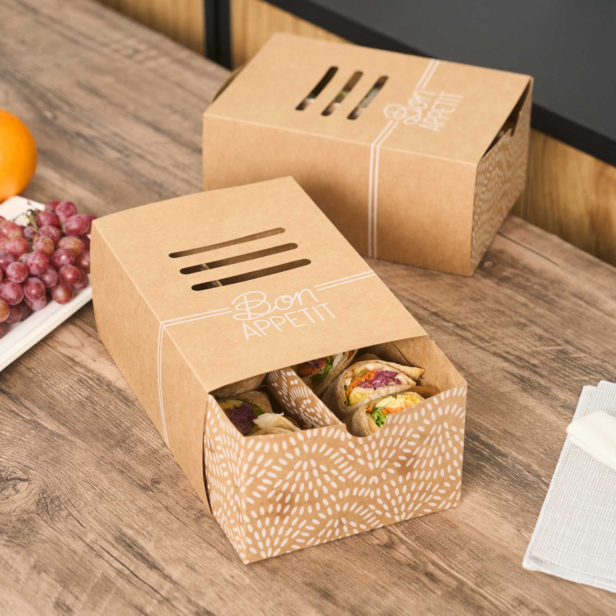 Keep hot dogs intact and sides separate in transit. The Cater Tek Kraft Paper Sandwich Takeout Box with Divider features a built-in divider to maintain food integrity, making it an essential sandwich takeout box for foodservice operations. An included cover protects meals from contaminants, ensuring your hot dog packaging keeps food fresh for takeout. Constructed from sturdy kraft paper, this kraft food container offers reliable support, preventing leaks and spills even with saucier dishes. Made from recyclable materials, this eco-friendly box appeals to environmentally conscious customers and enhances the visual appeal of meals with its simple design. Ideal for food trucks and concession stands, the convenient size of 8.3 inches by 5.7 inches optimizes packaging efficiency for standard hot dogs and sides. Elevate your food presentation and service with this versatile kraft food container. Each order includes 100 Cater Tek Kraft Paper Sandwich Takeout Boxes with Dividers.