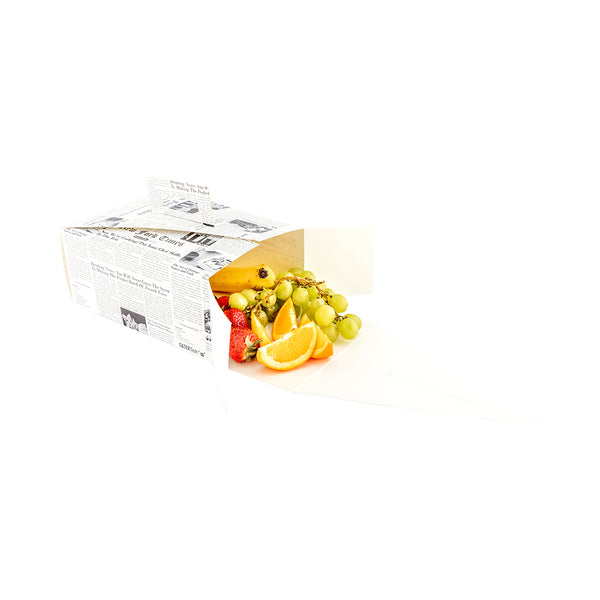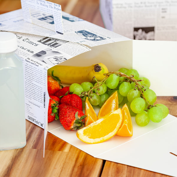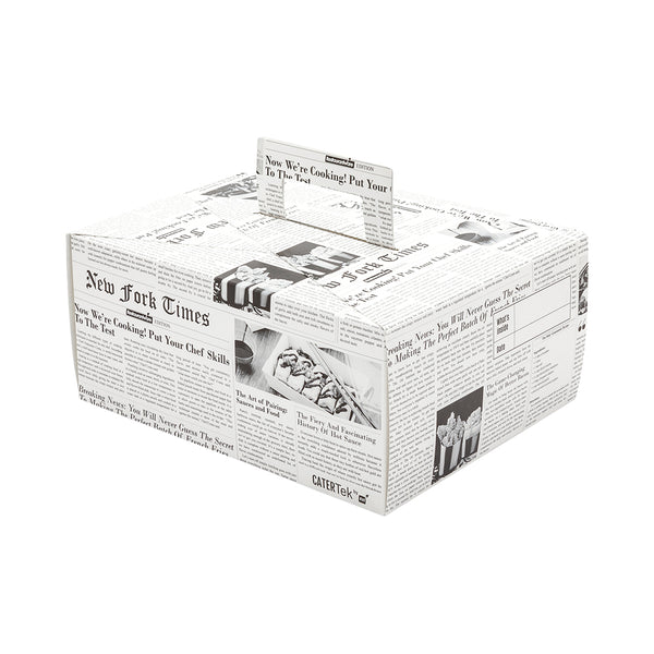 Upgrade the way you package to go orders using our Cater Tek Rectangle Newsprint Paper Deep Take Out Containers. Equipped with a sturdy handle, these large lunch boxes provide employees with a comfortable way to hand out take out orders at your restaurant, catered event, or cafeteria. Featuring a newsprint design, these stylish lunch boxes add a chic and newsworthy touch to ensure lunch orders create a lasting first impression on guests. With a grease-resistant lining, these deep lunch boxes create a barrier that prevents saucy and greasy foods from leaking through. Constructed from premium paper, these rectangle lunch boxes securely contain hefty entrees and side dishes without folding or bending. These paper take out boxes are conveniently recyclable, offering guests a nature-friendly way to dispose of boxes after enjoying meals. Measuring 9 inches in length by 7 inches in width by 4 inches in height, these disposable paper lunch boxes are shipped unassembled for simple storage and can be easily folded together when ready to pack lunches. Shipped in a 100 count box.