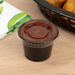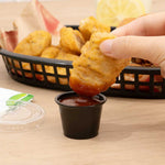Serve ketchup and mustard alongside fries using our Chef 101 1-ounce Round Black Plastic Portion Cups. Crafted with high-quality plastic, these condiment cups are recyclable for an eco-friendly and efficient way to dispose of cups after use. Conveniently microwave-safe, these plastic condiment cups allow you to reheat sauces or dips. These 1-ounce cups feature a rolled rim that prevents sauces from overflowing when filling up cups. To securely package condiments for delivery orders, pair these plastic condiment cups with our coordinating clear lids (SKU: RWP0620C). The black finish of these condiment cups perfectly complements the packaging and serving supplies at your restaurant, cafe, or bar. Great for space-saving storage, these plastic condiment cups can be easily stacked together. These condiments cups hold up to 1 ounce and measure 1.7 inches in diameter by 1.3 inches in height. Shipped in a 2000 count box. Lids available and sold separately.