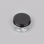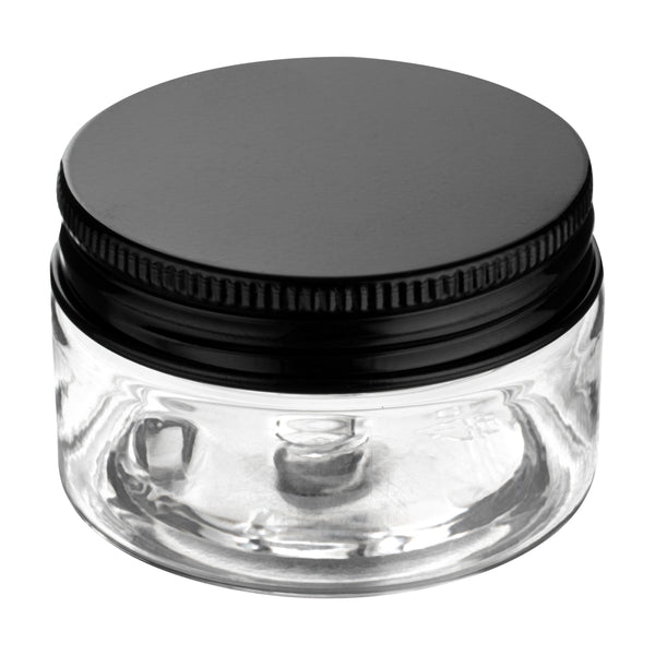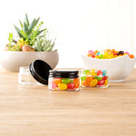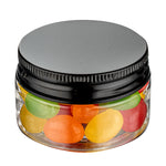 1 OZ ROUND CLEAR PLASTIC CANDY AND SNACK JAR - WITH BLACK ALUMINUM LID
