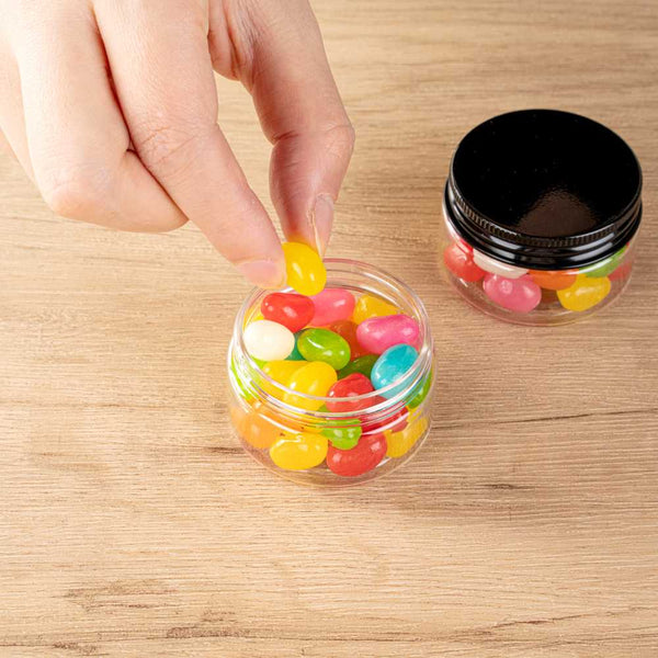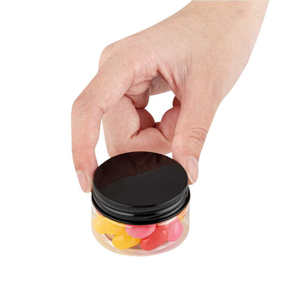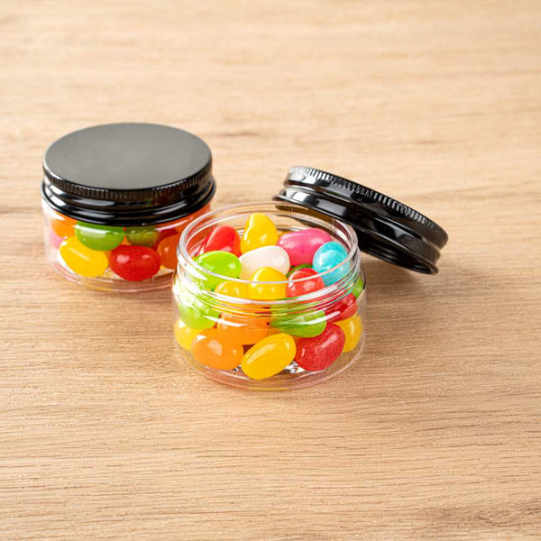 1 OZ ROUND CLEAR PLASTIC CANDY AND SNACK JAR - WITH BLACK ALUMINUM LID