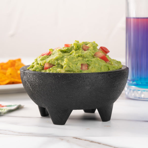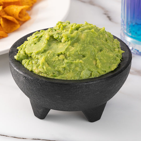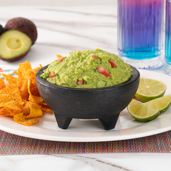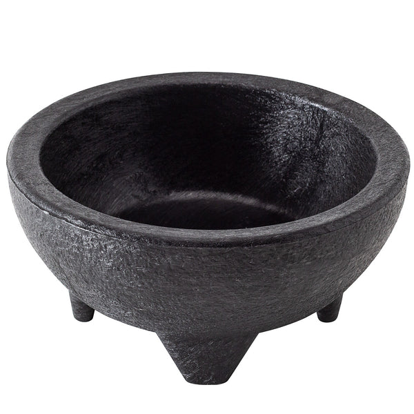 Stylishly serve your signature hot dips or cold sauces with our Chef 101 10-ounce Round Black Thermal Plastic Molcajete Bowl. This molcajete salsa bowl features a black finish and 3-legged design that gives your freshly prepared sauces a traditional and authentic look to complement your Mexican-inspired dishes. Crafted from premium plastic, this Mexican molcajete bowl is built to hold the weight of thick or creamy sauces and maintain its exceptional appearance for everyday use. This plastic salsa bowl is conveniently microwave-safe, allowing you to heat up and serve sauces in the same bowl. Built to withstand commercial dishwasher-use, this break-resistant molcajete bowl provides you with a simple way to remove sauces and streamline your cleaning process. Containing up to 10 ounces, this black sauce bowl is ideal for serving dishes with their accompanying condiments. This plastic salsa bowl measures 5.25 inches in diameter by 2.5 inches in height. Shipped in a 1 count box.