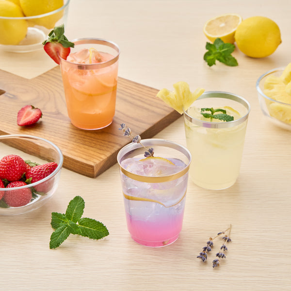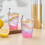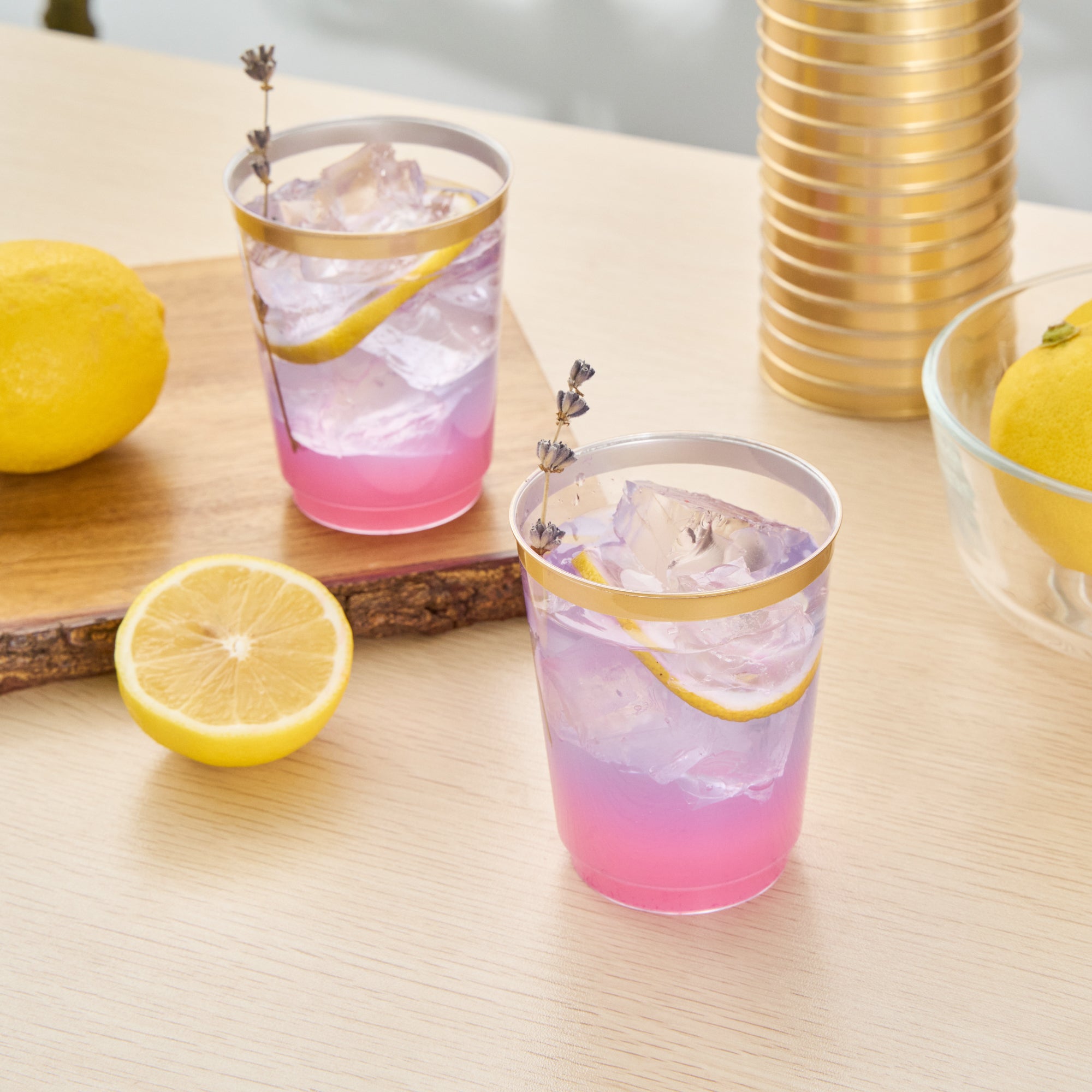 Make every celebration sparkle with our Chef 101 10-ounce Clear Plastic Tumblers. These clear glasses come with a sophisticated gold rim design that elevates the aesthetics of any event. Made from durable PS plastic, these sturdy cups are disposable, offering an ideal solution for events where convenience meets elegance. With a generous 10 ounce capacity, these gold plastic cups are perfect for serving cocktails and juices, enhancing the beverage presentation for weddings, birthdays, and family gatherings. The recyclable nature of these cups simplifies post-event cleanup, making them an eco-conscious choice without sacrificing style. Ideal for cold food applications, these clear tumblers maintain their sheen and clarity, adding a tasteful touch to your party setup. Measuring 2.95 inches in diameter and 3.8 inches in height, these 10-ounce plastic glasses are perfect for diverse events like parties, picnics, or family reunions. Sold in a 500 count box.