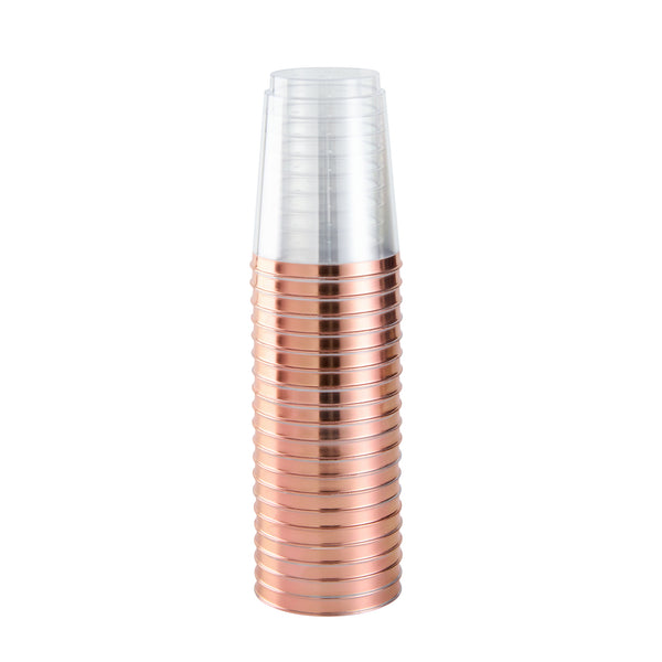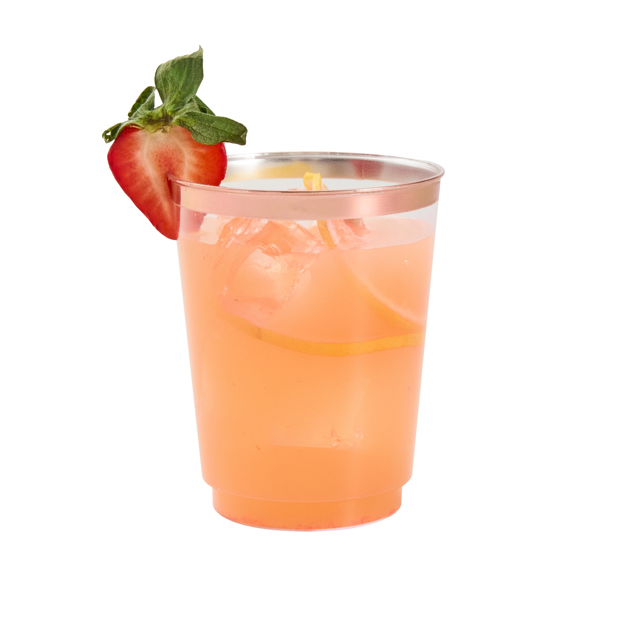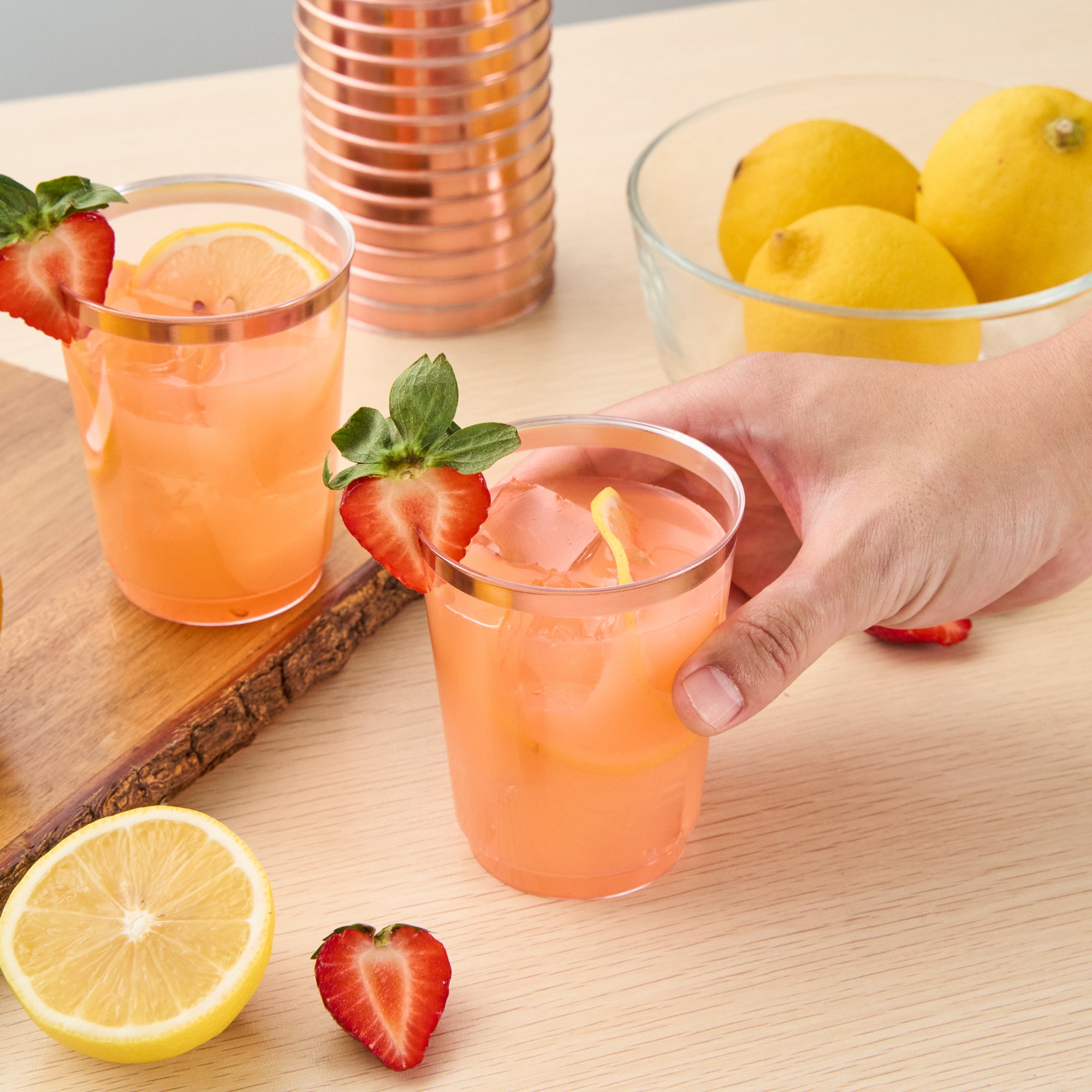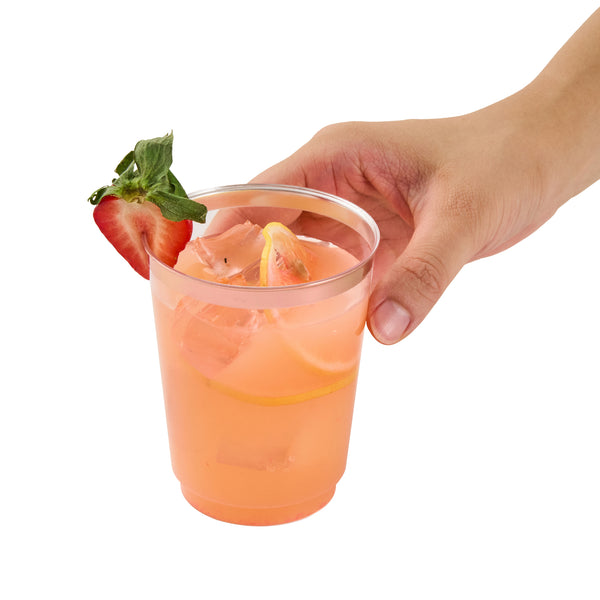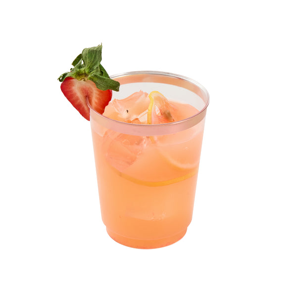 Enhance cocktail presentations with our Chef 101 10-ounce Clear Plastic Tumblers. These clear glasses feature a rose gold rim that elevates the appeal of any beverage service, making them ideal for upscale events like weddings and parties. Made from hard, durable PS plastic, these disposable glasses are recyclable, providing a striking combination of beauty and practicality. With a generous 10 ounce capacity, these clear tumblers are perfect for serving both cocktails and desserts. The plastic design ensures that these plastic glasses resist stains and maintain a clean look. Cold food-friendly and ideal for celebrations, these elegant cups pair seamlessly with any color beverage for a refined presentation. Measuring 2.95 inches in diameter and 3.8 inches in height, these 10-ounce plastic glasses are suitable for a variety of festive settings. Sold in a 20 count box.