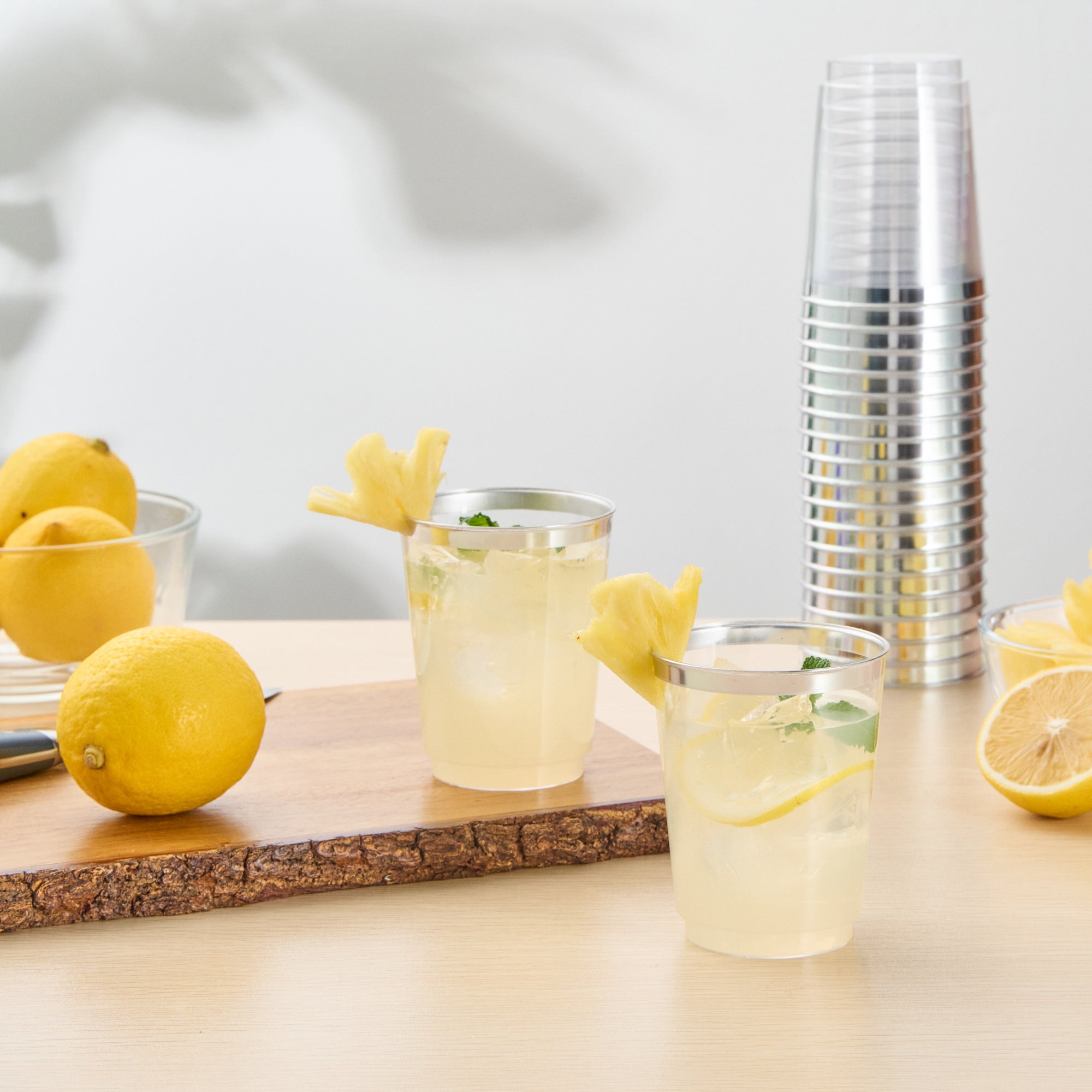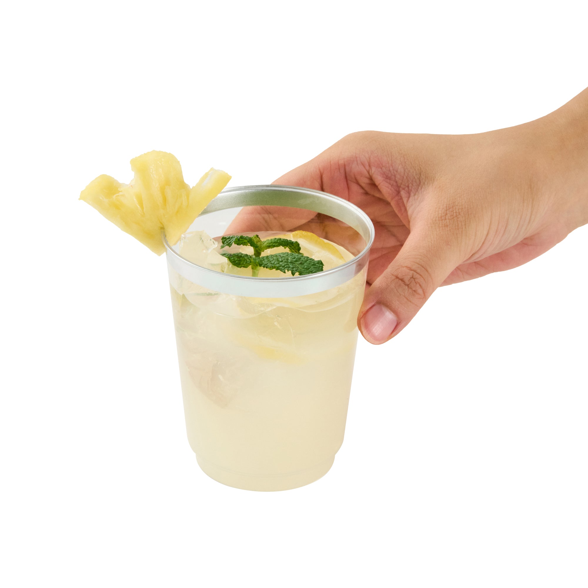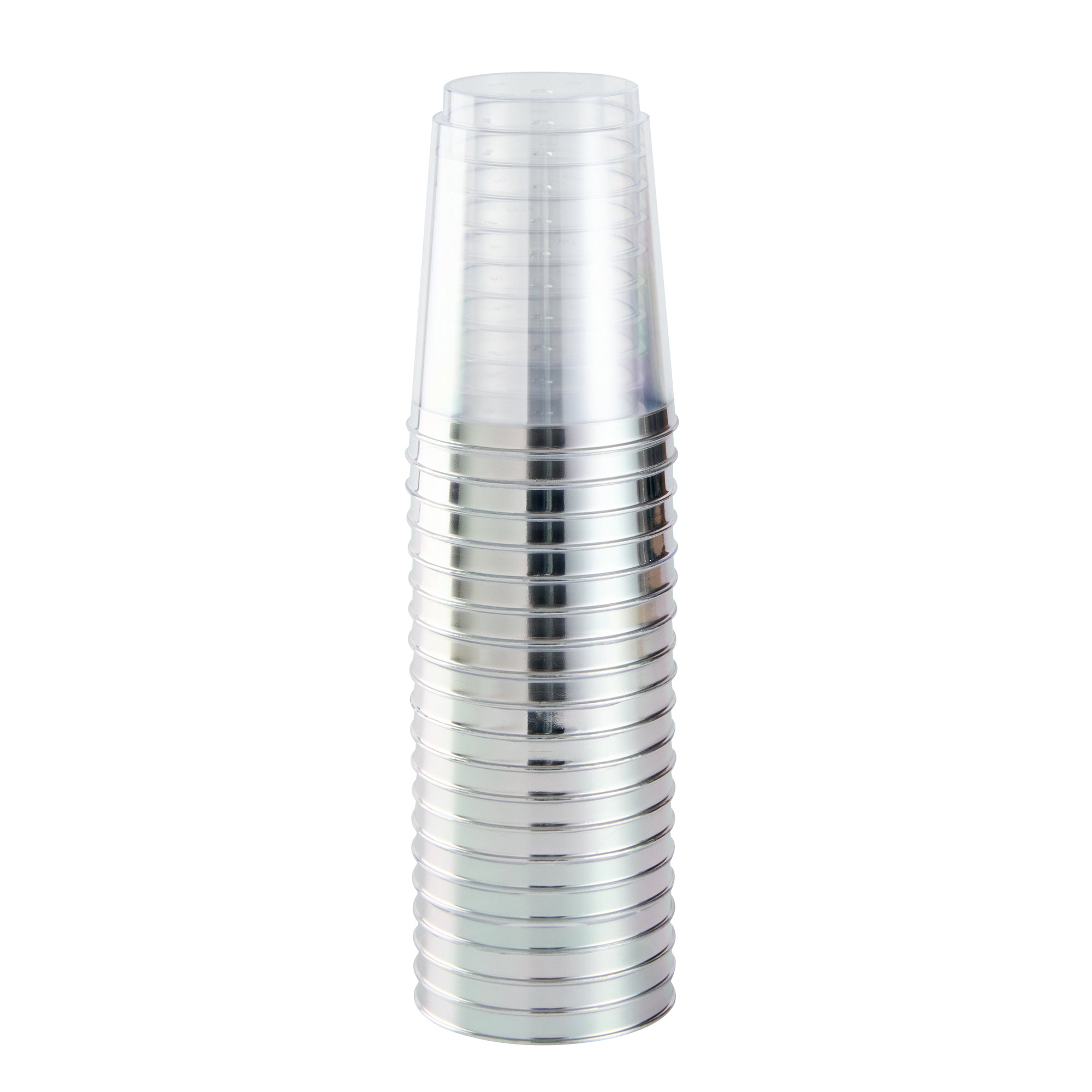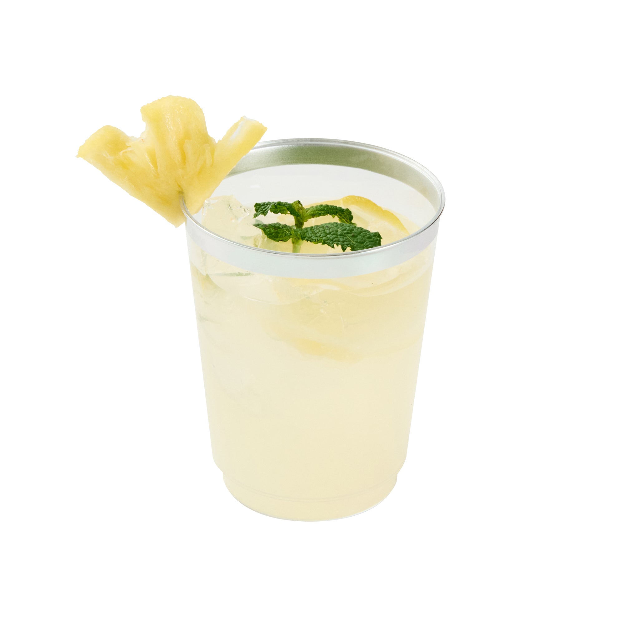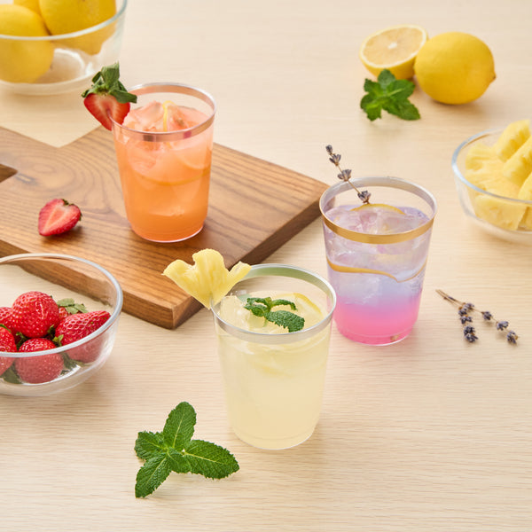 Elevate your drink service with our Chef 101 10-ounce Clear Plastic Tumblers. The elegant silver rim finish of these clear glasses pairs beautifully with all beverage colors, accenting your event's aesthetic. These attractive cups are made out of hard and durable PS plastic, ideal for single-use circumstances, making them perfect disposable cocktail glasses. The plastic composition of these sturdy cups and their recyclable feature support sustainable foodservice practices, enabling seamless integration into eco-conscious operations. Cold food-friendly, these clear tumblers are tailored for chilled beverages, ideal for elevating weddings, birthdays, or any vibrant party setup. Measuring 2.95 inches in diameter and 3.8 inches in height, these 10-ounce disposable and stylish glasses deliver both flair and functionality. Sold in a 20 count box.