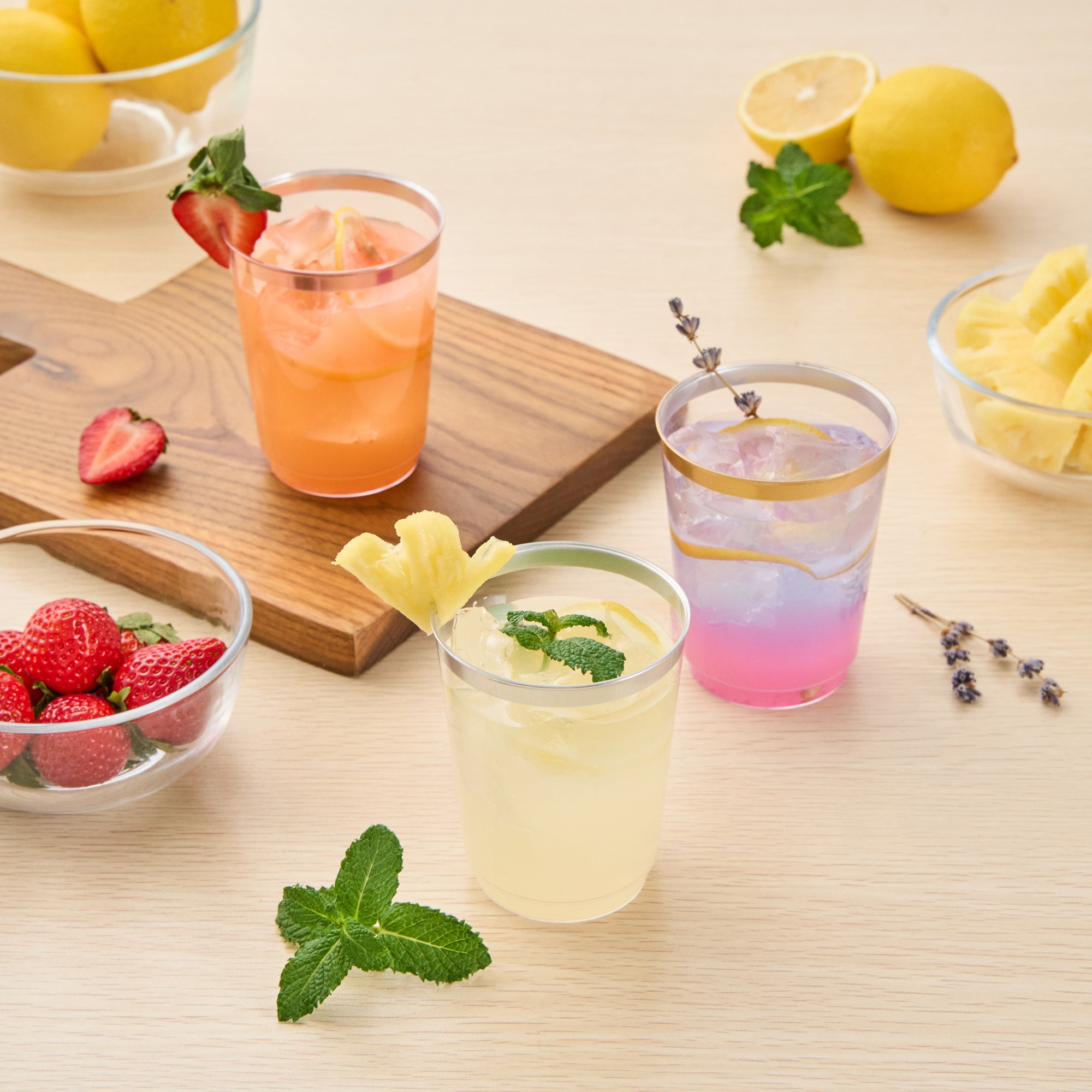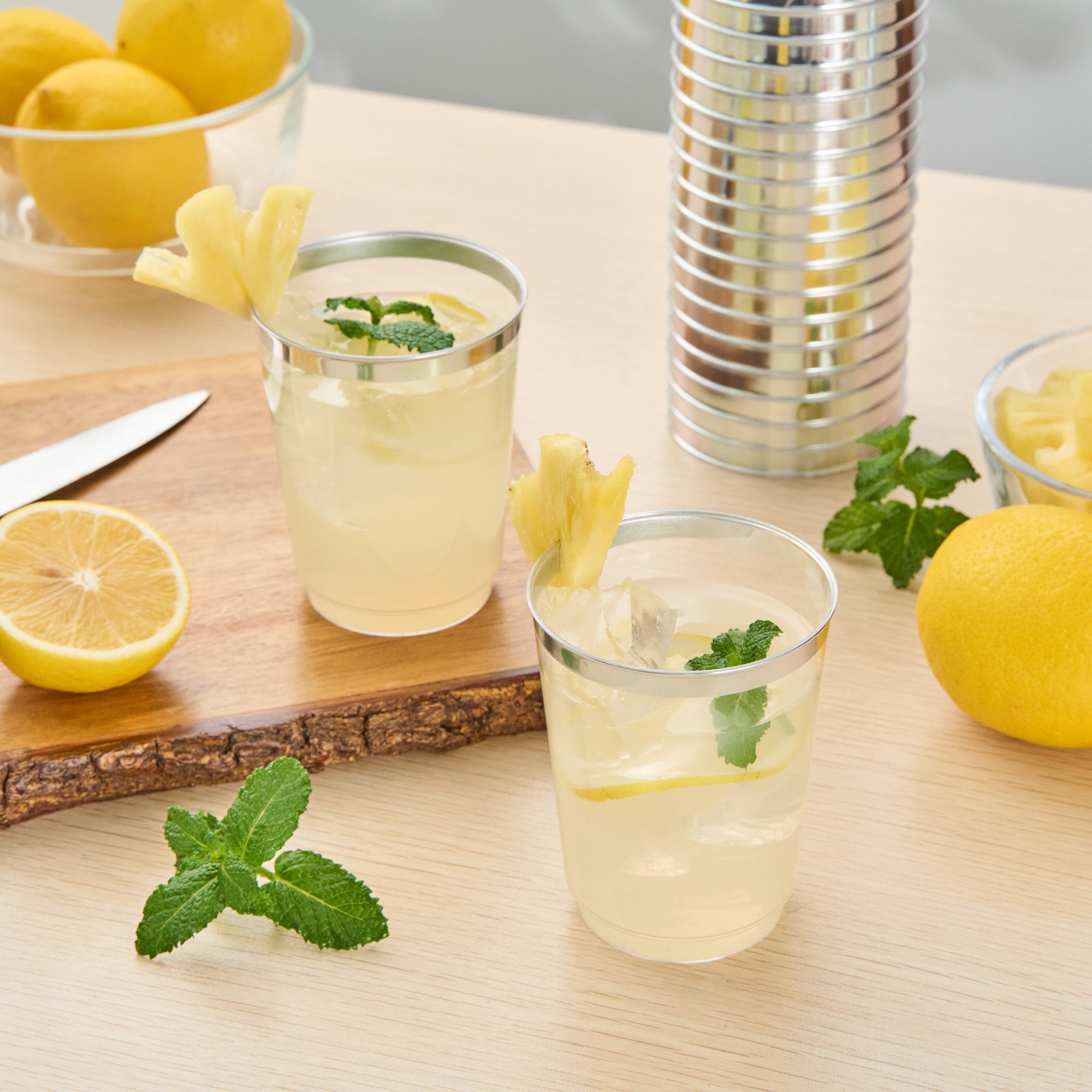 Elevate your drink service with our Chef 101 10-ounce Clear Plastic Tumblers. The elegant silver rim finish of these clear glasses pairs beautifully with all beverage colors, accenting your event's aesthetic. These attractive cups are made out of hard and durable PS plastic, ideal for single-use circumstances, making them perfect disposable cocktail glasses. The plastic composition of these sturdy cups and their recyclable feature support sustainable foodservice practices, enabling seamless integration into eco-conscious operations. Cold food-friendly, these clear tumblers are tailored for chilled beverages, ideal for elevating weddings, birthdays, or any vibrant party setup. Measuring 2.95 inches in diameter and 3.8 inches in height, these 10-ounce disposable and stylish glasses deliver both flair and functionality. Sold in a 500 count box.