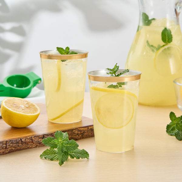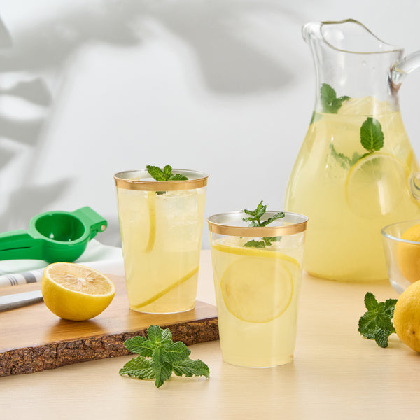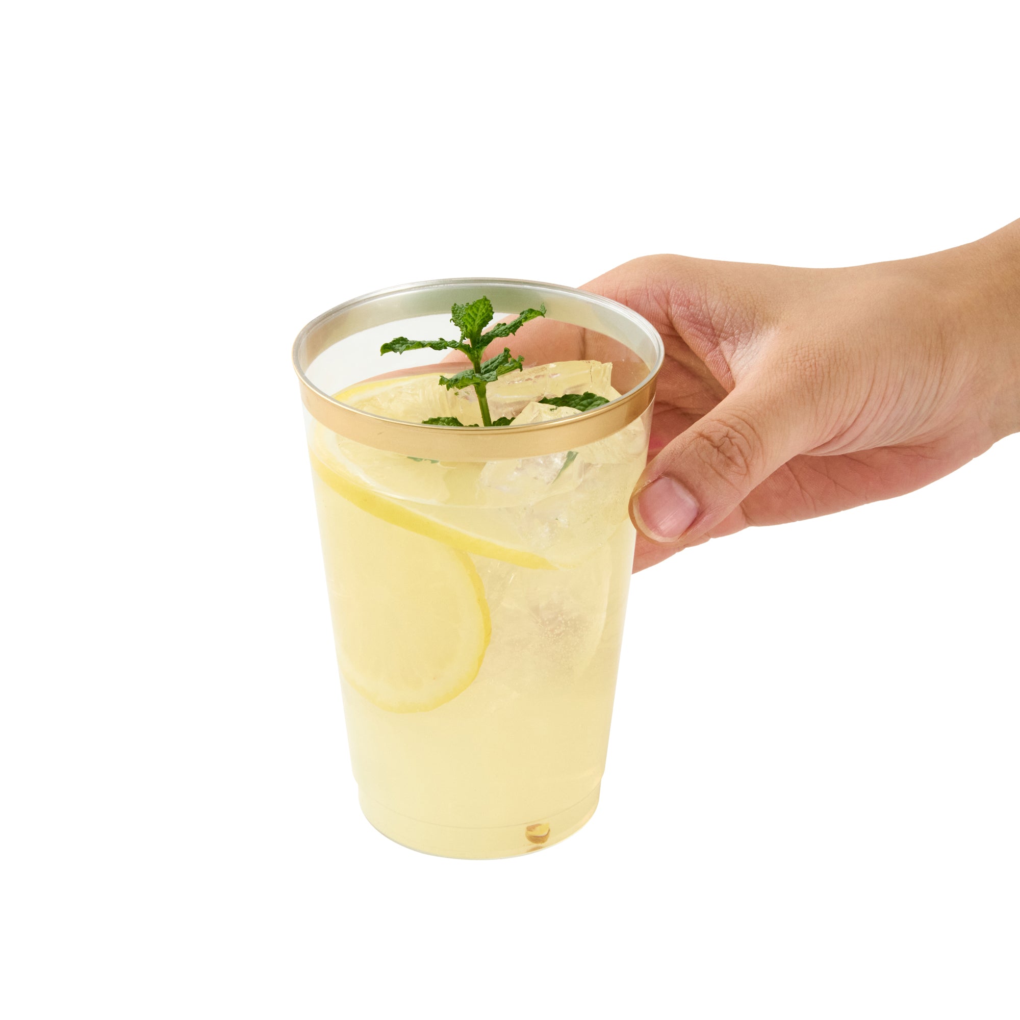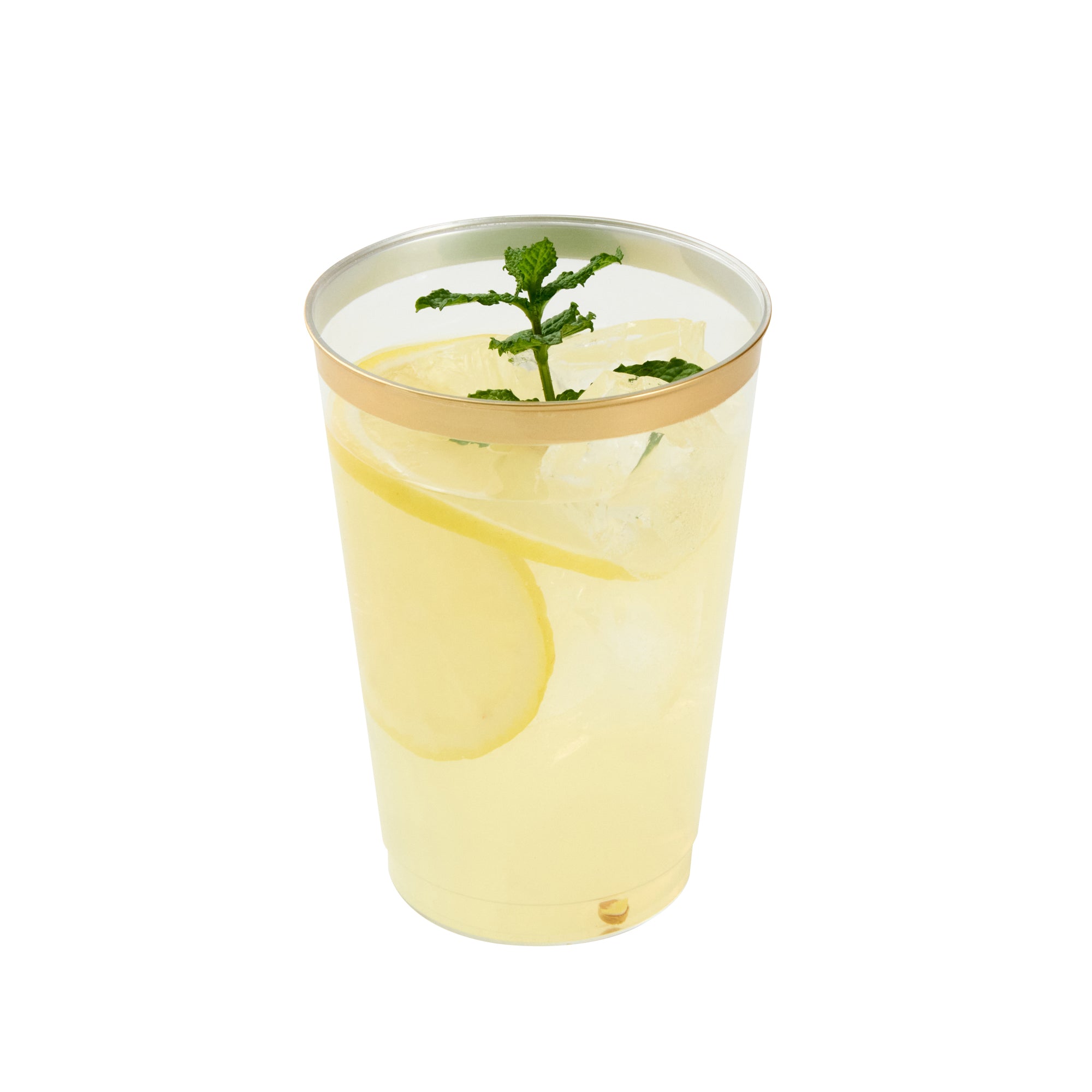 Elevate your beverage service with a touch of elegance. Chef 101 Festive Elegance Clear Plastic Tumblers boast a striking gold rim design that enhances the presentation of festive events such as weddings and birthdays, making them ideal clear plastic tumblers for upscale catering. Crafted from sturdy plastic, these tumblers ensure sustainable disposal and durability during use. With a cold food-friendly design, they are perfect for serving fresh juices and party cocktails, offering versatility for various cold beverages at events. Their 12-ounce capacity fits comfortably in hand and provides ample space for drinks, ensuring guest satisfaction at gatherings. The disposable nature of these tumblers simplifies post-event cleanup, allowing for quick and easy disposal. Invest in these gold rim disposable cups to impress guests and streamline your service. Each order includes 500 Chef 101 Festive Elegance Clear Plastic Tumblers.