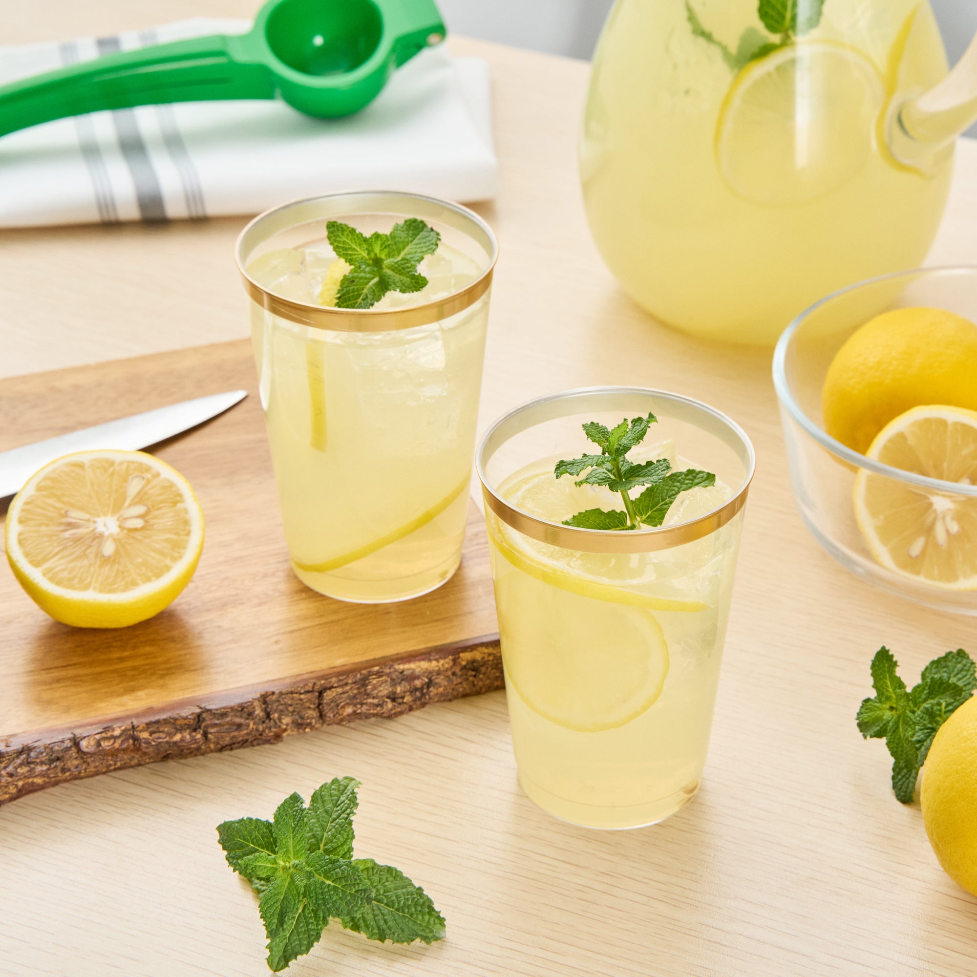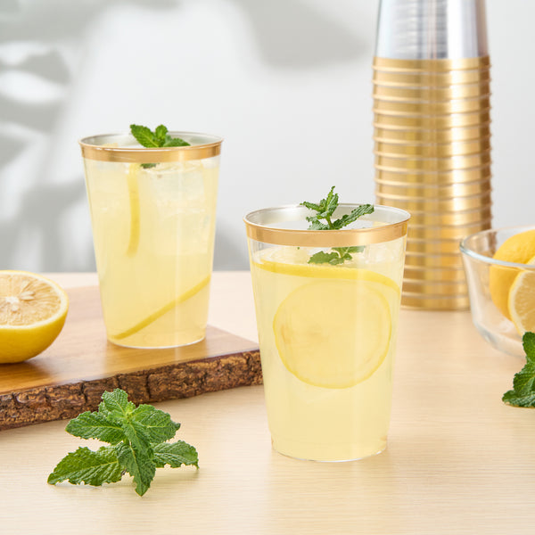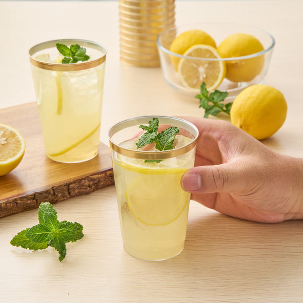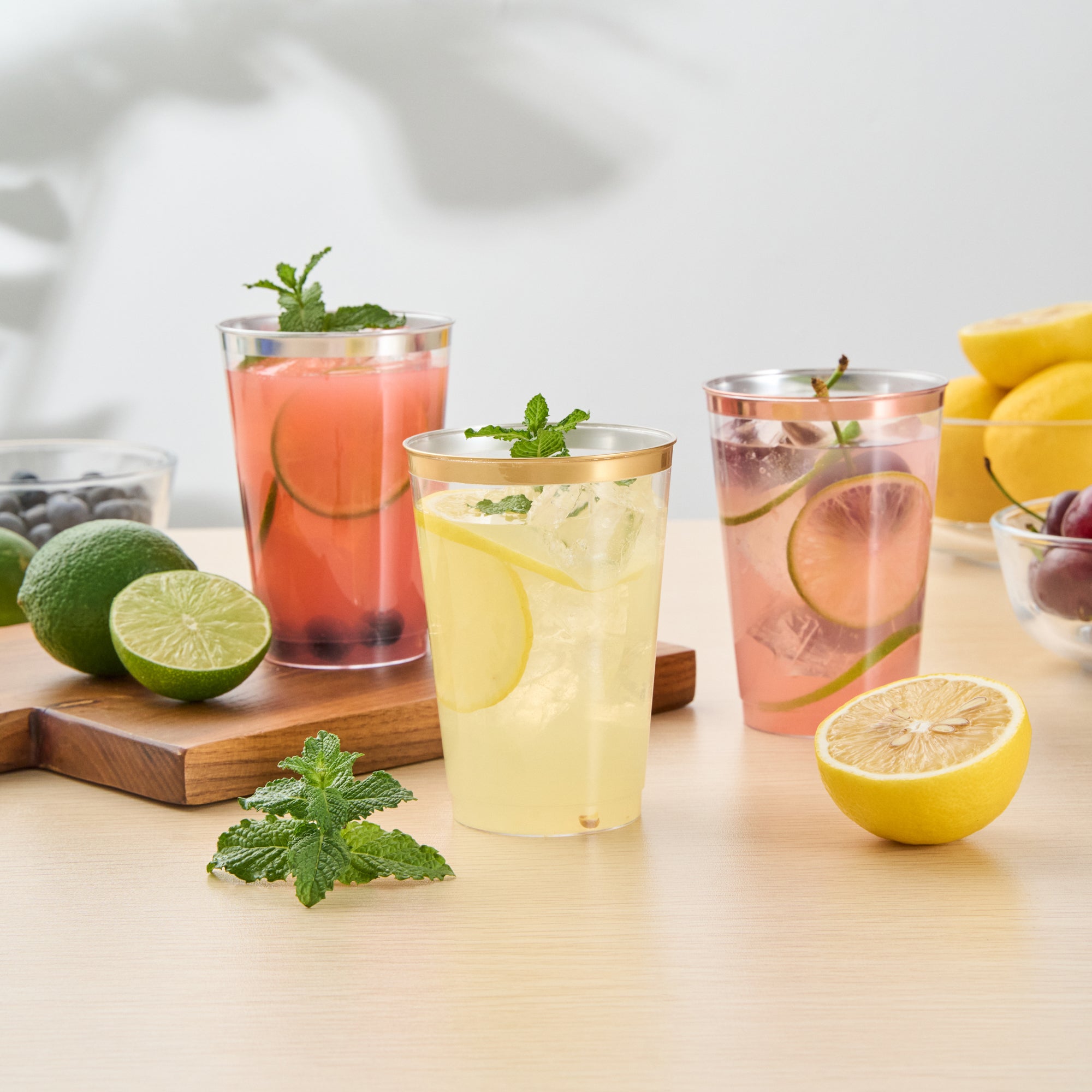 Elevate your beverage service with a touch of elegance. Chef 101 Festive Elegance Clear Plastic Tumblers boast a striking gold rim design that enhances the presentation of festive events such as weddings and birthdays, making them ideal clear plastic tumblers for upscale catering. Crafted from sturdy plastic, these tumblers ensure sustainable disposal and durability during use. With a cold food-friendly design, they are perfect for serving fresh juices and party cocktails, offering versatility for various cold beverages at events. Their 12-ounce capacity fits comfortably in hand and provides ample space for drinks, ensuring guest satisfaction at gatherings. The disposable nature of these tumblers simplifies post-event cleanup, allowing for quick and easy disposal. Invest in these gold rim disposable cups to impress guests and streamline your service. Each order includes 500 Chef 101 Festive Elegance Clear Plastic Tumblers.