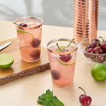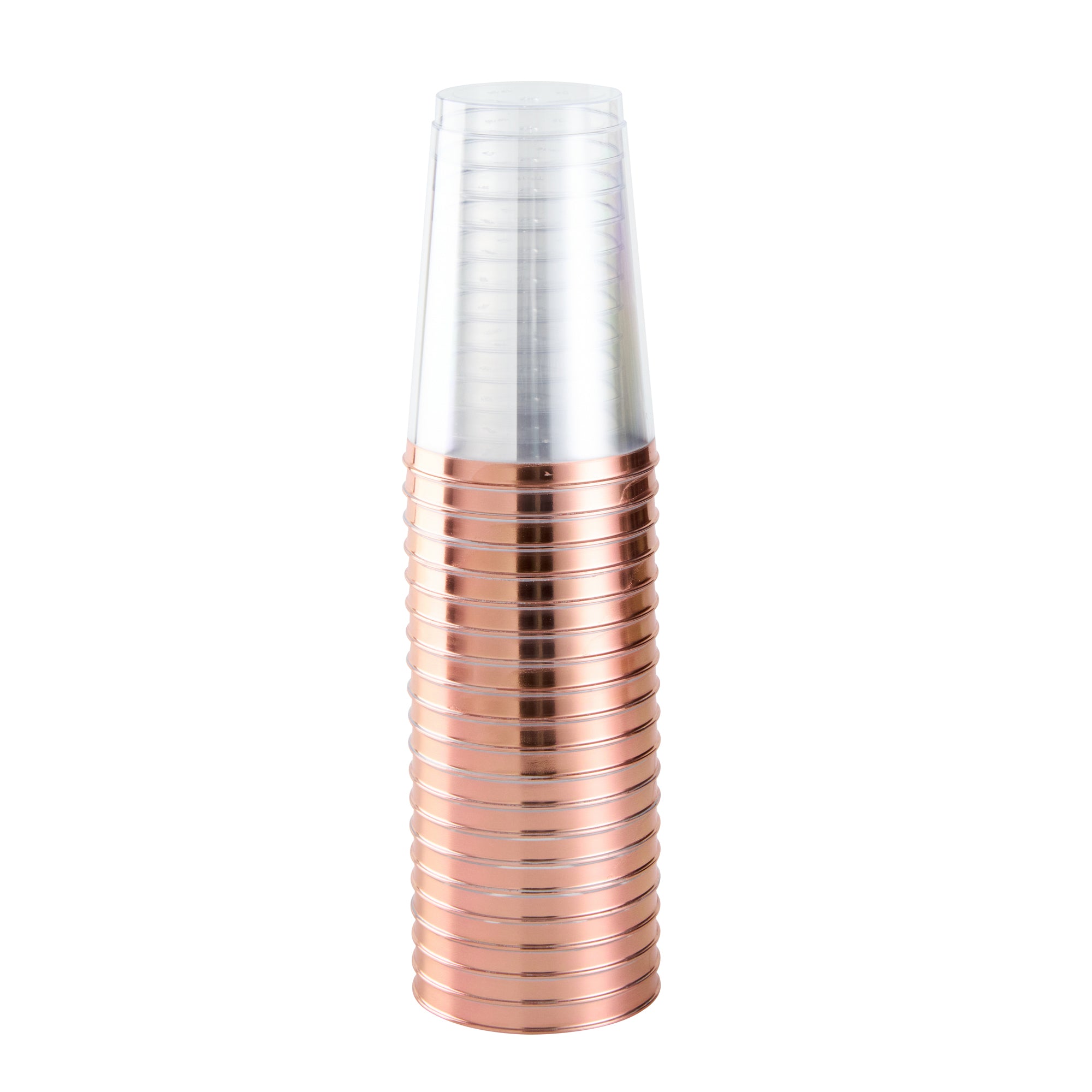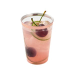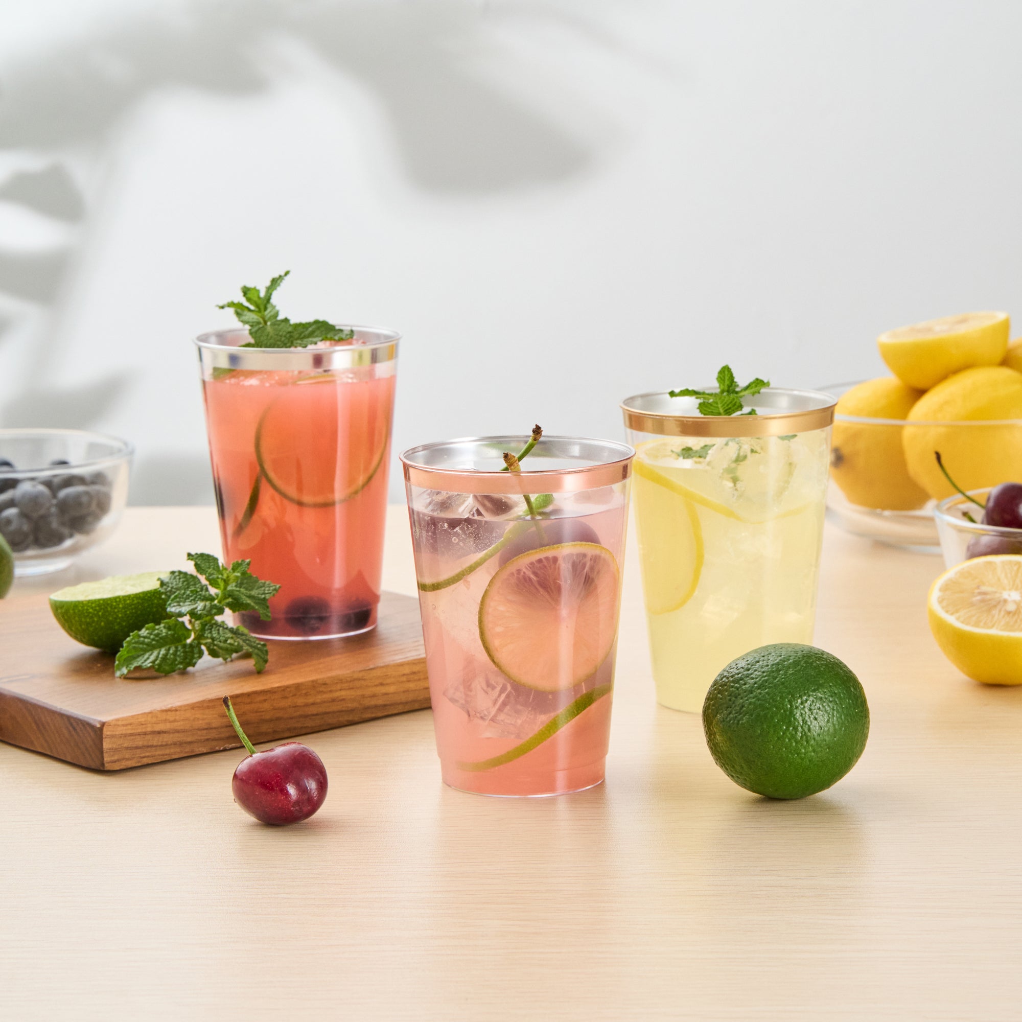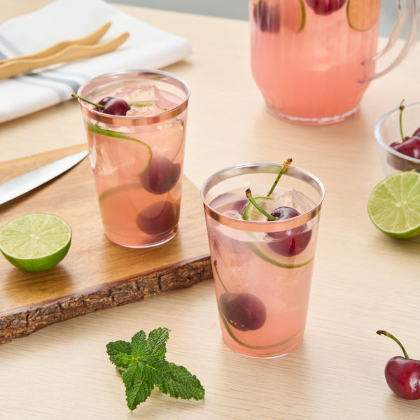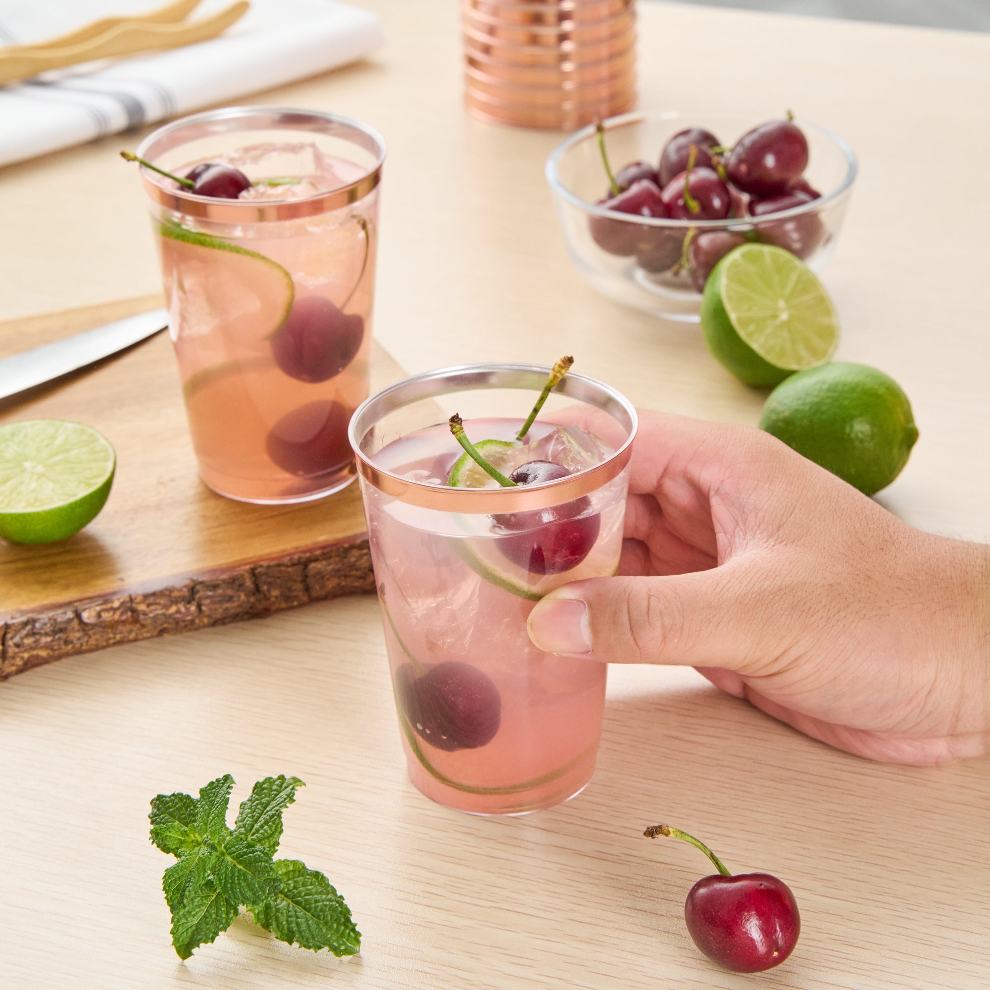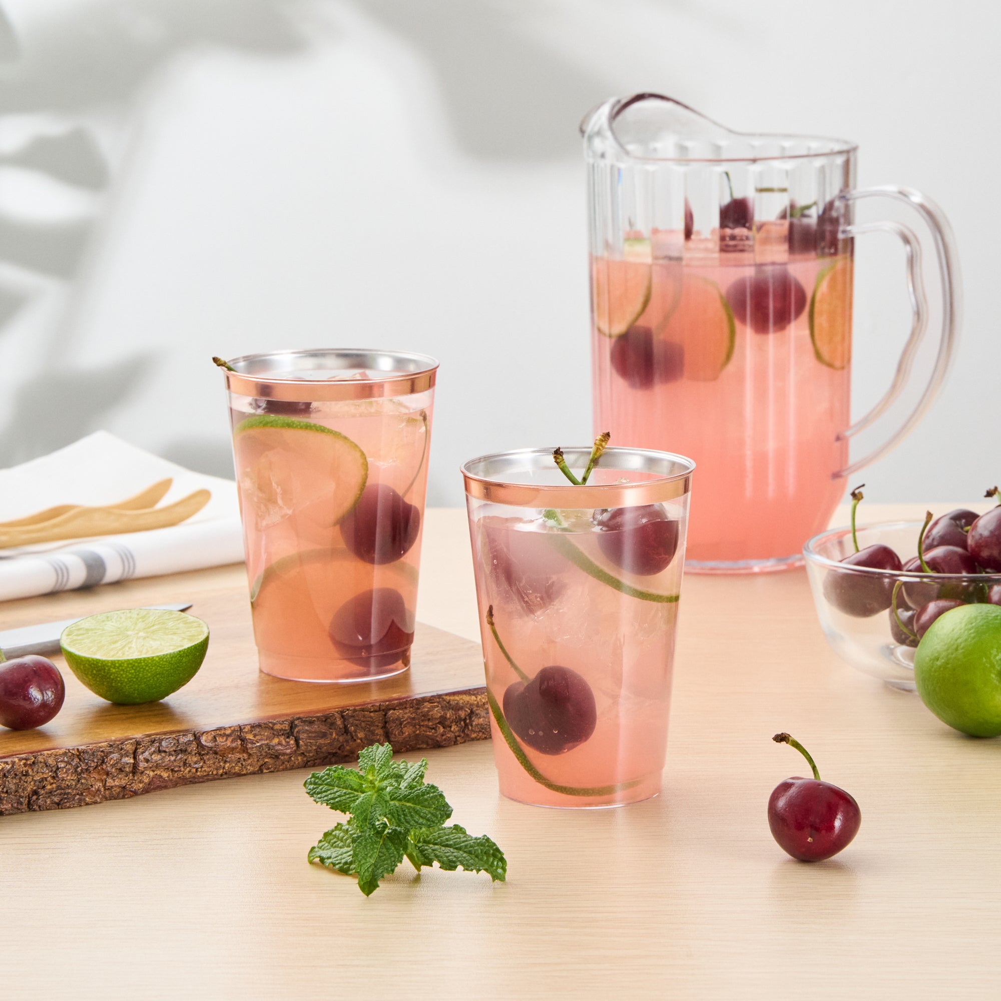 Elevate your events with sophistication with our Chef 101 12-ounce Clear Plastic Tumblers. These clear glasses with their rose gold rim complements upscale settings such as weddings and soirees. Made from hard and durable PS plastic, these plastic glasses offer the convenience of being disposable, reducing post-event cleanup. The sparkling design on these plastic glasses introduces a festive touch to any occasion, turning regular drinks into dazzling presentations, ideal for cocktails and desserts. With their cold food-friendly feature, these rose gold plastic tumblers ensure your creations are served in style. At 12-ounce capacity, these disposable glasses measure 3 inches in diameter and 4.3 inches in height, and are perfectly sized for a variety of beverages and treats at weddings, birthdays, and parties. Sold in a 20 count box.