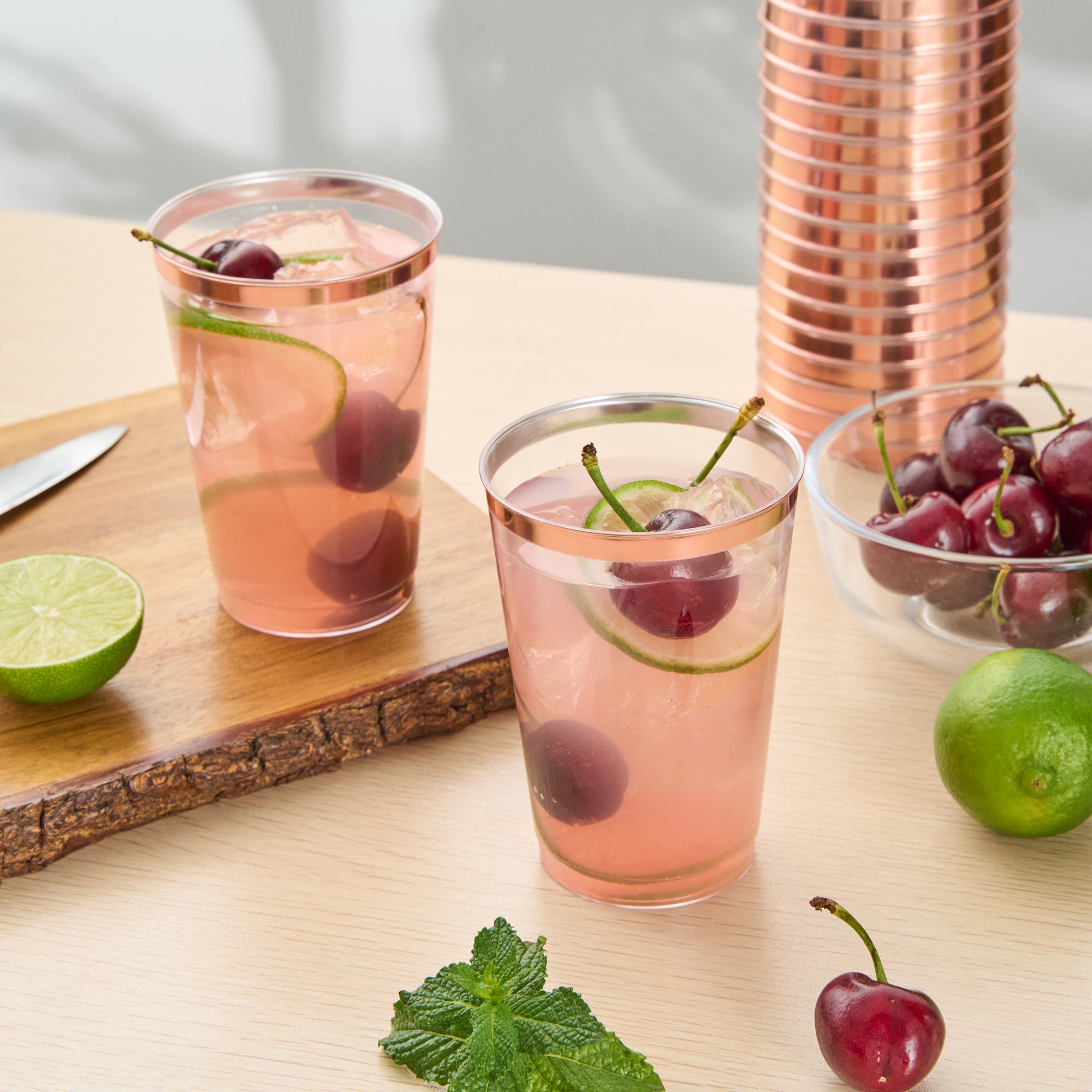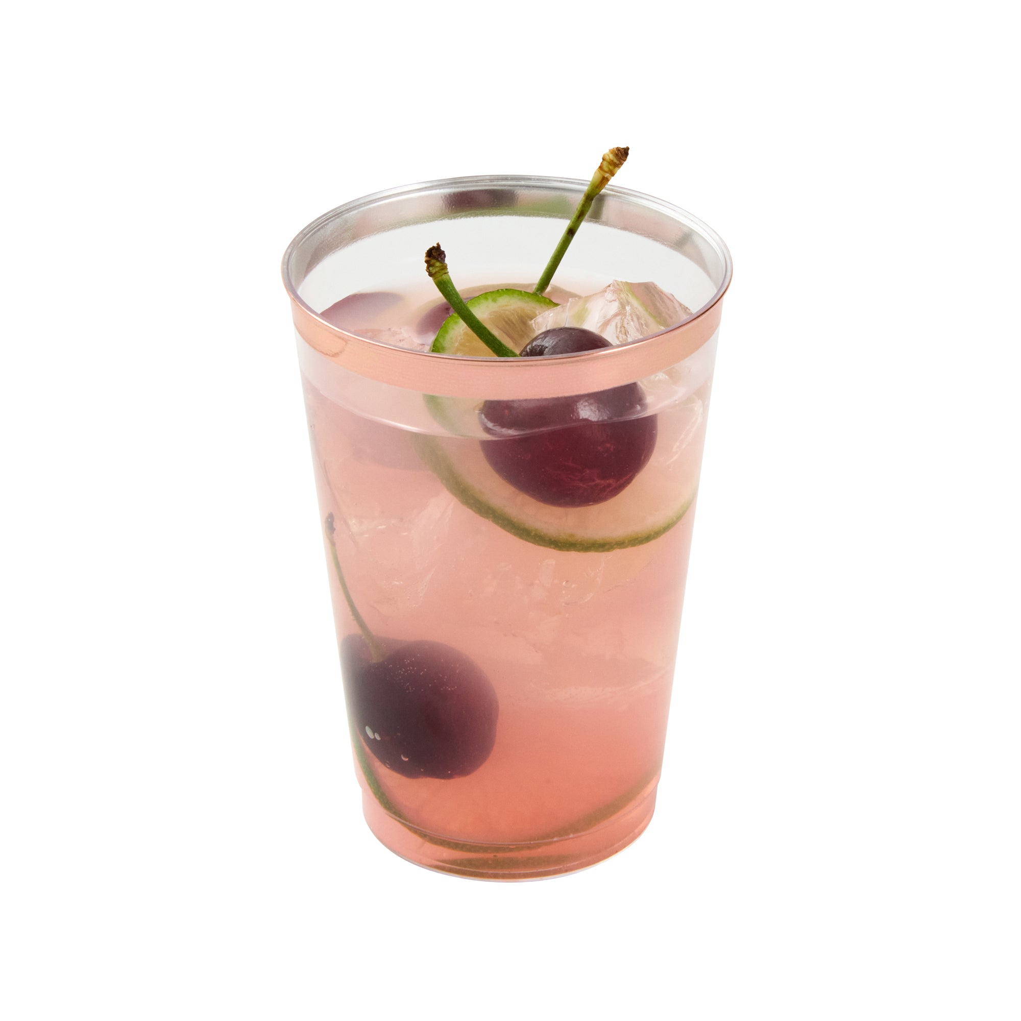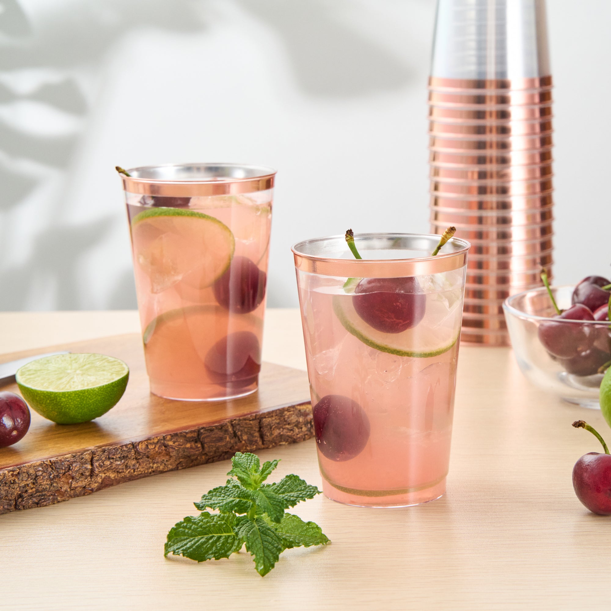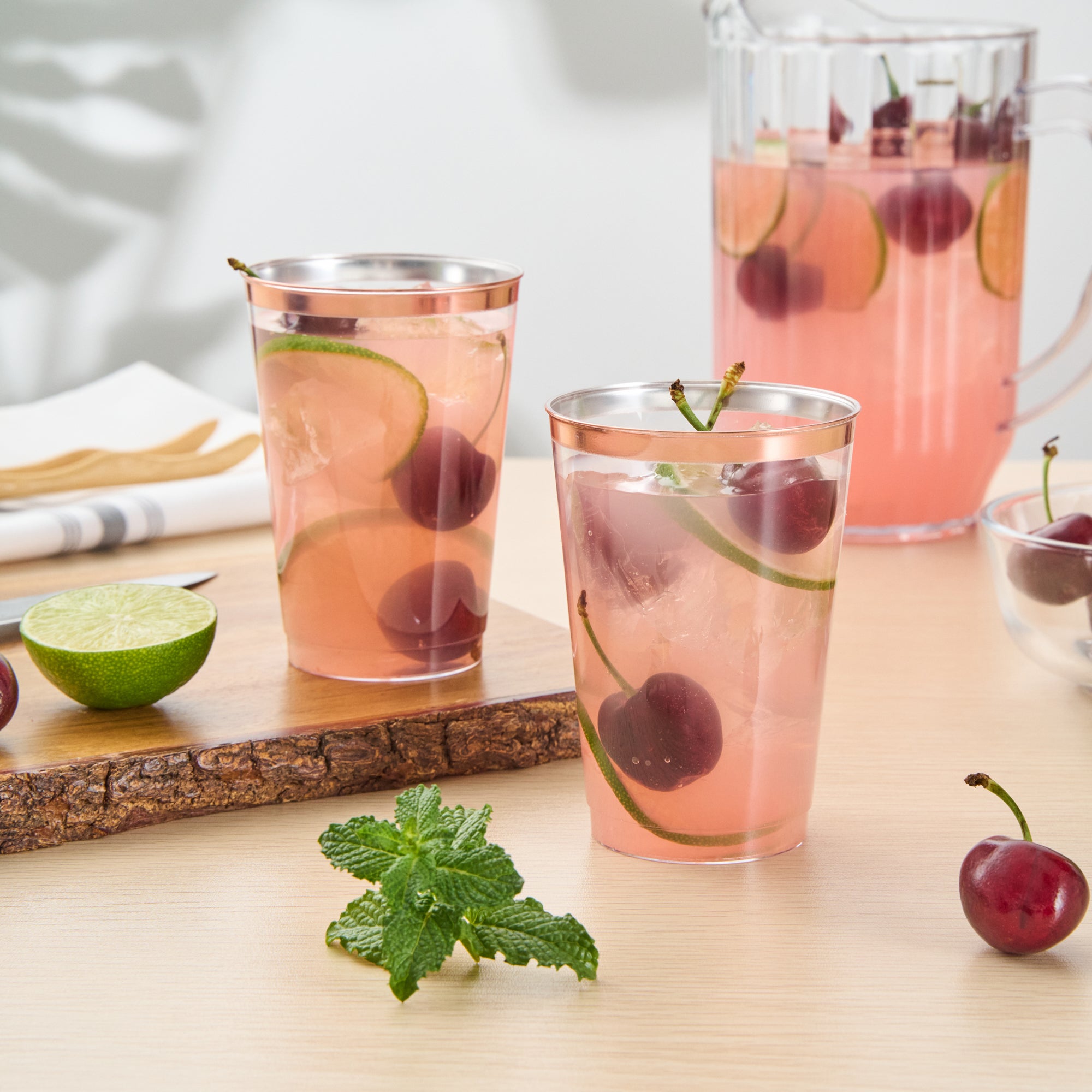 Elevate your events with sophistication with our Chef 101 12-ounce Clear Plastic Tumblers. These clear glasses with their rose gold rim complements upscale settings such as weddings and soirees. Made from hard and durable PS plastic, these plastic glasses offer the convenience of being disposable, reducing post-event cleanup. The sparkling design on these plastic glasses introduces a festive touch to any occasion, turning regular drinks into dazzling presentations, ideal for cocktails and desserts. With their cold food-friendly feature, these rose gold plastic tumblers ensure your creations are served in style. At 12-ounce capacity, these disposable glasses measure 3 inches in diameter and 4.3 inches in height, and are perfectly sized for a variety of beverages and treats at weddings, birthdays, and parties. Sold in a 500 count box.
