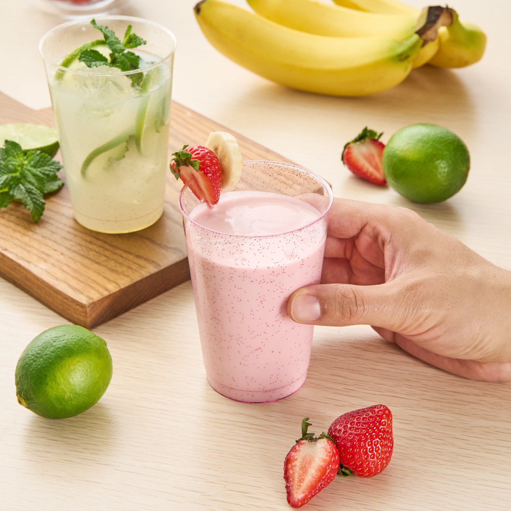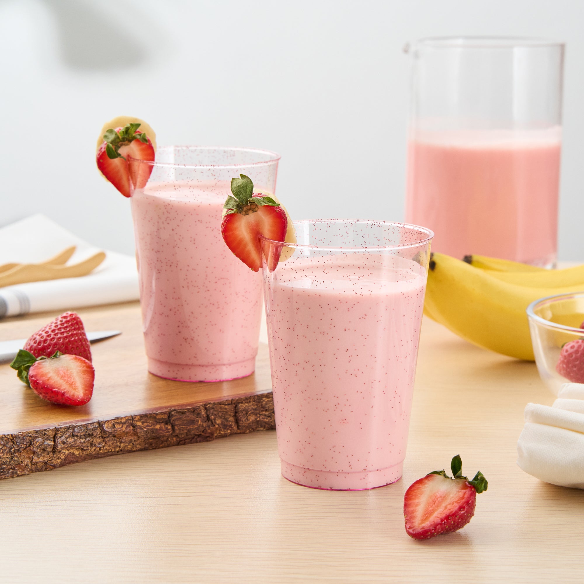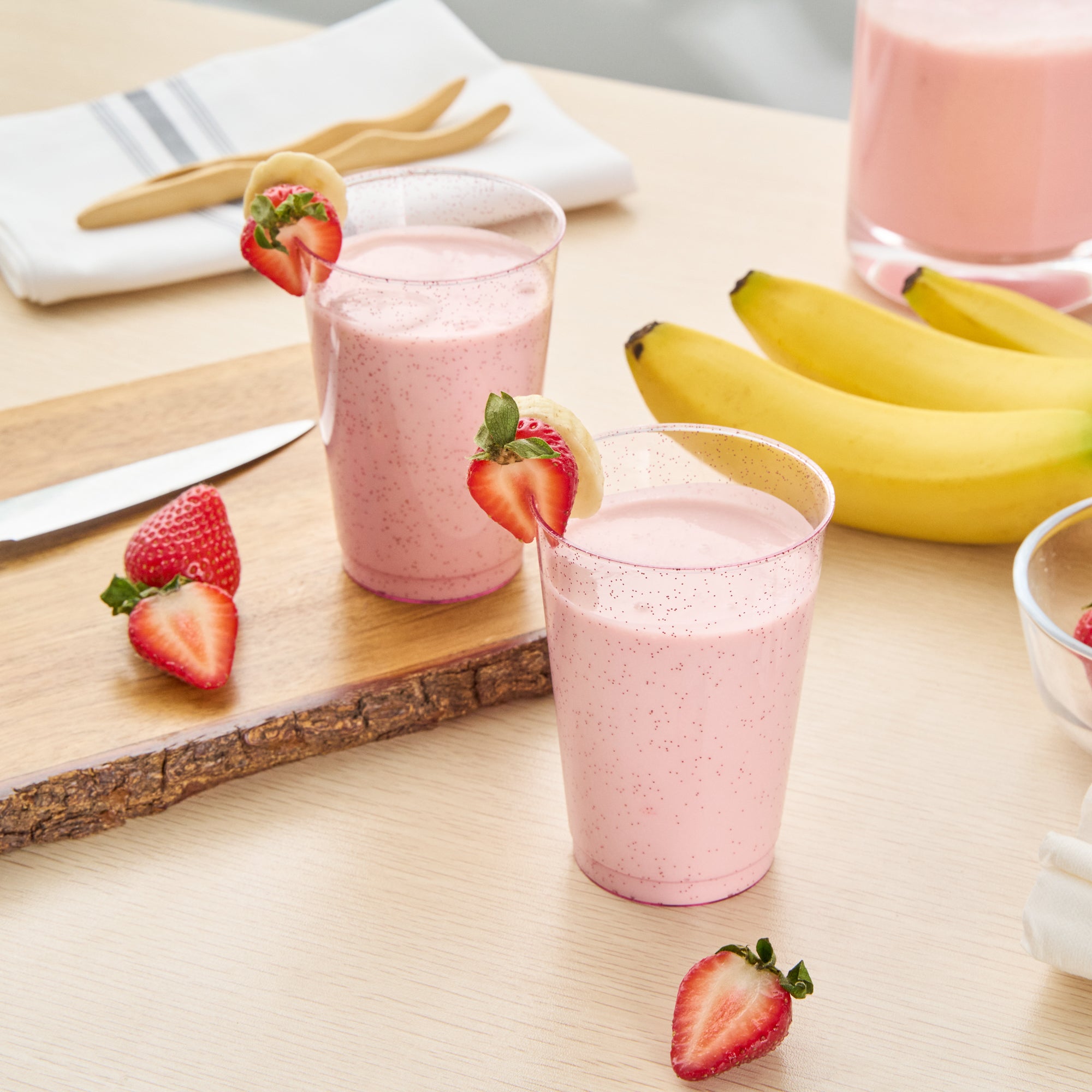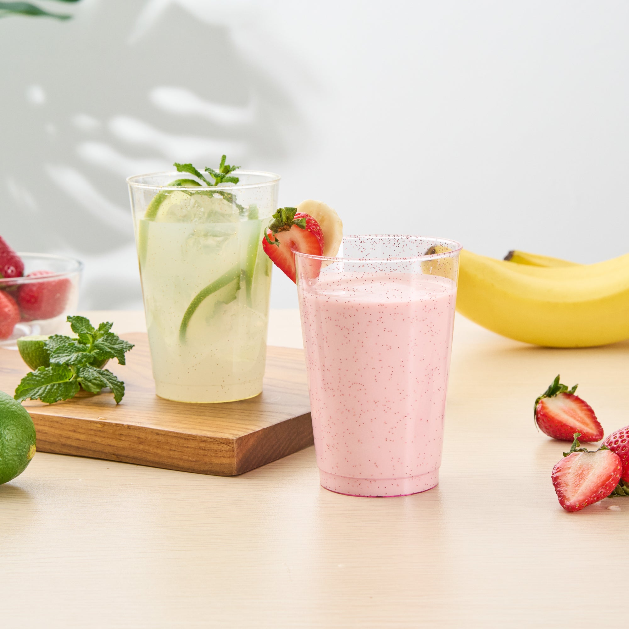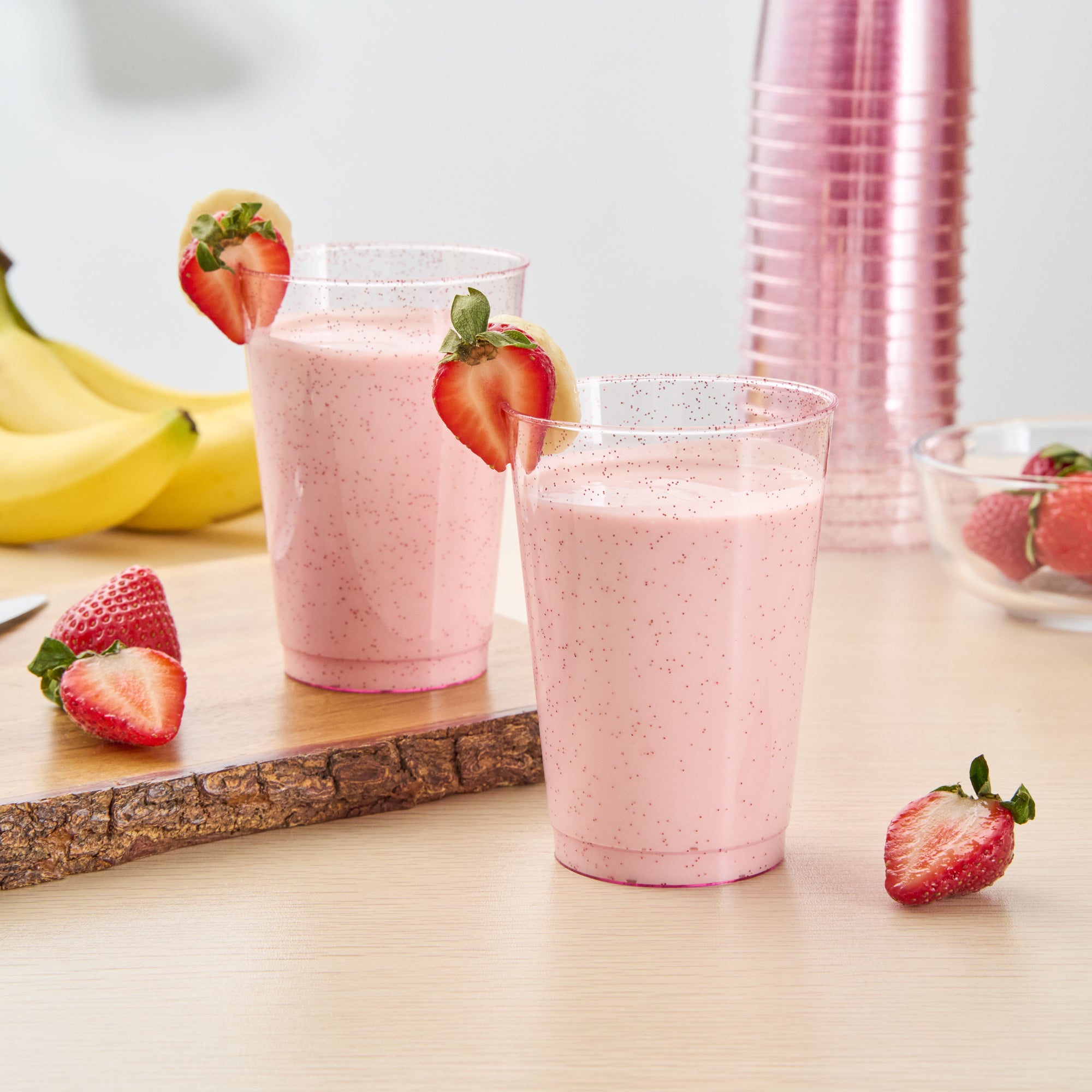 Add a touch of dazzle to your events with our Chef 101 12-ounce Pink Glitter Plastic Tumblers. These party cups feature a striking pink hue infused with elegant glitter accents that enhance any holiday gathering's festive appeal. Crafted from durable PS plastic, these glitter plastic cups are disposable, ensuring convenience for various occasions such as weddings, birthdays, or family reunions. The cold food-friendly design makes these glitter finish cups ideal for chilling desserts or serving cold beverages. Plus, the recyclable feature of these cocktail cups supports eco-conscious catering services. Pairing beautifully with any drink color, these pink disposable cups will refine and elevate the presentation of your bar service. Experience the perfect blend of style and practicality with these 12-ounce disposable plastic glasses that measure 3 inches in diameter and 4.3 inches in height. Sold in a 500 count box.