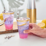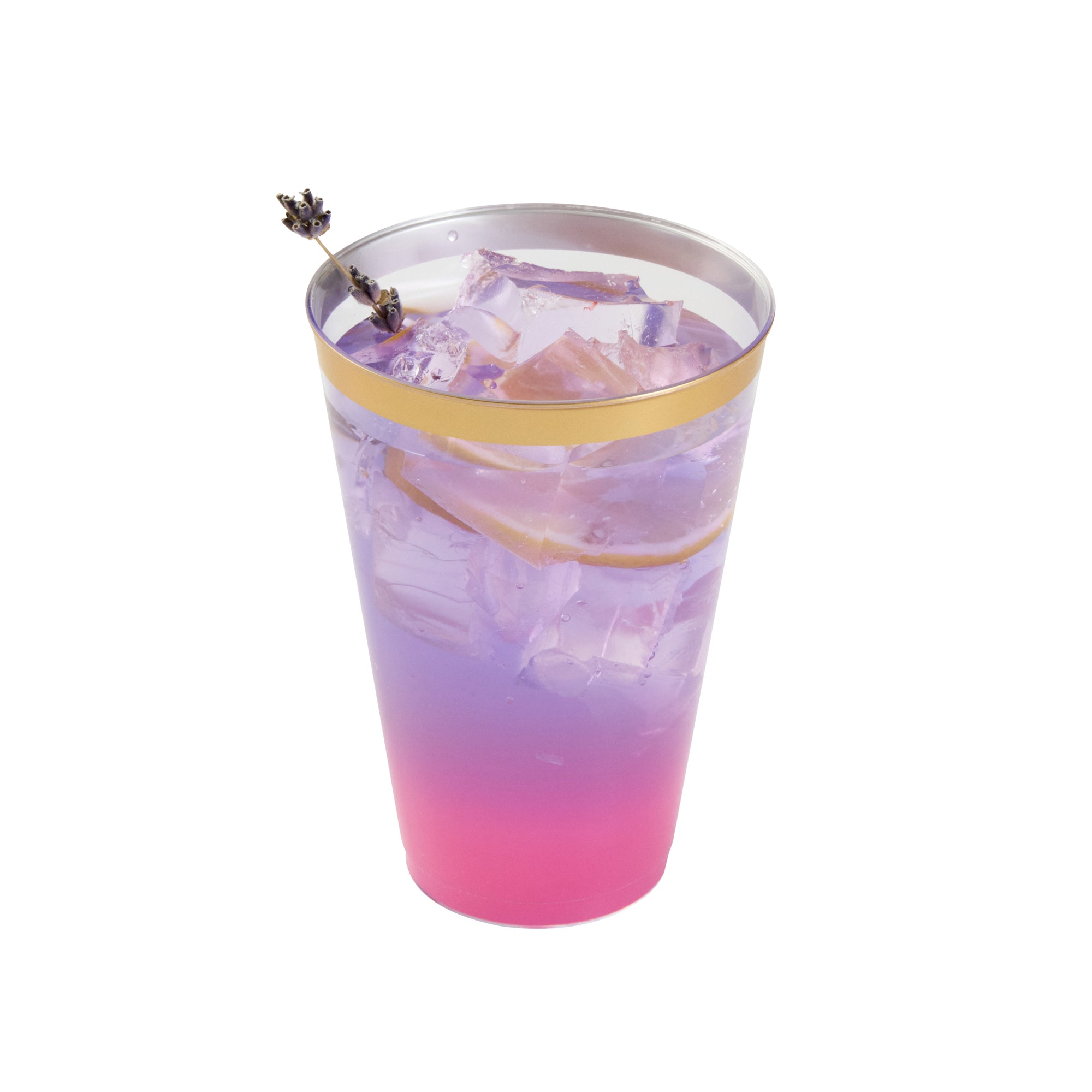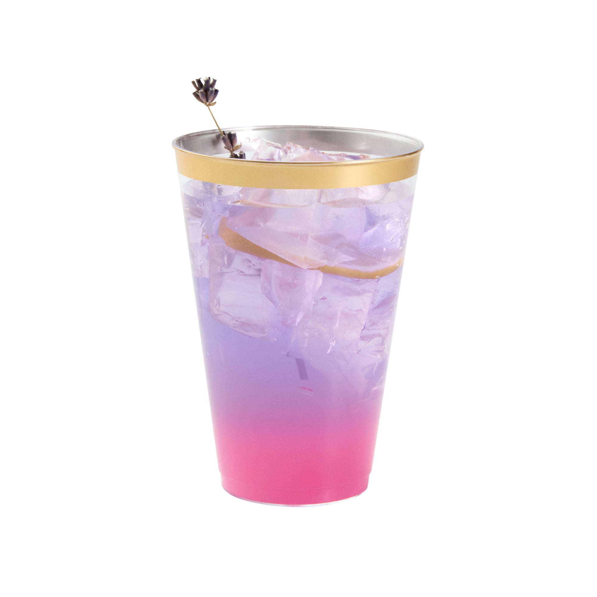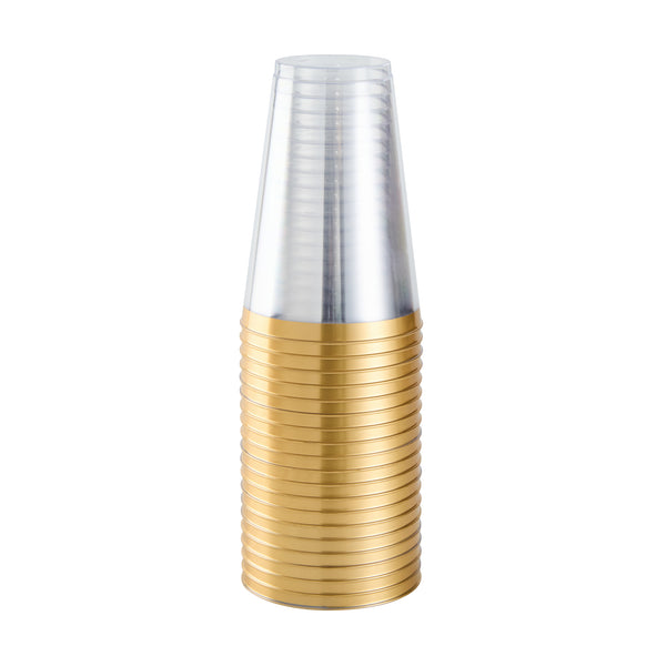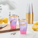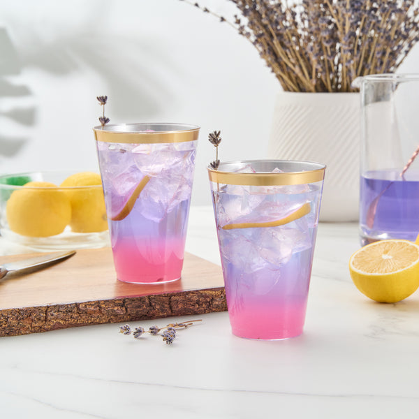 Add sparkle to your service with our Chef 101 14-ounce Clear Plastic Tumblers. The sturdy cups are made from hard and durable PS plastic and boast a glamorous gold rim design, enhancing festive beverage presentations at weddings, birthdays, and parties. Disposable and recyclable, these clear glasses are an eco-conscious yet convenient solution that minimize post-event labor. With a generous 14 ounce capacity, these cold-friendly plastic cups can accommodate cocktails, punches, and juices. Plus, the durable surface of these plastic glasses seamlessly supports high-volume service. Secure these attractive and operationally efficient 14-ounce gold rim cups that measure 3.3 inches in diameter and 4.8 inches in height. Sold in a 20 count box.