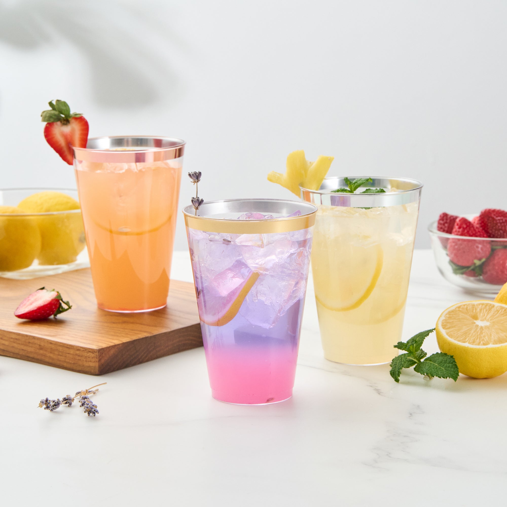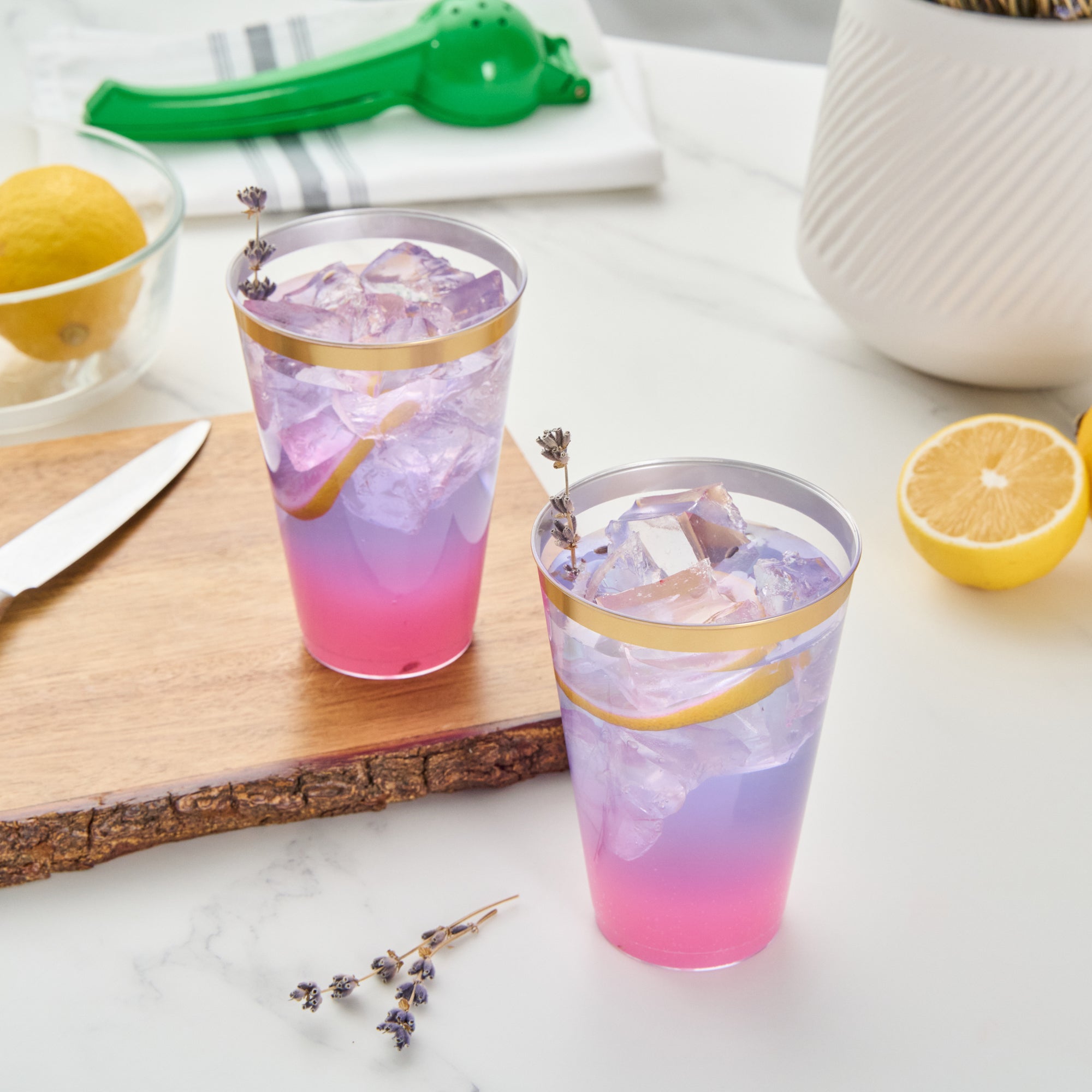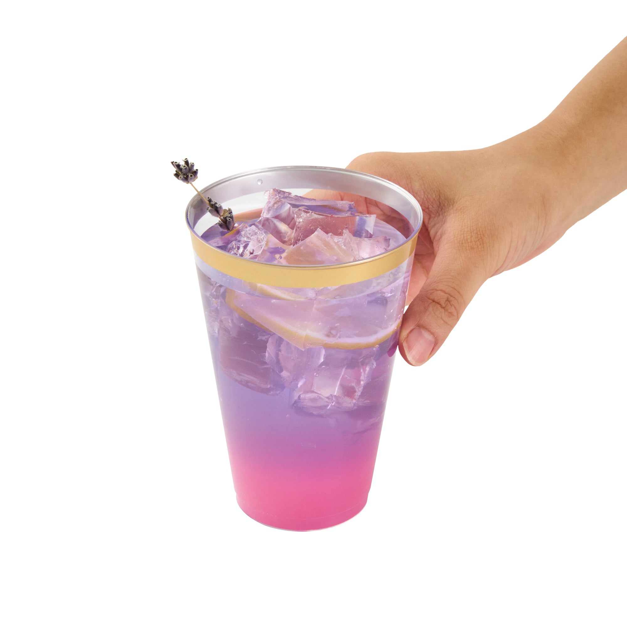Add sparkle to your service with our Chef 101 14-ounce Clear Plastic Tumblers. The sturdy cups are made from hard and durable PS plastic and boast a glamorous gold rim design, enhancing festive beverage presentations at weddings, birthdays, and parties. Disposable and recyclable, these clear glasses are an eco-conscious yet convenient solution that minimize post-event labor. With a generous 14 ounce capacity, these cold-friendly plastic cups can accommodate cocktails, punches, and juices. Plus, the durable surface of these plastic glasses seamlessly supports high-volume service. Secure these attractive and operationally efficient 14-ounce gold rim cups that measure 3.3 inches in diameter and 4.8 inches in height. Sold in a 20 count box.