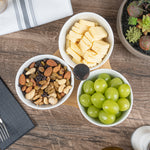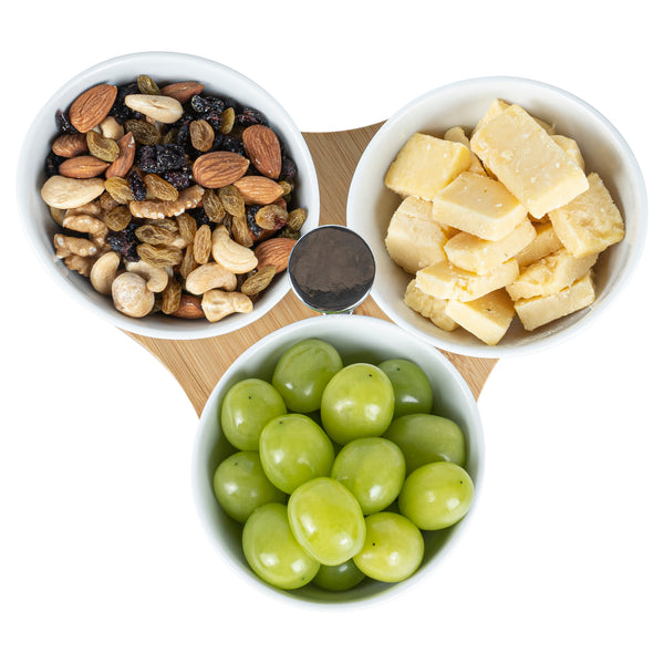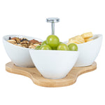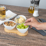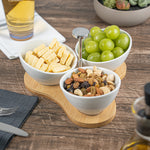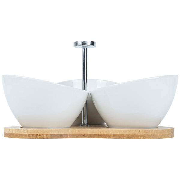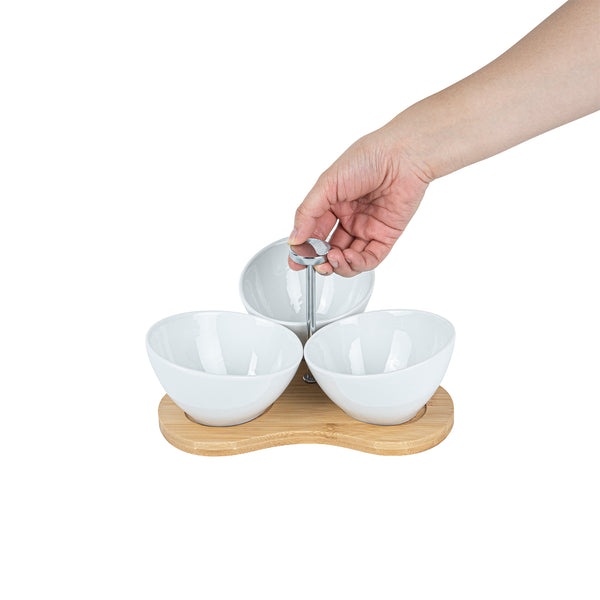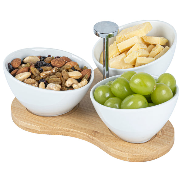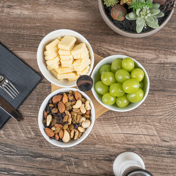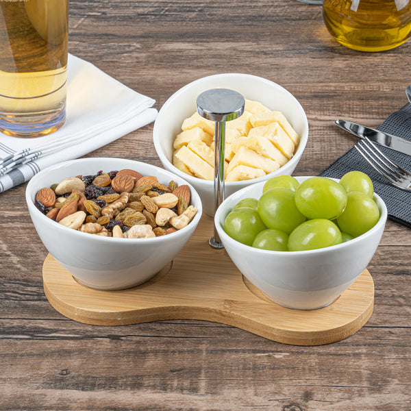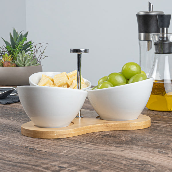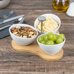 Create an eye-catching food display with our Chef 101 15-ounce Rectangle White Porcelain Incline Bowl Set. Featuring 3 porcelain bowls and a charming bamboo tray, this serving bowl set bring a one of a kind look to gourmet bites from your bistro, restaurant, catering event, and more. Crafted from sustainable bamboo, this nature-friendly serving tray is durable and sturdy to support the weight of food filled bowls. These white porcelain bowls are chip-resistant and perfect for serving hot or cold food items. Microwave-safe and oven-safe, these serving bowls are designed to meet with various culinary meets. These appetizer bowls are dishwasher-safe and freezer-safe so you can cleanup efficiently and store your leftovers. Measuring 8.75 inches long by 8 inches wide by 5 inches tall, this bowl and tray set have a capacity of 15 ounces. Sold in a 1 count box.