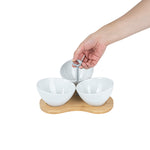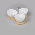 15 OZ WHITE PORCELAIN INCLINE BOWL SET - 3 BOWLS, BAMBOO TRAY