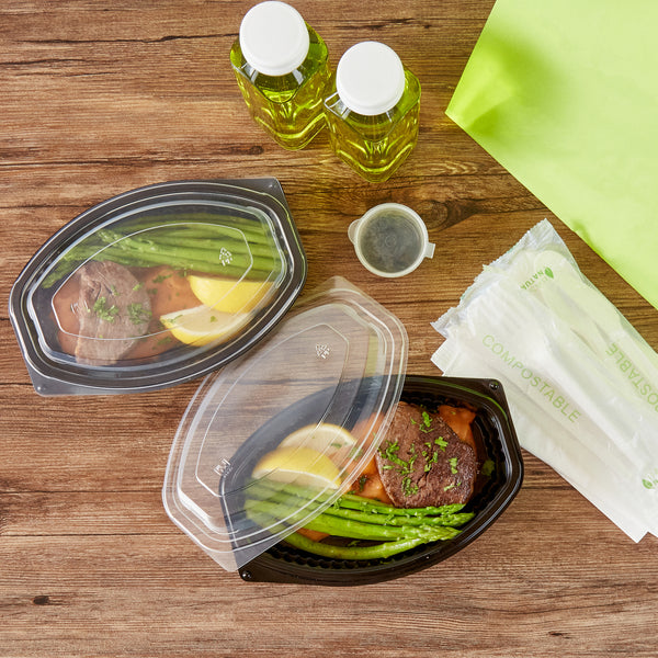 Elevate your foodservice presentation with our Chef 101 16-ounce Oval Black Plastic Food Containers. These plastic food containers come with a secure clear plastic lid and seal tightly to reduce spills during transportation. The flat design of these plastic lids allows for easy stacking and storing, maximizing space efficiency and ensuring secure transport. Designed for convenience, these take out containers are microwave-safe, letting customers reheat meals without needing additional utensils. Made from premium plastic, these to go containers can hold both hot and cold food items. These clear lids display the delicious contents inside, making them highly attractive to customers. The sleek black finish of these carry out containers adds a touch of sophistication to your takeaway meals, enhancing presentation. To store leftovers, these disposable food containers are freezer-safe and allow you to refrigerate your food for later use. Ideal for eco-conscious foodservice establishments, these takeaway containers are recyclable and help minimize your carbon footprint. These plastic containers with lids are disposable and can be thrown away after use, making cleanup easy. These food containers with lids measure 8 inches in length by 5.5 inches in width by 2.25 inches in height and have a capacity of 16 ounces. Sold in a 50 count box.