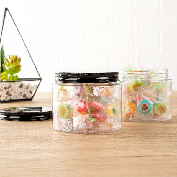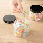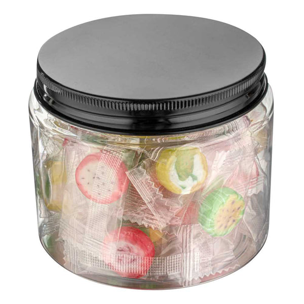 16 OZ CLEAR PLASTIC CANDY AND SNACK JAR - WITH BLACK ALUMINUM LID
