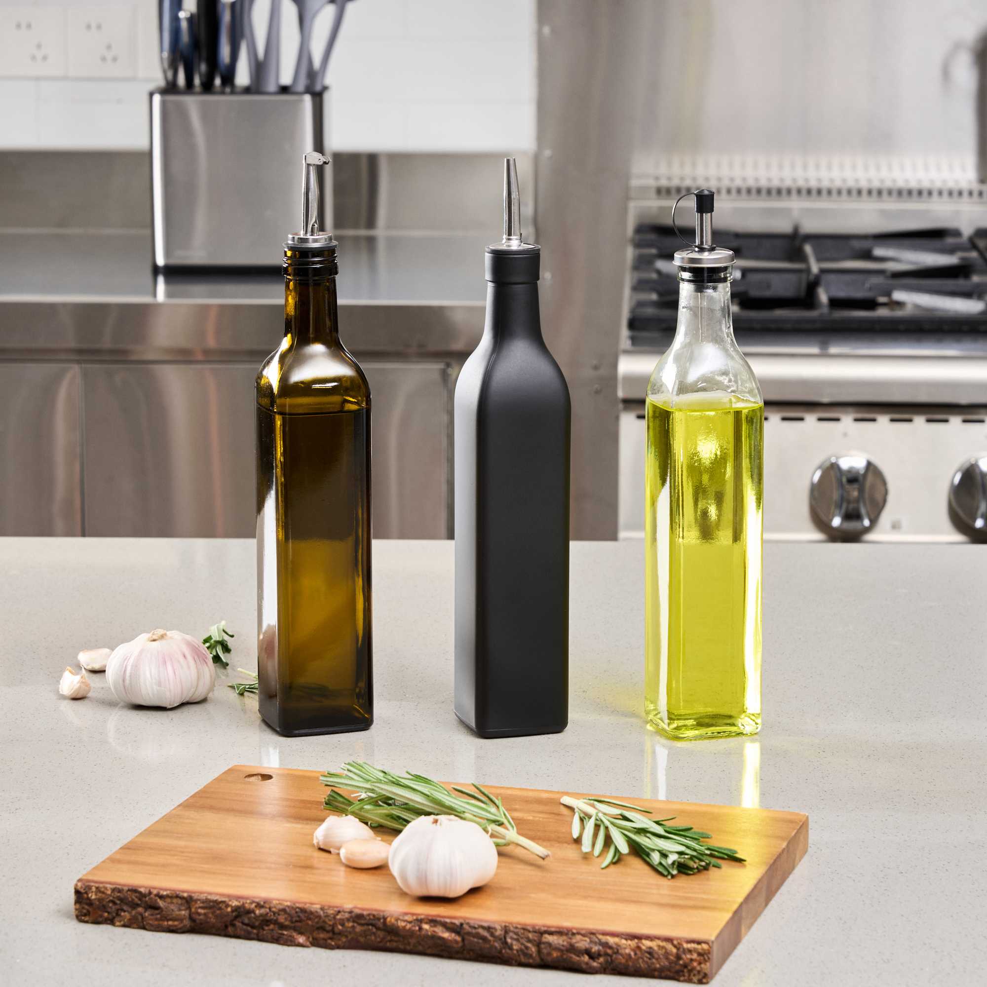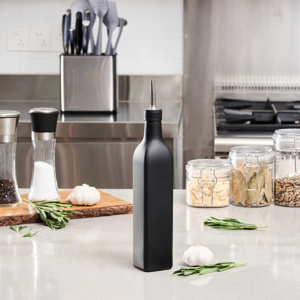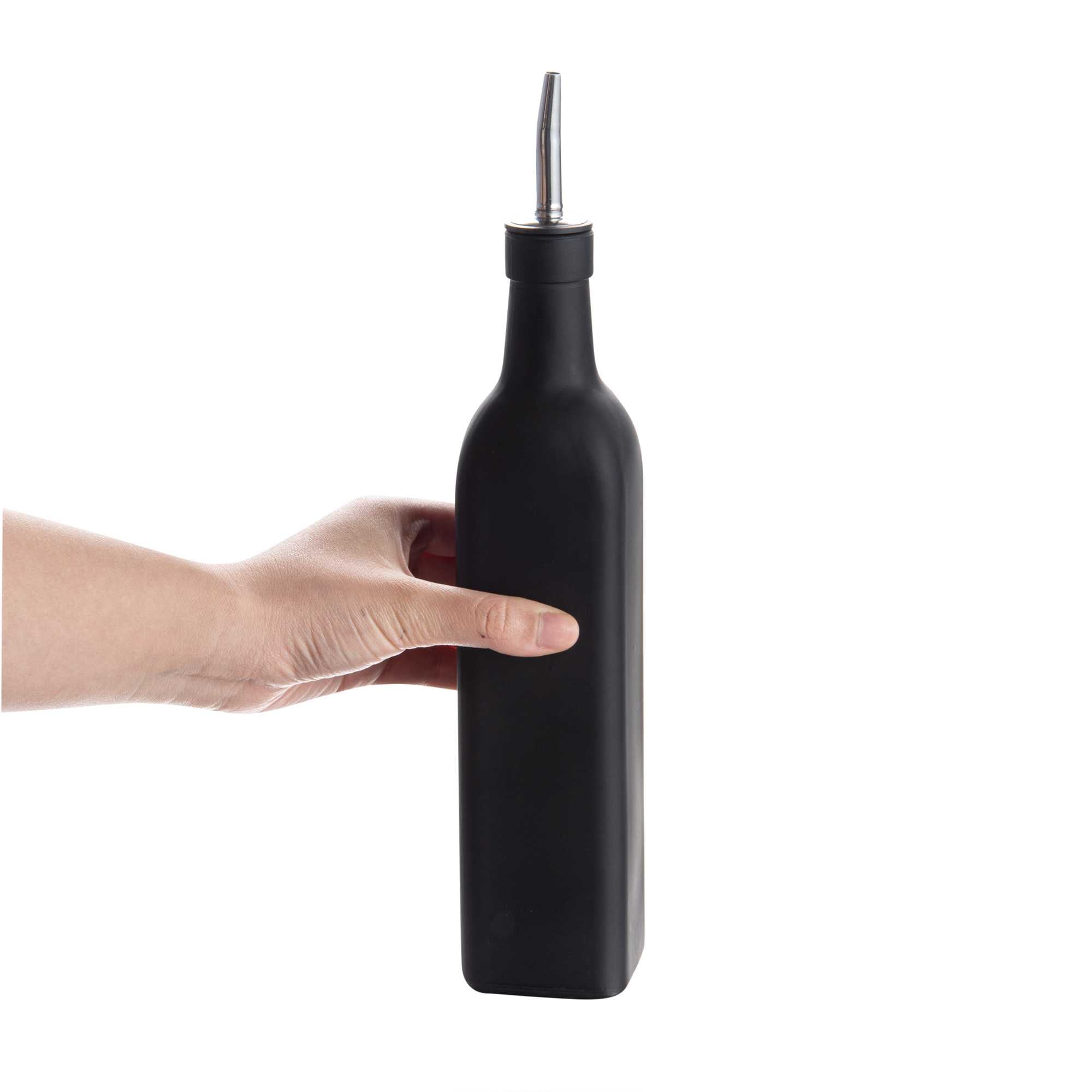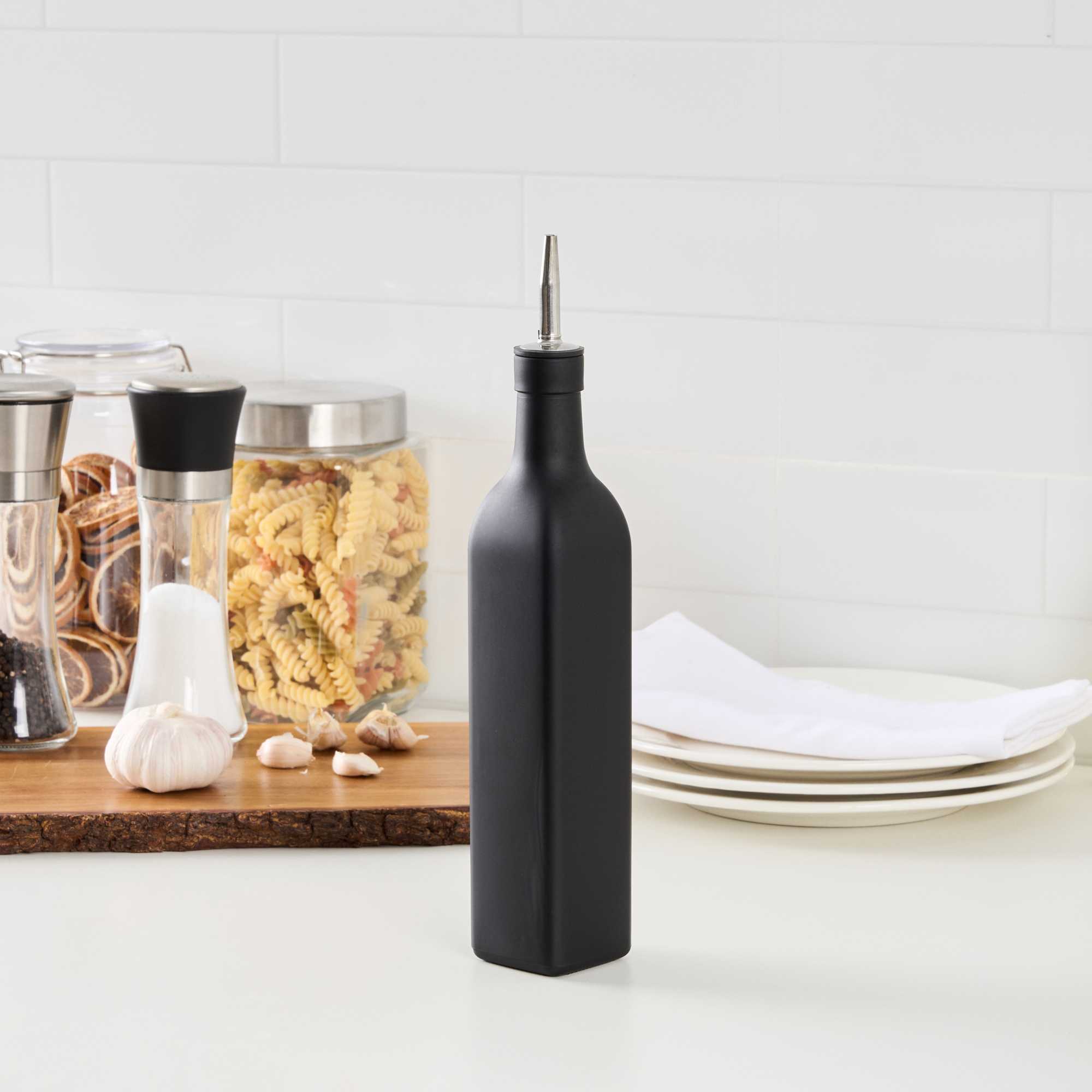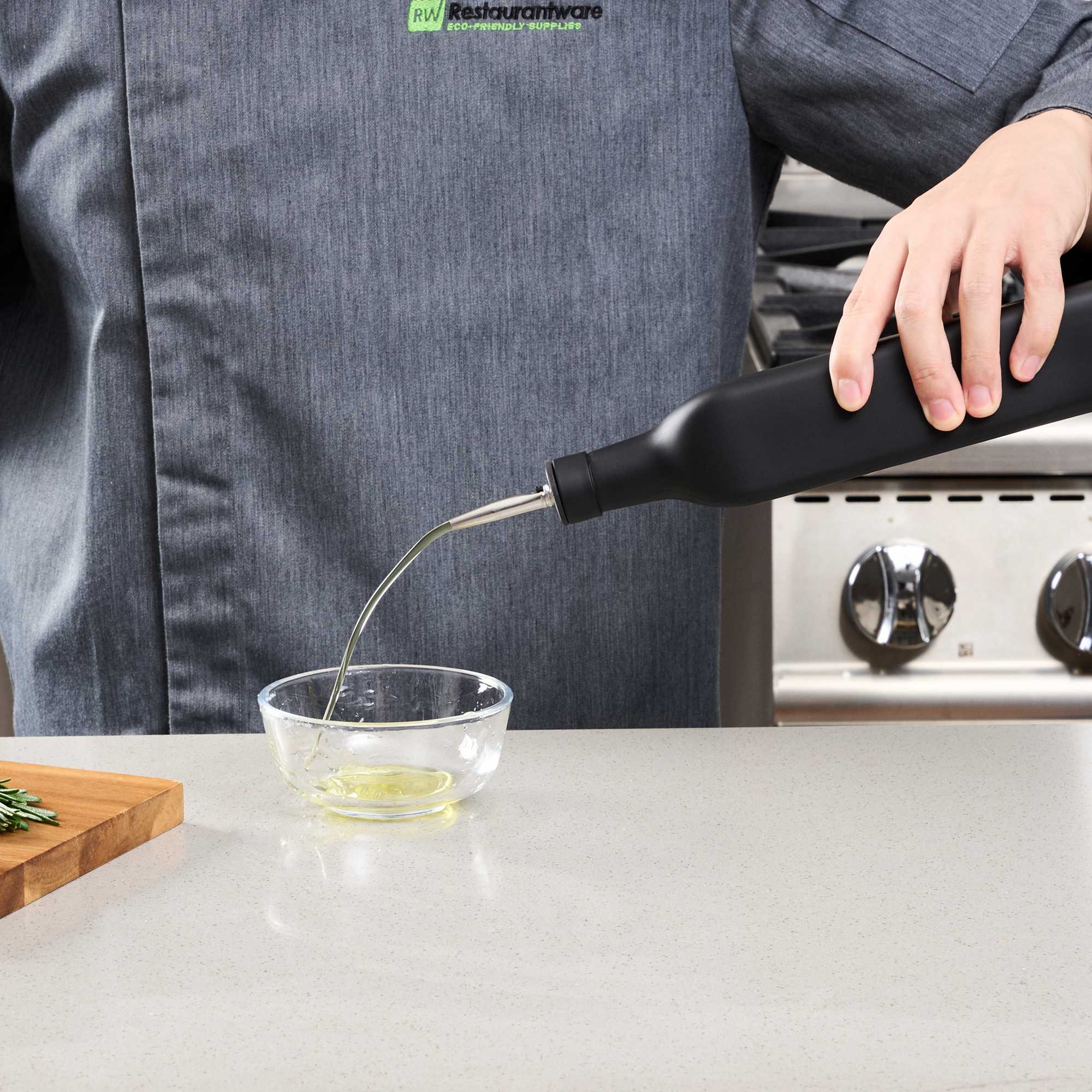 Drizzle vinegar on salads with our Chef 101 16.9-ounce Black Glass Olive Oil Dispenser. Featuring a matte black finish, this oil and vinegar bottle adds a touch of elegance to your already stylish tablescapes and makes it difficult for light to reach into the bottle and ruin the oil's potency. With a stainless steel pourer, this oil dispenser bottle won't leak liquids while pouring to avoid making a mess. Plus, it includes a funnel kit for smooth pouring. This cooking oil dispenser holds up to 16.9 ounces of vinegar or dressing. Measuring 12.4 inches tall by 2.4 inches wide, this oil bottle is the perfect size for placing on your restaurant's dining tables. Sold in a 1 count box.