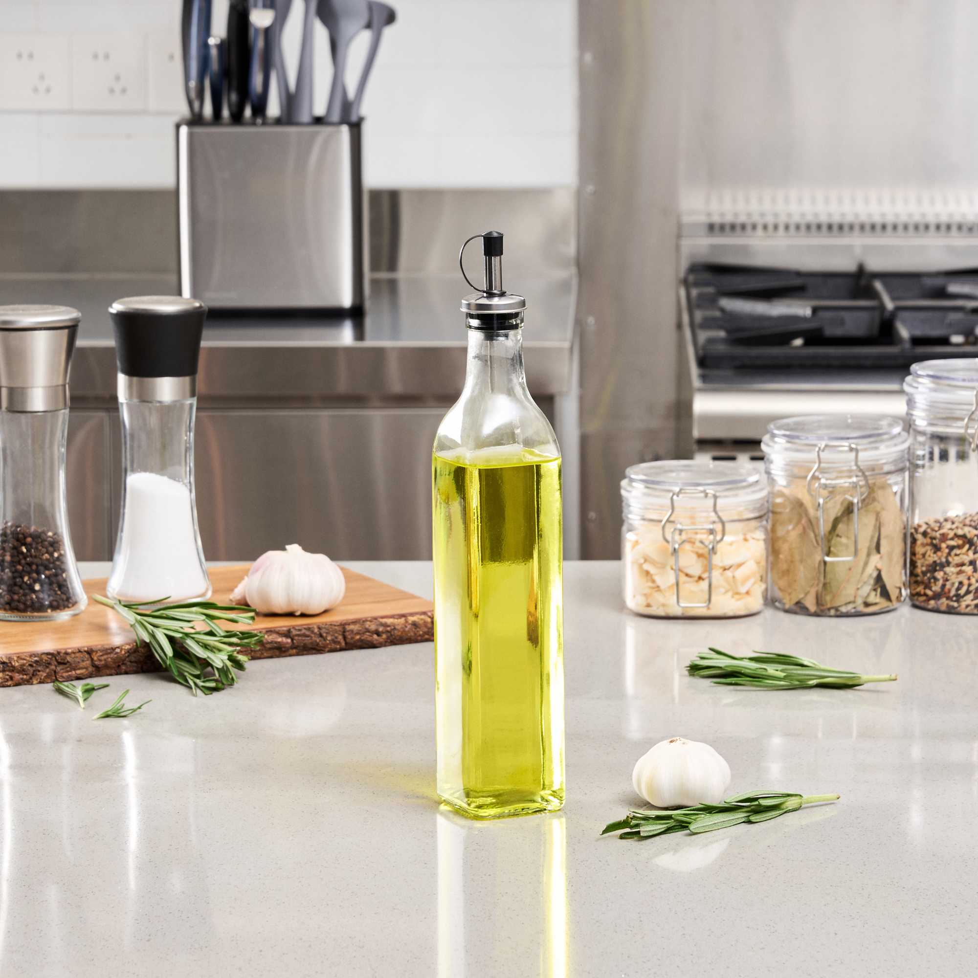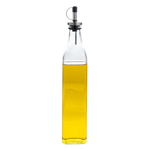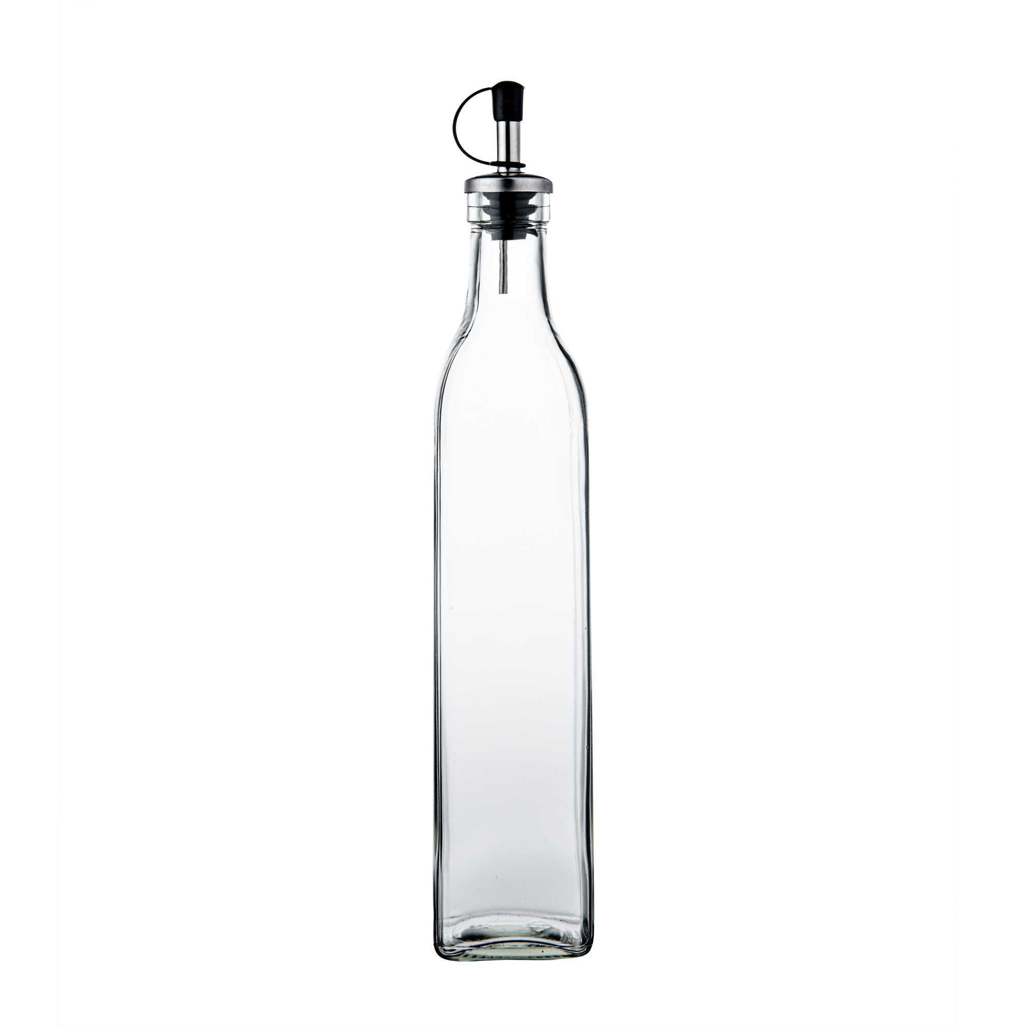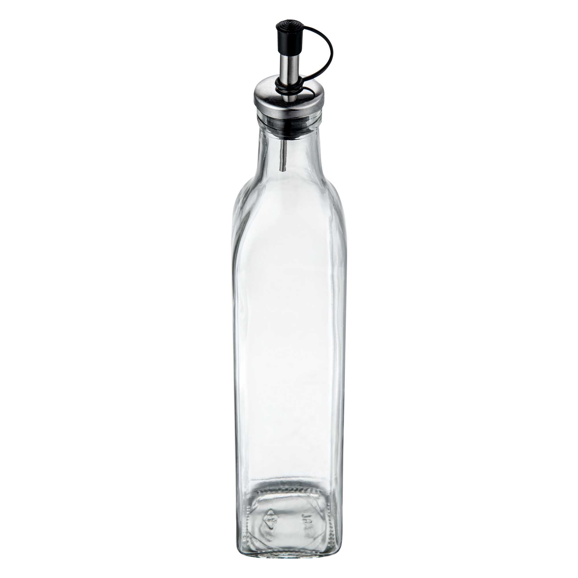 Easily add oil to pans while cooking with our Chef 101 16.9-ounce Glass Olive Oil Dispenser. Featuring a stopper spout, this oil bottle has a cap on the spout to keep liquids from accidentally pouring out. Plus, it includes a funnel kit for smooth pouring. With a crystal clear finish, this olive oil bottle allows you to keep an eye on the levels of the vinegar or oils inside so you can refill when running low. Perfect for restaurants or catering services, this olive oil container holds up to 16.9 ounces of your specialty dressings. This oil and vinegar dispenser measures 12.4 inches in height by 2.4 inches wide. Sold in a 1 count box.