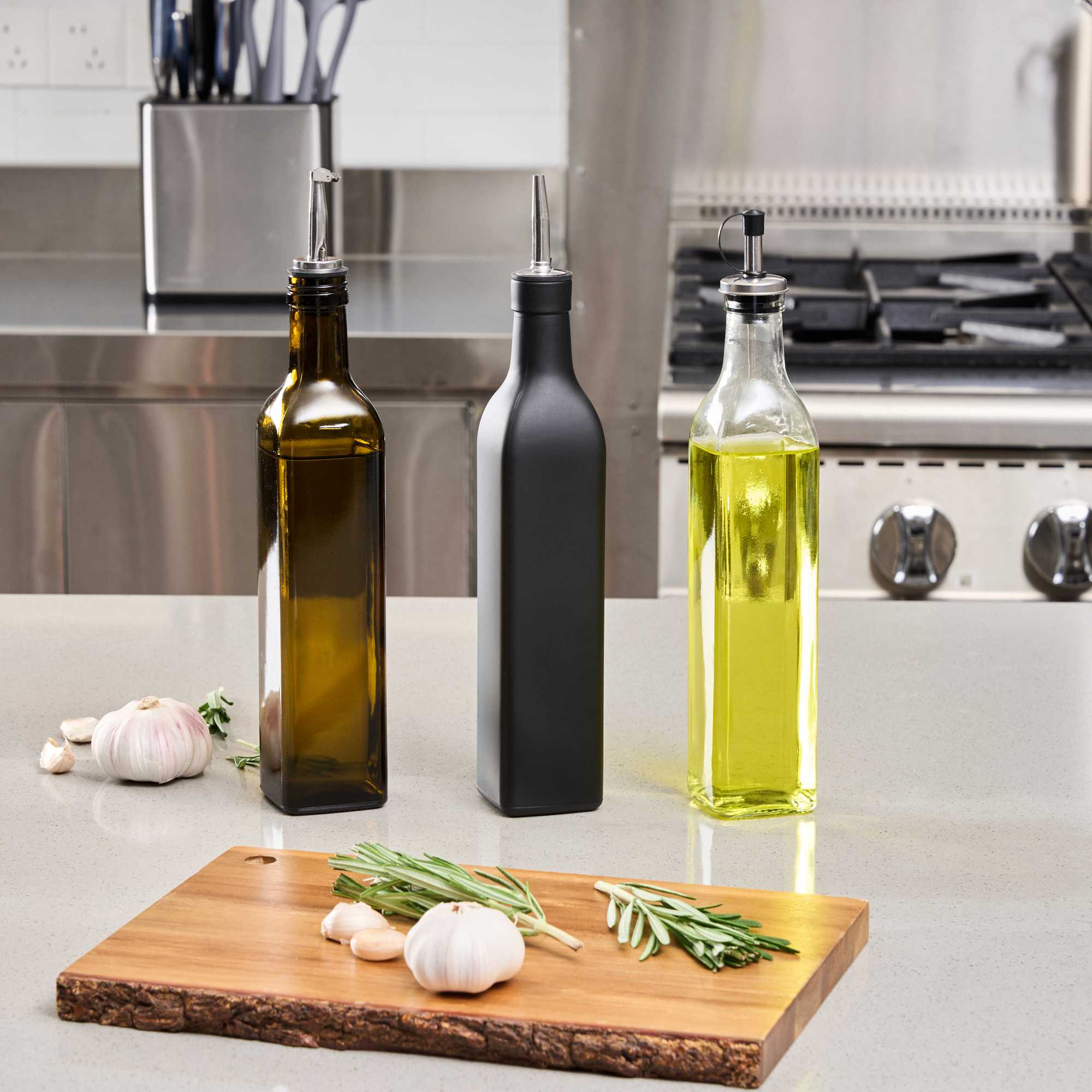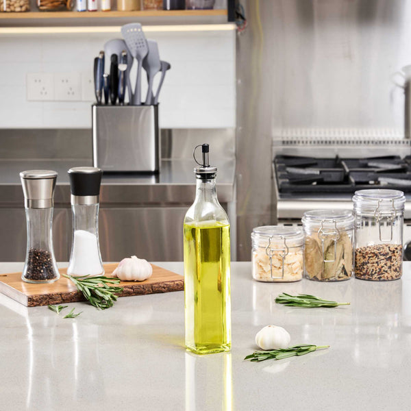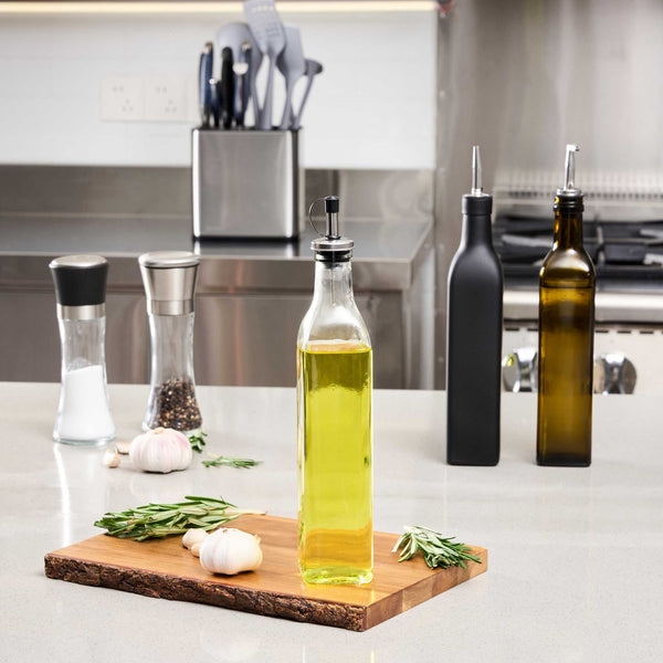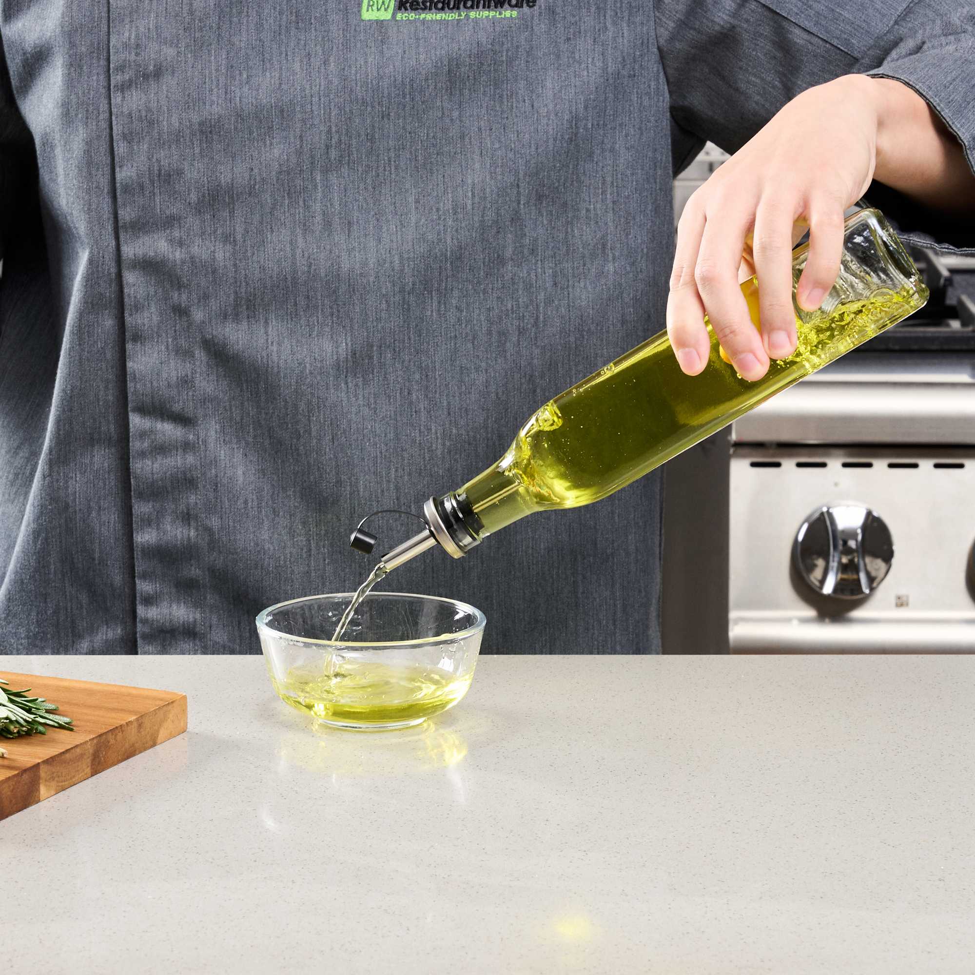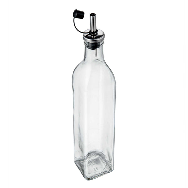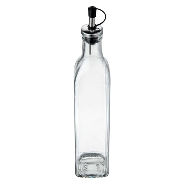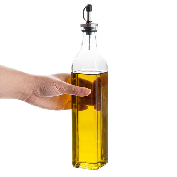 Easily add oil to pans while cooking with our Chef 101 16.9-ounce Glass Olive Oil Dispenser. Featuring a stopper spout, this oil bottle has a cap on the spout to keep liquids from accidentally pouring out. Plus, it includes a funnel kit for smooth pouring. With a crystal clear finish, this olive oil bottle allows you to keep an eye on the levels of the vinegar or oils inside so you can refill when running low. Perfect for restaurants or catering services, this olive oil container holds up to 16.9 ounces of your specialty dressings. This oil and vinegar dispenser measures 12.4 inches in height by 2.4 inches wide. Sold in a 1 count box.