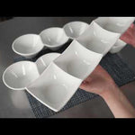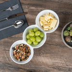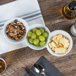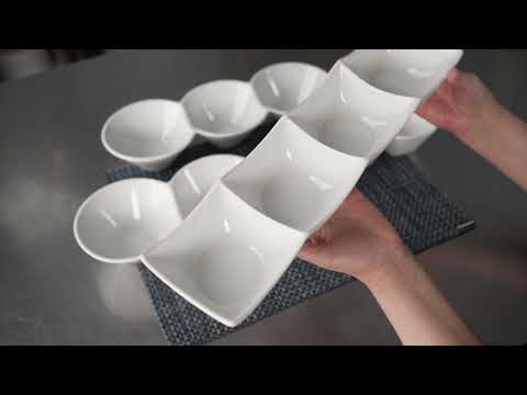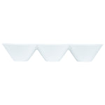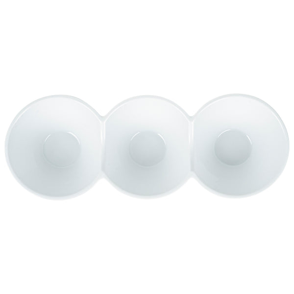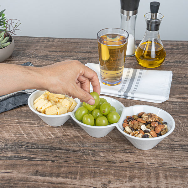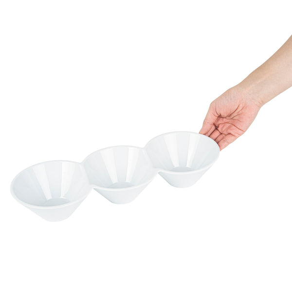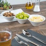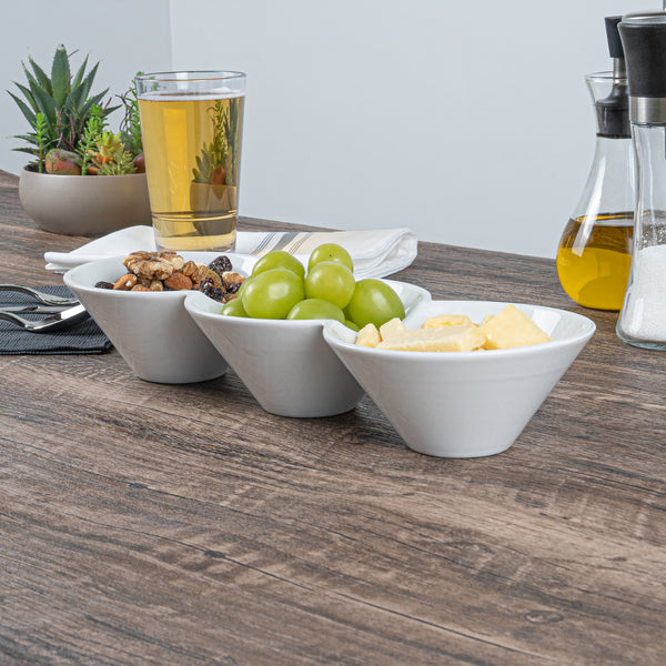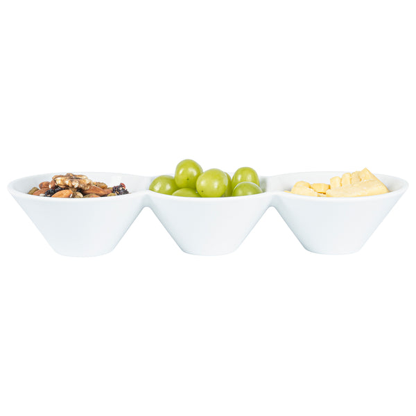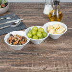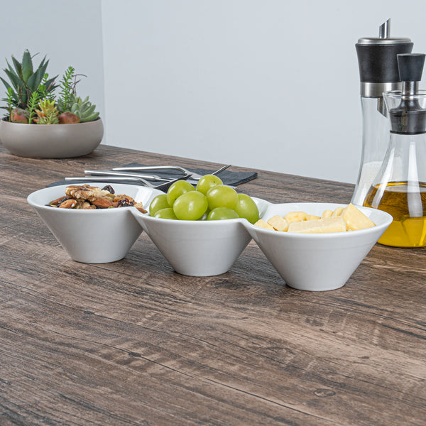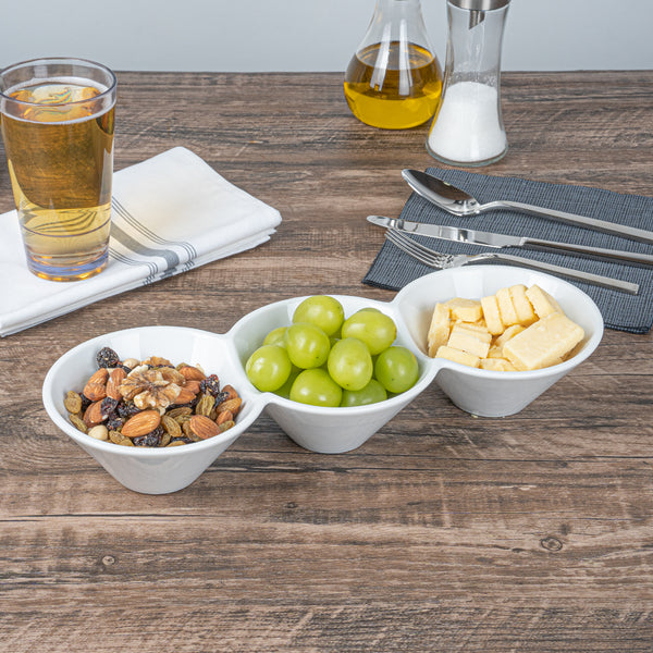 Creatively serve small bites with our Chef 101 Triplets Collection Modern Bowl Set. Designed with 3 connected porcelain bowls, these chic serving dishes showcase sweet and savory treats with style. Constructed from premium porcelain, these durable white serving platters are conveniently microwave and dishwasher-safe. This 18-ounce serving bowl set can be used to elegantly serve salty pretzels, chocolate covered almonds, mixed nuts, and more! These 18-oz food serving bowls measure 13.4 inches long by 4.9 inches wide and ship in a 1 count box.