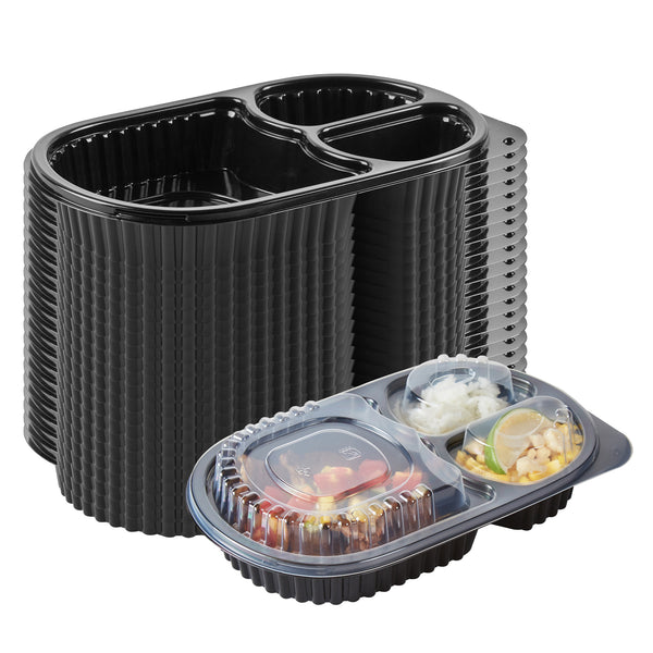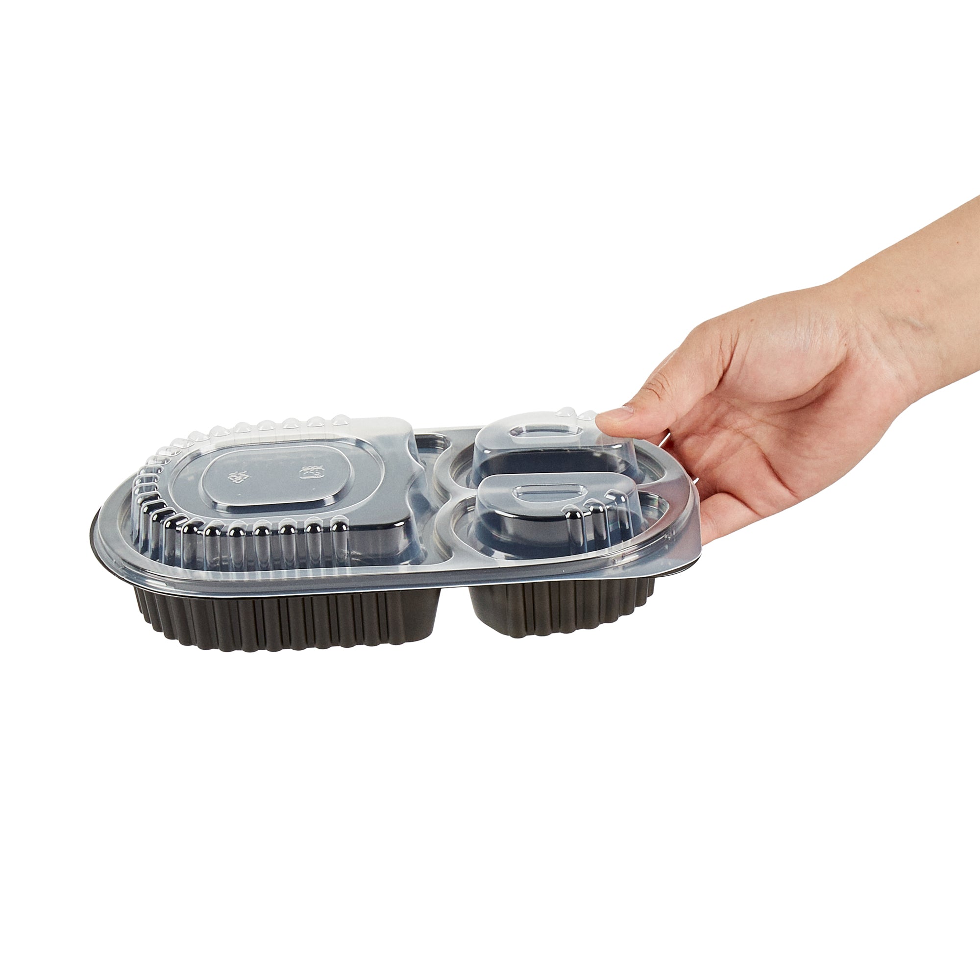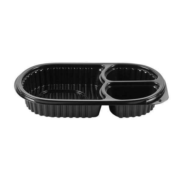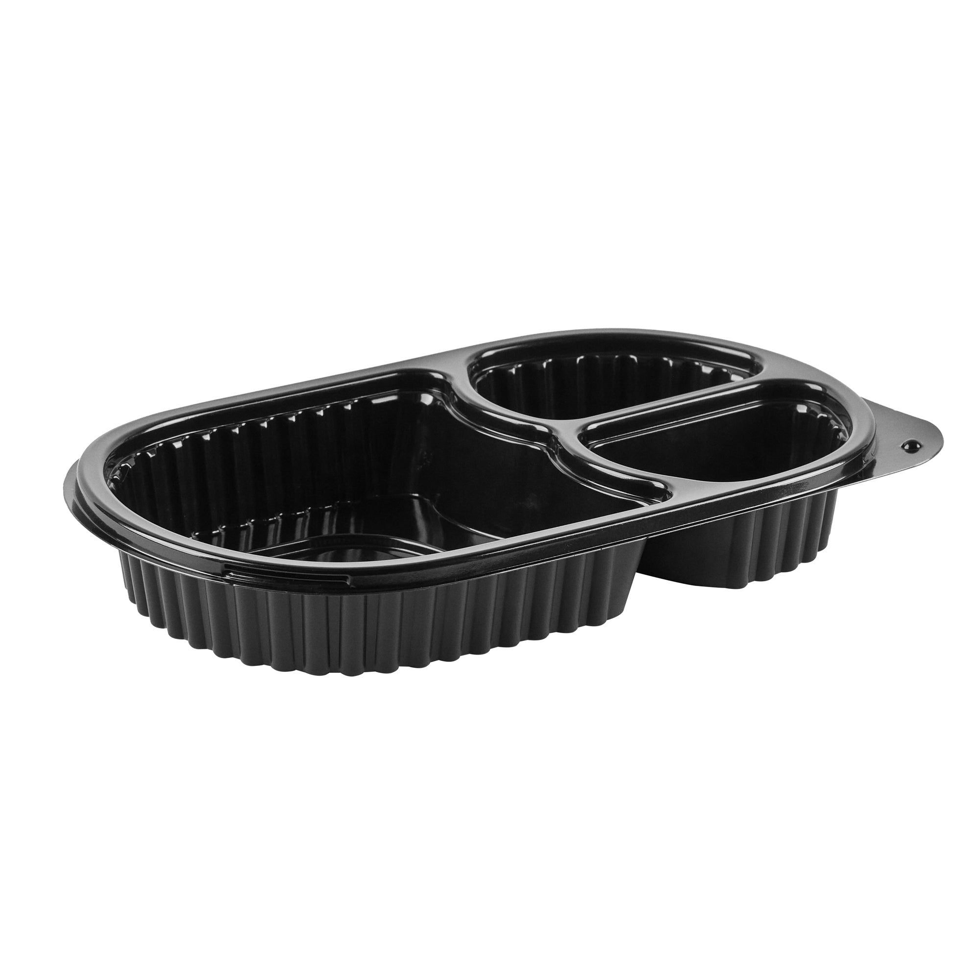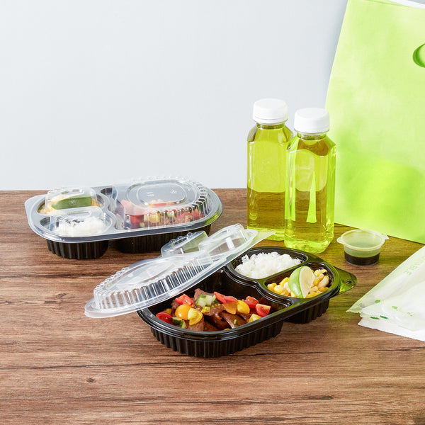 Elevate your meal presentations with our Chef 101 19-ounce Oval Black Plastic 3 Compartment Food Containers. These to go containers feature 3 compartments, allowing you to pack different foods separately and preserve their individual flavors and textures. The included lid of these take out containers forms a secure seal and prevents spills in transit, ensuring your dishes arrive intact. Designed to be microwave-safe, these plastic containers with lids allow customers to reheat meals without changing utensils, adding to their convenience. Crafted from durable plastic, these to go boxes are suitable for holding hot and cold food items. The clear lids of these plastic food containers ensure optimal visibility of their content and facilitate easy identification. These carry out containers have a sleek black finish and add a touch of sophistication to your takeaway meals. Suitable for leftover storage, these food containers with lids are freezer-safe. For eco-minded foodservice establishments, these takeaway containers are recyclable and help minimize your carbon footprint. To ensure an easy cleanup, these disposable food containers can be discarded after use. Measuring 9.25 inches in length by 6 inches in width by 2.25 inches in height, these take out boxes have a capacity of 19 ounces and provide ample space for a variety of dishes. Sold in a 50 count box.
