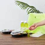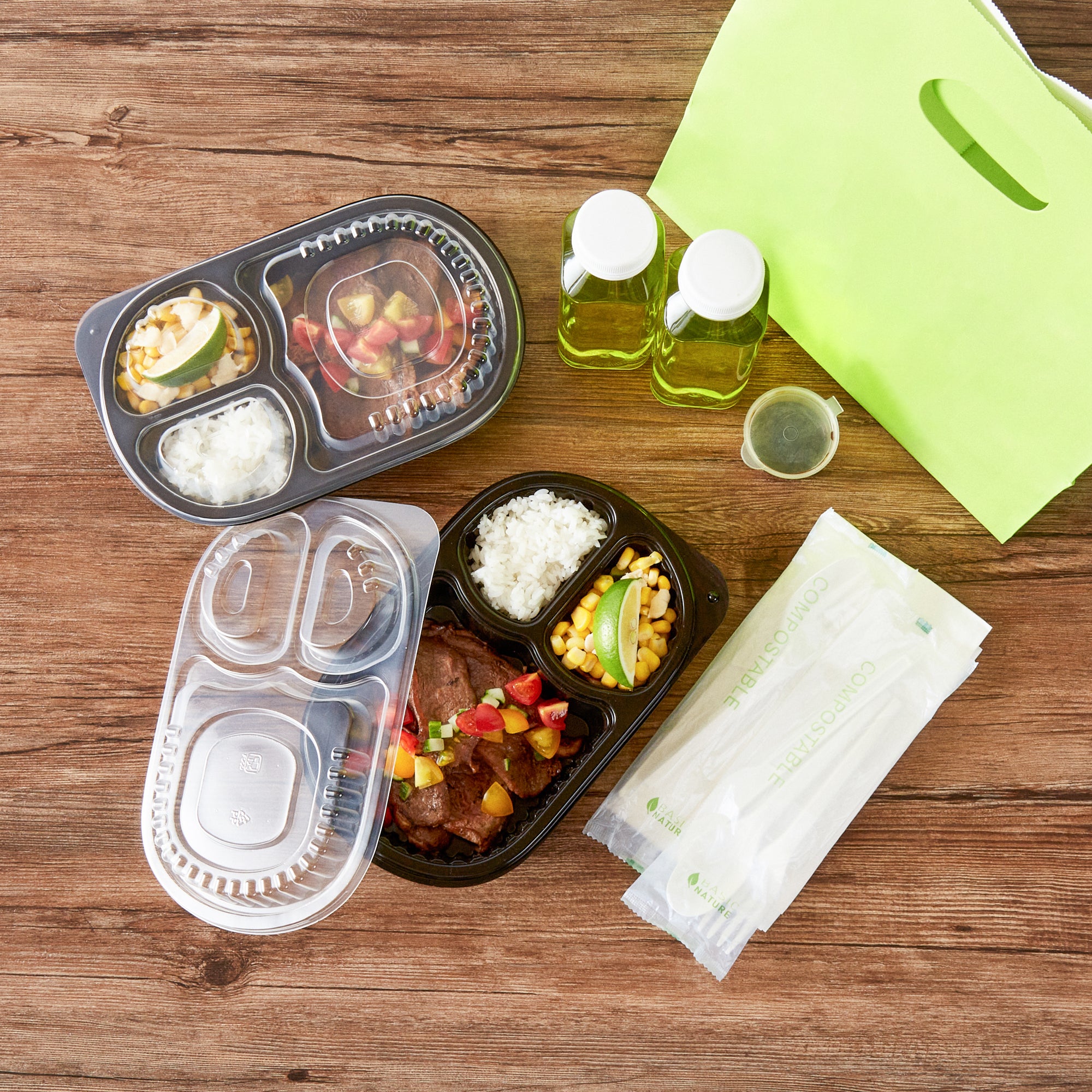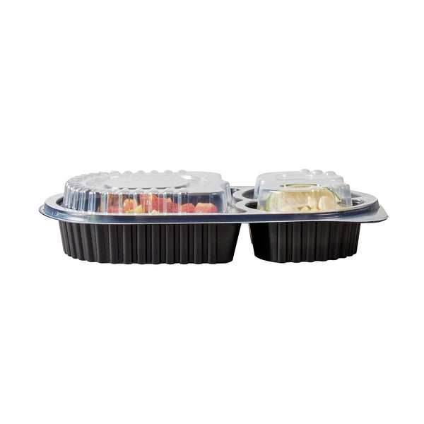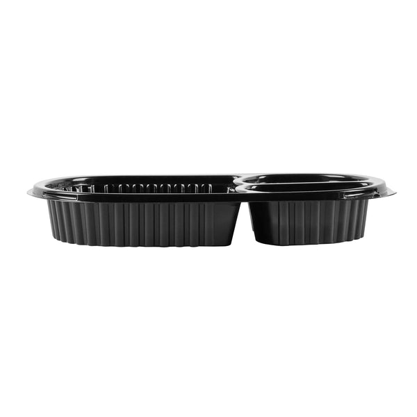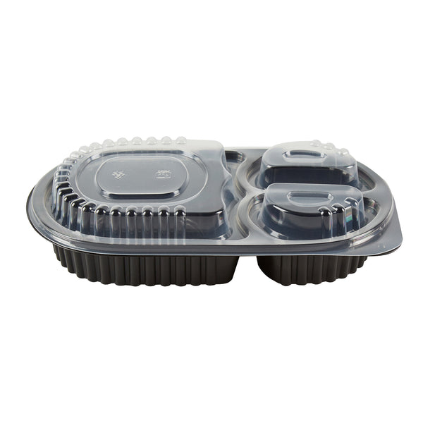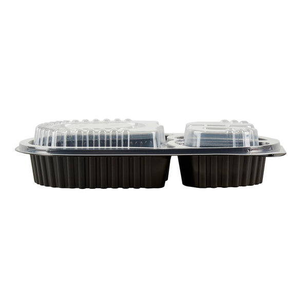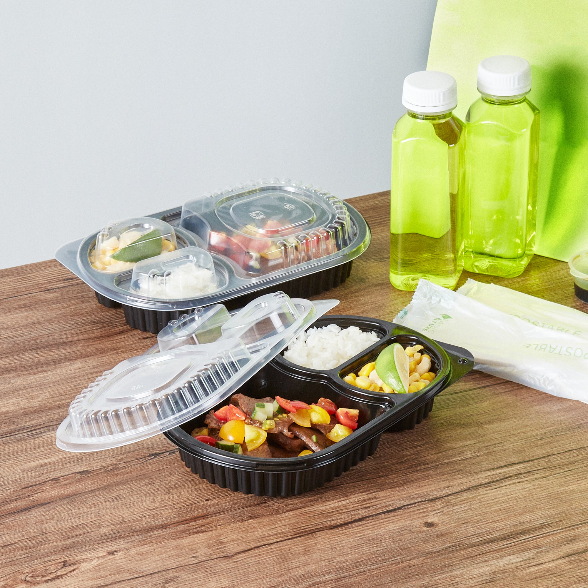 Elevate your meal presentations with our Chef 101 19-ounce Oval Black Plastic 3 Compartment Food Containers. These to go containers feature 3 compartments, allowing you to pack different foods separately and preserve their individual flavors and textures. The included lid of these take out containers forms a secure seal and prevents spills in transit, ensuring your dishes arrive intact. Designed to be microwave-safe, these plastic containers with lids allow customers to reheat meals without changing utensils, adding to their convenience. Crafted from durable plastic, these to go boxes are suitable for holding hot and cold food items. The clear lids of these plastic food containers ensure optimal visibility of their content and facilitate easy identification. These carry out containers have a sleek black finish and add a touch of sophistication to your takeaway meals. Suitable for leftover storage, these food containers with lids are freezer-safe. For eco-minded foodservice establishments, these takeaway containers are recyclable and help minimize your carbon footprint. To ensure an easy cleanup, these disposable food containers can be discarded after use. Measuring 9.25 inches in length by 6 inches in width by 2.25 inches in height, these take out boxes have a capacity of 19 ounces and provide ample space for a variety of dishes. Sold in a 50 count box.