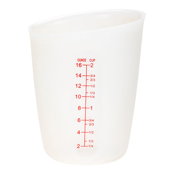 Accurately measure your ingredients with our Chef 101 2-Cup Silicone Measuring Cup. Featuring a high-quality silicone construction, this measuring cup has a flexible design and a textured surface that is easy to grip and comfortable to hold. Ideal for measuring ingredients for baking or pastry preparations, this easy-to-grip kitchen measuring cup allows you to safely pour melted chocolate, butter, and other wet ingredients. This flexible silicone measuring cup is microwave-safe and heat-resistant, making it versatile and easy to use. Constructed with built-in red measurement markers, this liquid measuring jug provides exact measurements to precisely calculate up to 16 ounces or 2 cups. This measuring jar is dishwasher-safe to simplify your cleanup process. With a sturdy, flat bottom, this heat-resistant measuring cup with marking reliably stands upright in microwaves or on countertops. This 2-cup measuring container measures 4.5 inches long by 3 inches wide by 5.75 inches tall. Sold in a 1 count box.