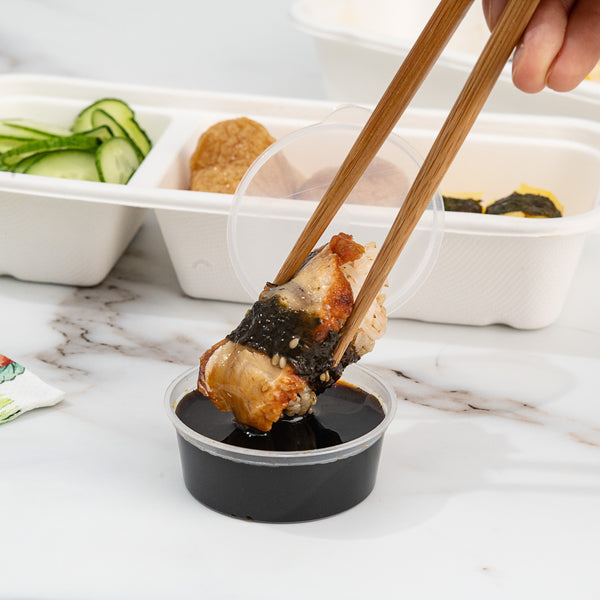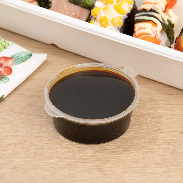 Serve precise amounts of condiments using our Chef 101 2-ounce Clear Plastic Portion Cups. Crafted with high-quality plastic, these plastic portion cups with lids are conveniently recyclable to quickly dispose of cups after use. These disposable small cups are designed with a hinged lid that securely snaps onto the rim of each cup to ensure a mess-free delivery. These small serving cups have a clear finish that instantly enhances your food presentations. Great for warming up sauces or toppings, these small serving cups are microwave-safe. These plastic portion cups with lids hold up to 2 ounces of your desired condiments. To store these cups in a space-saving manner, these disposable small cups are stackable. These small serving cups measure 2.87 inches in diameter by 1 inch in height. Sold in a 100 count box.
