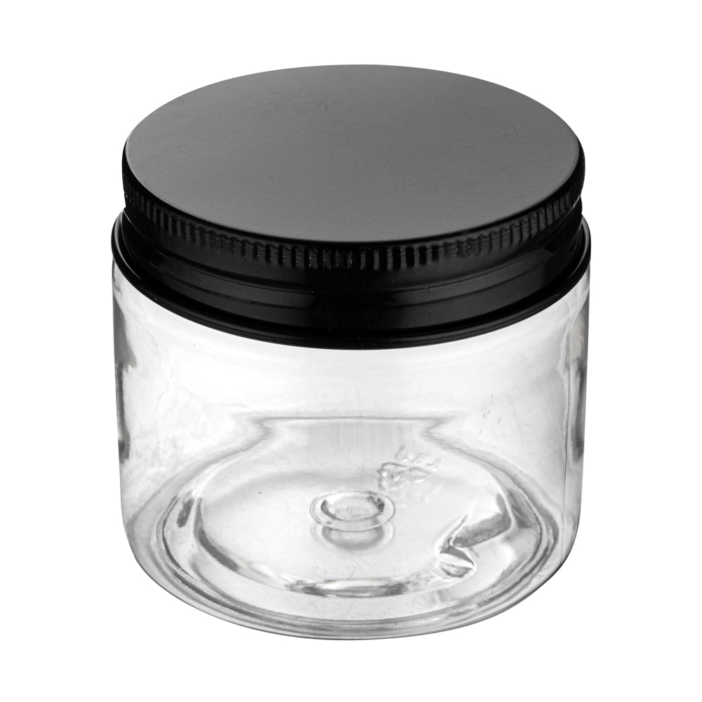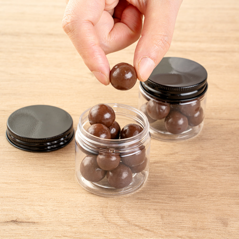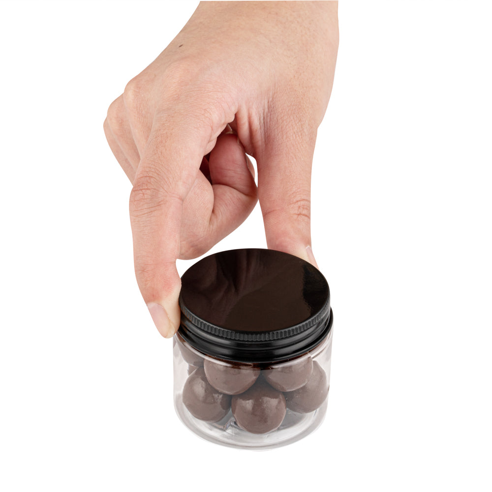 2 OZ ROUND CLEAR PLASTIC CANDY AND SNACK JAR -WITH BLACK ALUMINUM LID