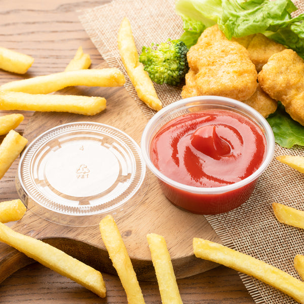 Serve your jello shots in our Chef 101 2-ounce Round Clear Plastic Portion Cups. Crafted from high-quality plastic, these condiment cups are microwave-safe for reheating leftover bite-sized samples. Designed with a crystal clear finish, these small sauce cups clearly display the colors of individual sauces for quick identification at your restaurant or food truck. These plastic serving cups are recyclable which allow you to dispose of them in an eco-friendly way. Pair these dressing cups with our lids to expertly contain dips and prevent leaks and spills during transport. These cups allow you to easily add toppings to delivery or take out orders. Great for keeping food safe, these sauce cups are built to be strong and sturdy. Measuring 2.5 inches in diameter by 1.25 inches in height, these condiment containers hold up to 2 ounces of toppings. Sold in a 2,000 count box. Lids (SKU: RWP0624C) are available and sold separately.