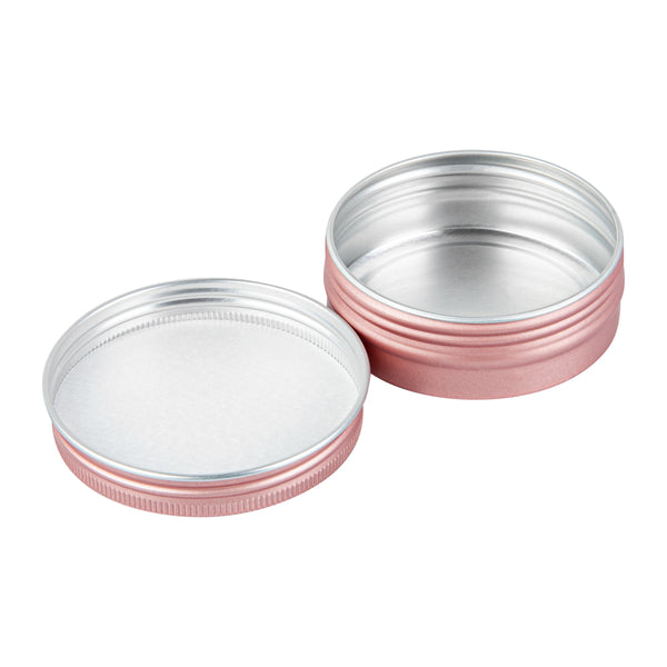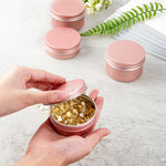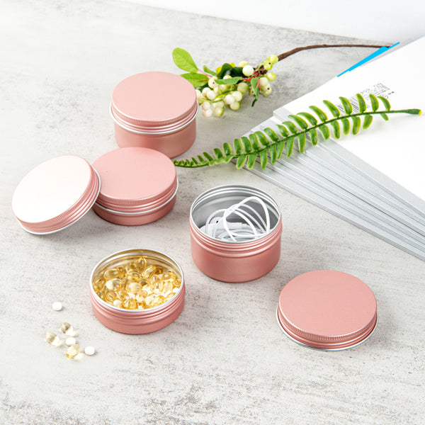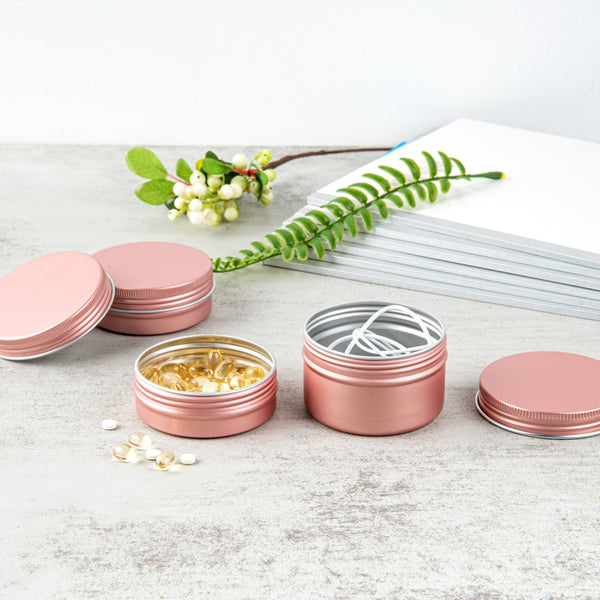 Store your sunscreen for travel using our Chef 101 2-ounce Round Rose Gold Tin Containers. Made from premium aluminum, these small containers with lids do not rust or break easily. These round metal storage containers come with screwable lids that fit tightly to the body of these boxes, avoiding leakage of the contents inside. These tiny storage containers do not take up much space in your closet or kitchen as they are slim and sleek in structure. The rose gold shade of these small storage boxes gives them an elegant appeal. Each of these round aluminum boxes for storage measures 2.75 inches in diameter by 1 inch in height and has a capacity of 2 ounces. Sold in a 10 count box.