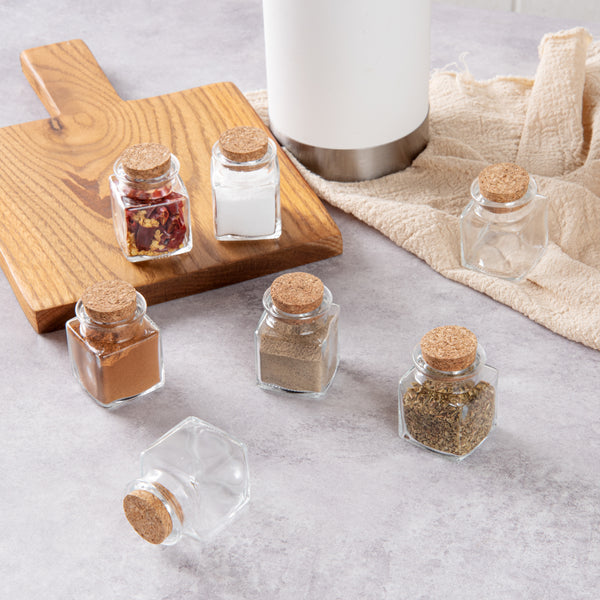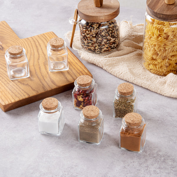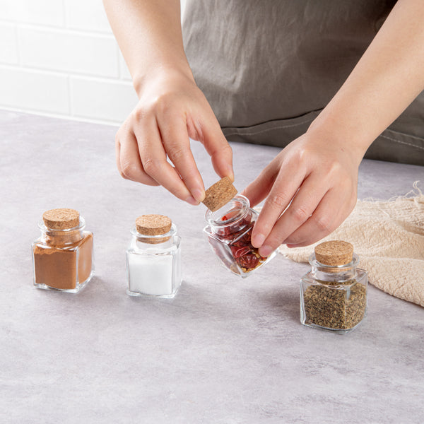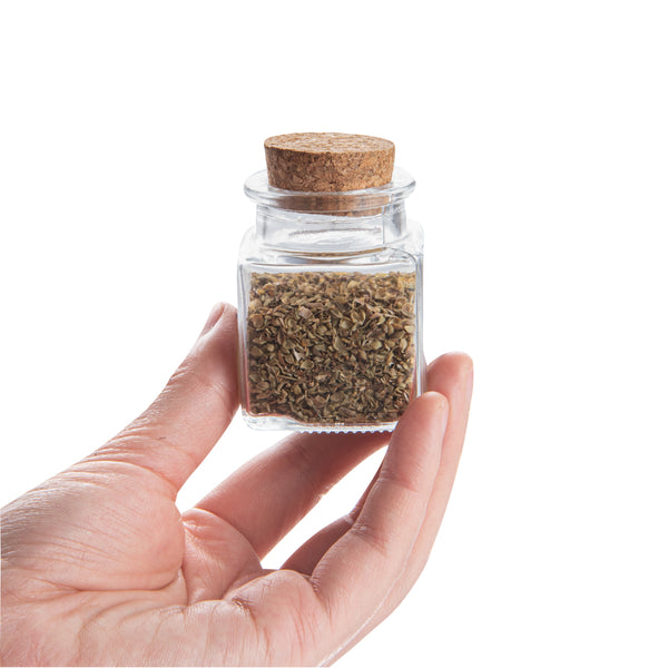 Attractively store herbs or other spices with our Chef 101 2-ounce Square Clear Glass Herb Storage Jars. These storage jars with lids are FDA-approved to safely store various hot or cold ingredients. Featuring a vintage and elegant cork lid, these glass storage containers fashionably elevate your storage area and provide secure sealing. With a unique square design, these glass food storage containers add a modern touch to your kitchen or supply stations. For simple cleaning, these glass herb jars are dishwasher-safe. These glass storage containers have a crystal-clear finish to provide a full view of contents inside for refilling when needed. These glass containers with lids have a 2-ounce capacity and measure 1.57 inches in length by 1.57 inches in width by 1.97 inches in height. Sold in a 10 count box.