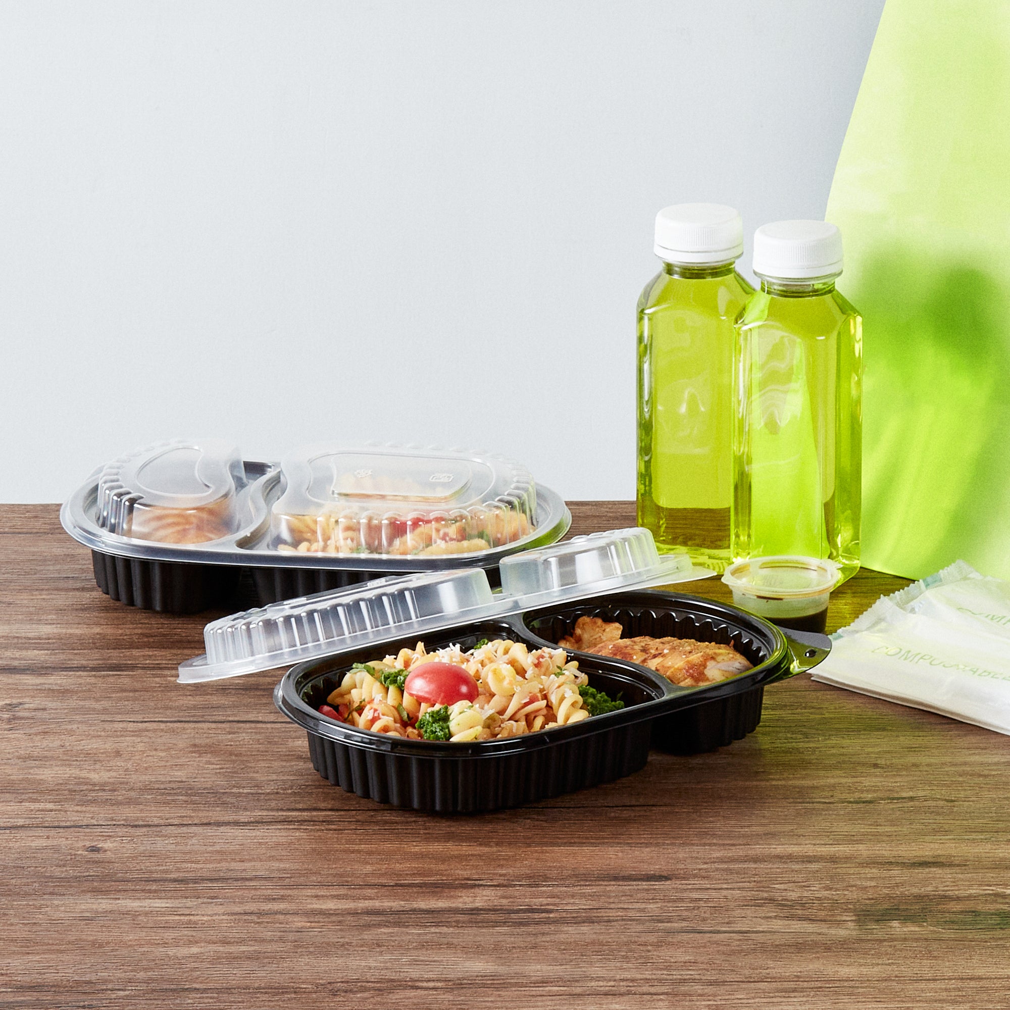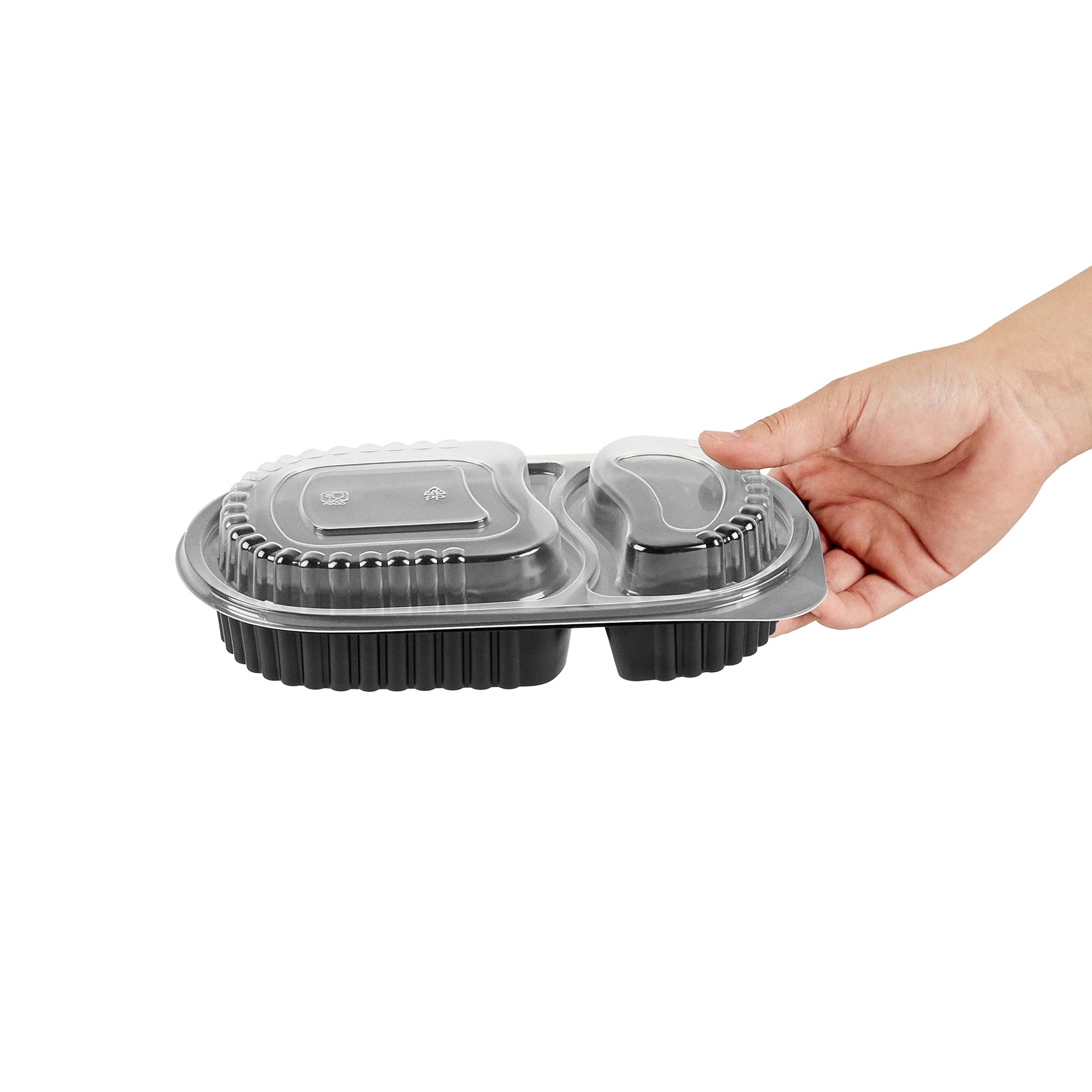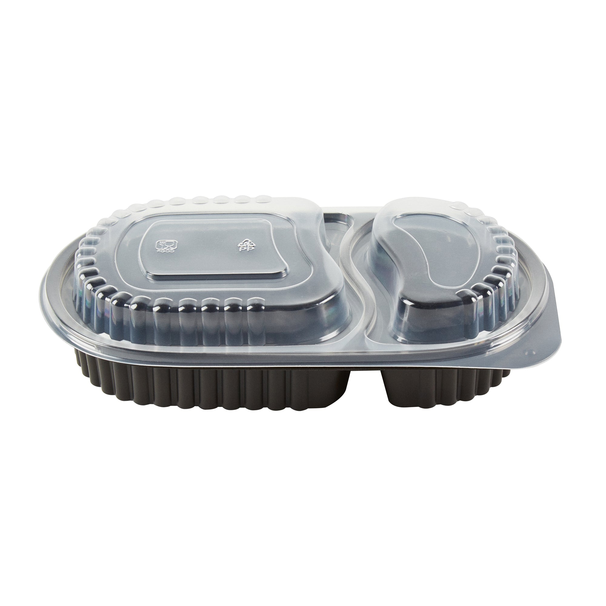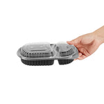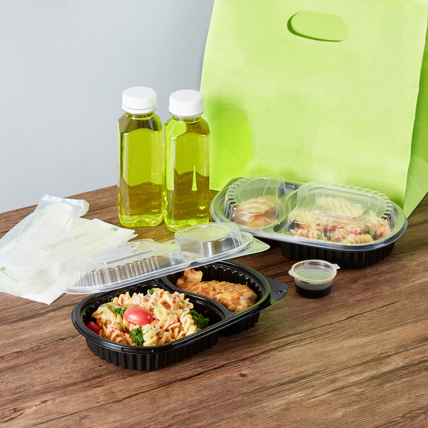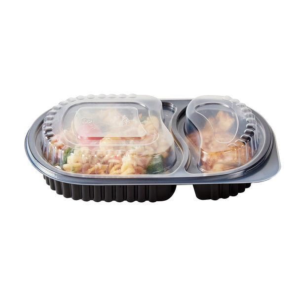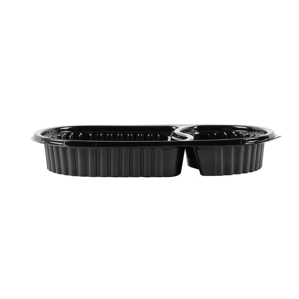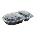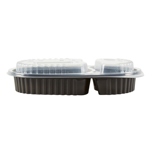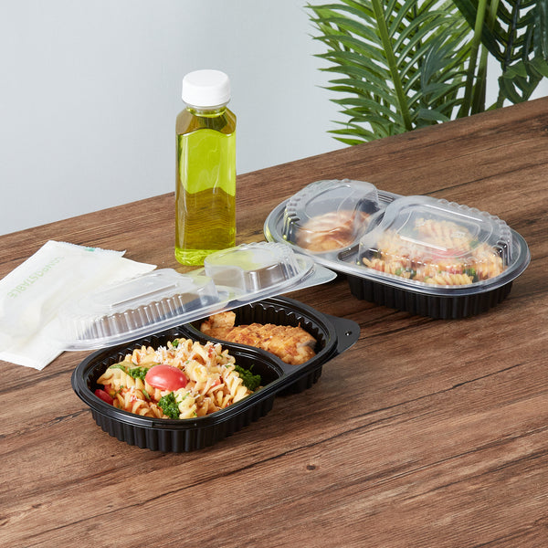 Elevate your foodservice with our Chef 101 20-ounce Oval Black Plastic Food Containers. These to go containers come with clear lids and create a secure deal to prevent spills in transit. The lids of these take out containers come with dome-shaped lids and provide ample space to accommodate extra toppings. These plastic food containers are microwave-safe and allow customers to reheat meals without changing utensils. Created from premium plastic, these carry out containers are suitable for holding hot and cold food items. The clear plastic lids of these food containers provide excellent visibility of contents for easy identification. These takeaway containers have a black finish and add a stylish touch to your takeaway orders. To facilitate easy leftover storage, these takeaway boxes are freezer-safe and allow you to refrigerate your food for later use. For eco-conscious foodservice establishments, these disposable food containers and lids are recyclable to minimize your carbon footprint. These plastic containers with lids are disposable and can be tossed after use, providing a straightforward cleaning experience. Measuring 9.25 inches in length by 6 inches in width by 2.25 inches in height, these food containers with lids have a capacity of 20 ounces. Sold in a 50 count box.