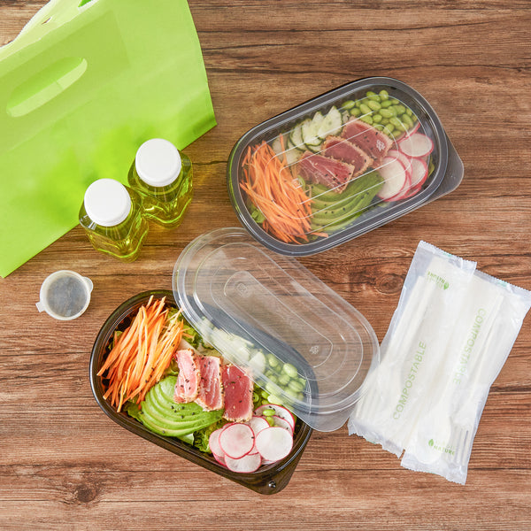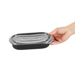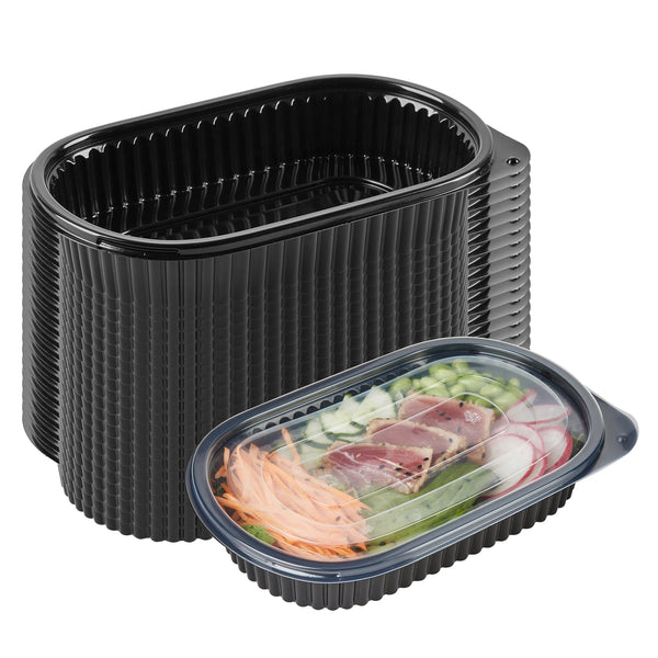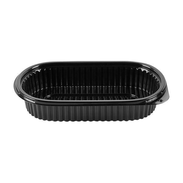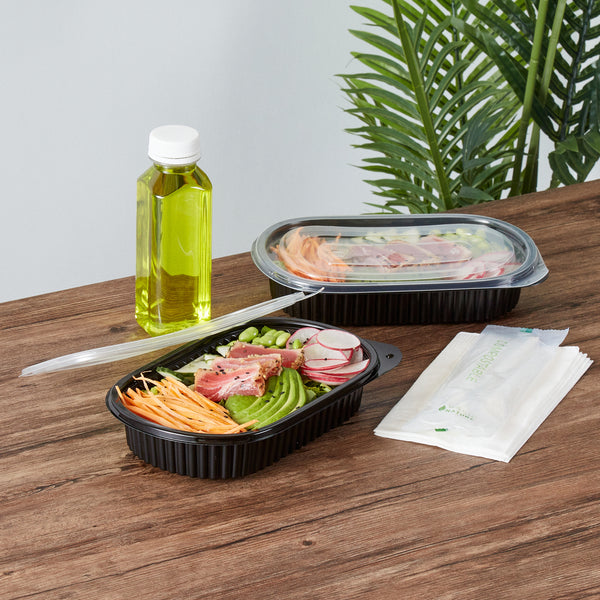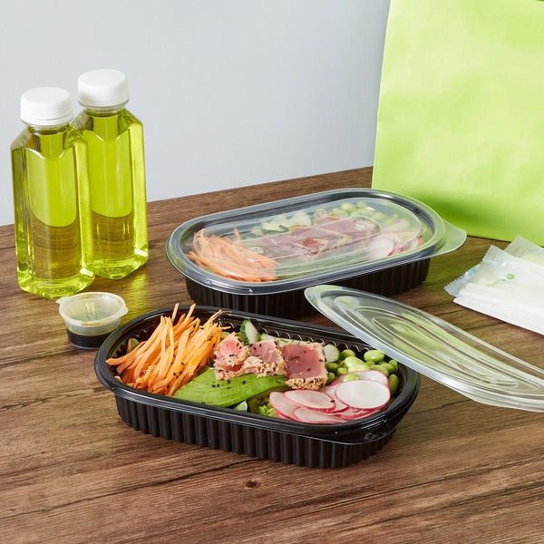 Discover convenience with our Chef 101 25-ounce Oval Black Plastic Food Containers. These take out containers come equipped with a clear plastic lid and form a secure seal, keeping your food intact in transit. The flat design of these plastic lids allows you to easily stack and store the containers, maximizing space efficiency and ensuring secure transport. These to go containers are microwave-safe and provide customers the convenience of reheating meals without changing utensils. Created from premium plastic, these carry out containers are suitable for holding hot and cold food items. For easy food display, these clear lids provide excellent sibility and showcase the contents inside. The sleek black finish of these takeaway containers adds a touch of sophistication to your meals. To store your leftovers, these food containers with lids are freezer-safe. Designed for eco-minded establishments, these plastic to go containers are recyclable and offer an eco-friendly way to pack meals. These plastic food containers can be discarded after use and ensure a straightforward cleaning experience. With a capacity of 25 ounces, these plastic containers with lids measure 9.25 inches in length by 6 inches in width by 1.75 inches in height. Sold in a 50 count box.