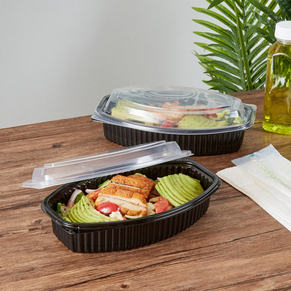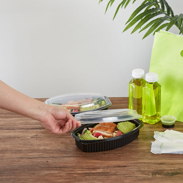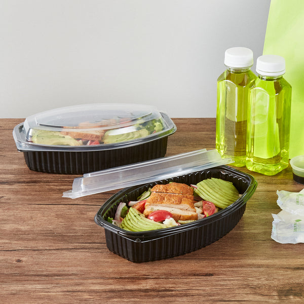 Boost your foodservice efficiency with our Chef 101 28-ounce Oval Black Plastic Food Containers. These plastic food containers include a secure clear plastic lid that seals tightly to prevent spills during transit. The flat design of these plastic lids makes stacking and storing the containers easy, maximizing space efficiency and ensuring secure transport. Designed for convenience, these take out containers are microwave-safe, allowing customers to reheat meals without the need for additional utensils. Created from premium plastic, these to go containers are suitable for holding hot and cold food items. These clear lids showcase the delicious contents inside, making them highly attractive to customers. The sleek black finish of these carry out containers adds a touch of sophistication to your takeaway meals, enhancing presentation. To store your leftovers, these disposable food containers are freezer-safe and let you refrigerate your food for later use. Perfect for eco-conscious establishments, these to go boxes are recyclable, providing an environmentally-friendly way to serve food. These plastic containers with lids are disposable and can be tossed after use, facilitating an easy cleanup. With a capacity of 28 ounces, these food containers with lids measure 9.25 inches in length by 5.75 inches in width by 2.75 inches in height. Sold in a 100 count box.