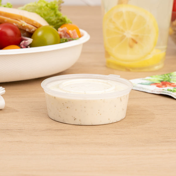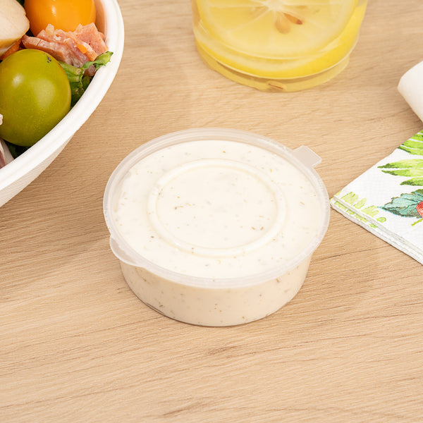Serve customers' dressings and sauces using our Chef 101 3-ounce Clear Plastic Portion Cups. Perfect for all kinds of foodservice establishments, these portion cups with lids are made with sturdy recyclable plastic to dispose of cups in a way that doesn’t harm the Earth. These 3-ounce portion cups feature a hinged lid that provides a simple and secure way to lock in sauces to prevent messy spills while on the go. The microwavable construction of these plastic ketchup cups makes it easy for employees to warm up condiments. These portion cups with lids have a clear finish to provide customers with a sneak peek of their desired toppings. To store these 3-ounce portion cups, simply stack them together for space-saving storage. These plastic ketchup cups can hold up to 3 ounces of your preferred sauces. These portion cups with lids measure 2.75 inches in diameter and 1.5 inches in height. Sold in a 100 count box.