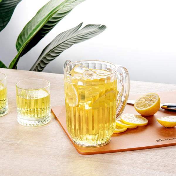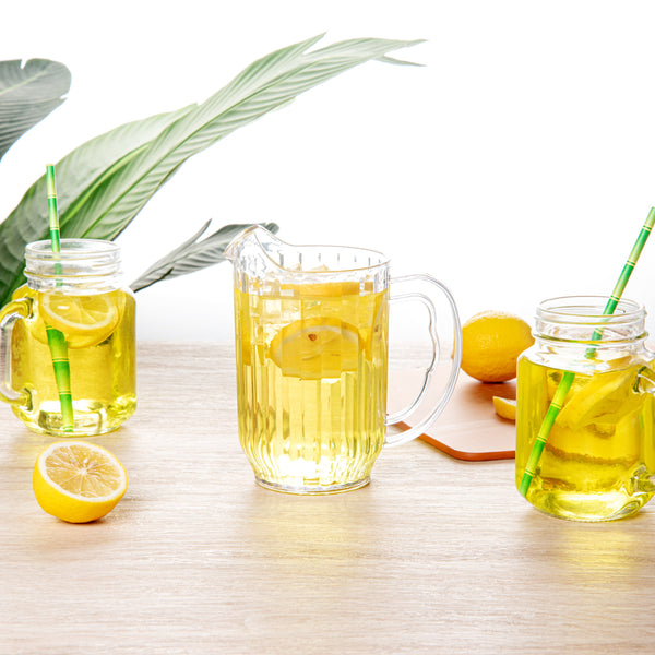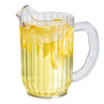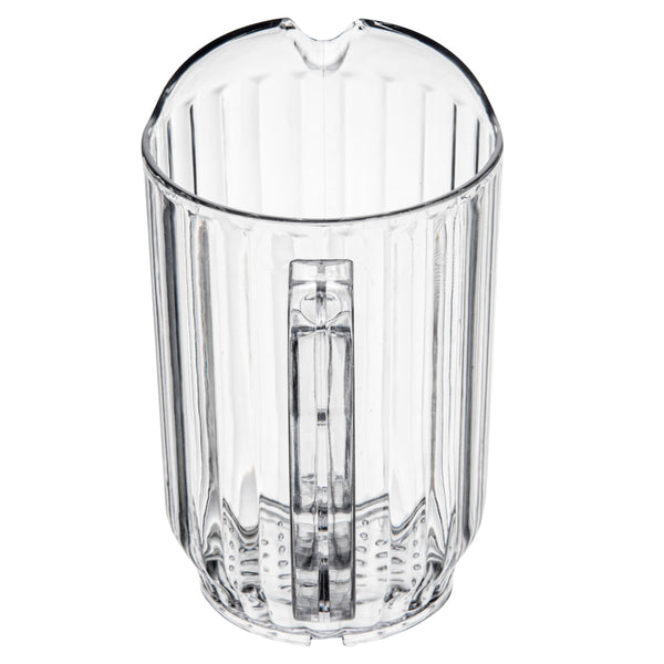 Easily pour water, soda, iced tea and other beverages with this Chef 101 32-ounce Clear Plastic Water Pitcher. Featuring a deeply contoured lip, this clear plastic pitcher makes it simple to pour beverages without having to worry about ice cubes creating splashes or messes. Its ergonomic handle is designed with specially molded details that make it easy to grip, while its lightweight plastic construction makes it comfortable to carry. With a capacity of 32 fluid ounces, this small plastic pitcher can be used to serve up to four glasses of any cold beverage of your choosing. Whether you use it as a plastic beer pitcher or water pitcher, your beverages will look great behind the crystal clear finish and classic ribbed design. Measuring 4.13 inches in diameter by 6.73 inches in height, this durable 32-ounce plastic pitcher is designed to withstand daily use in restaurants, bars, and other foodservice establishments. Sold in a 1 count box.