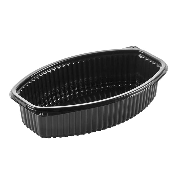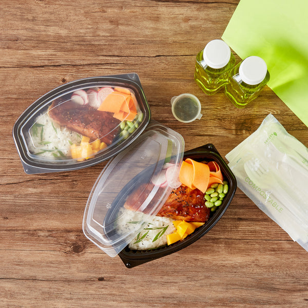 Enhance your food delivery experience with our Chef 101 32-ounce Oval Black Plastic Food Containers. These plastic food containers come with clear lids and form a tight seal, preventing spills and keeping your food intact in transit. With a flat design, these clear plastic lids allow for easy stacking and storage, maximizing space efficiency and ensuring secure transport. These to go containers are microwave-safe, offering customers the convenience of reheating their meals without needing to transfer them to another dish. Crafted from premium plastic, these take out containers are suitable for holding hot and cold food items. With transparent lids, these take out food containers showcase the delicious contents inside, making them visually appealing. The sleek black finish of these carry out containers adds a touch of sophistication to any meal presentation. Ideal for storing your leftovers, these disposable food containers are freezer-safe and allow you to refrigerate your food for later use. For eco-conscious establishments, these to go boxes are recyclable and help minimize your carbon footprint. These plastic containers with lids are disposable and can be discarded after use, facilitating an easy cleanup. Measuring 9.25 inches in length by 5.75 inches in width by 3 inches in height, these food containers with lids have a capacity of 32 ounces and offer ample space for a variety of dishes. Sold in a 100 count box.
