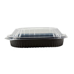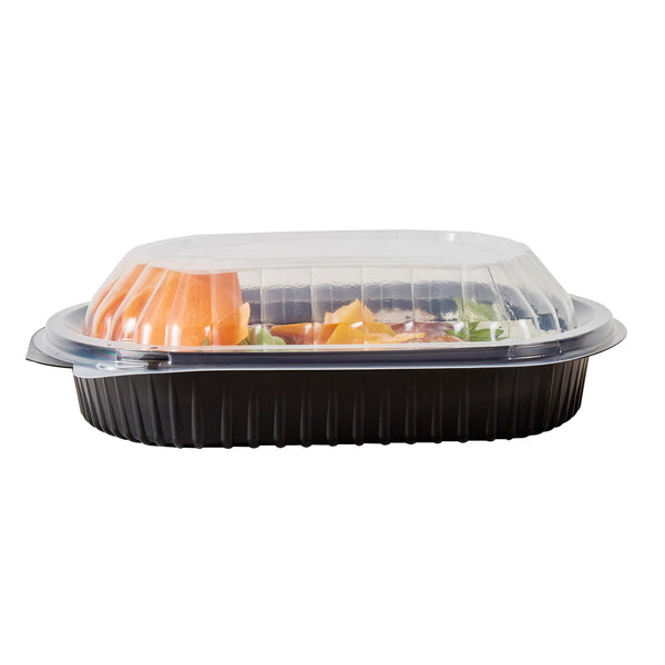 Elevate your food packaging with our Chef 101 34-ounce Oval Black Plastic Food Containers. These plastic food containers come with a clear plastic lid and form a secure seal to prevent spills, keeping your food intact in transit. Designed to be microwave-safe, these to go containers offer customers the convenience of reheating meals without the need to transfer to another dish. The clear lids of these take out containers provide excellent visibility for easy content identification. These carry out containers feature a black finish, adding a touch of sophistication to any takeaway meal. Ideal for leftover storage, these plastic containers with lids are freezer-safe and let you refrigerate your food for later use. For eco-conscious foodservice establishments, these takeaway containers are recyclable and help minimize your carbon footprint. These food containers with lids are disposable and can be discarded after use, facilitating an easy cleanup. Measuring 9.5 inches in length by 8 inches in width by 2.75 inches in height, these take out boxes have a capacity of 34 ounces making them perfect for a variety of dishes. Sold in a 50 count box.